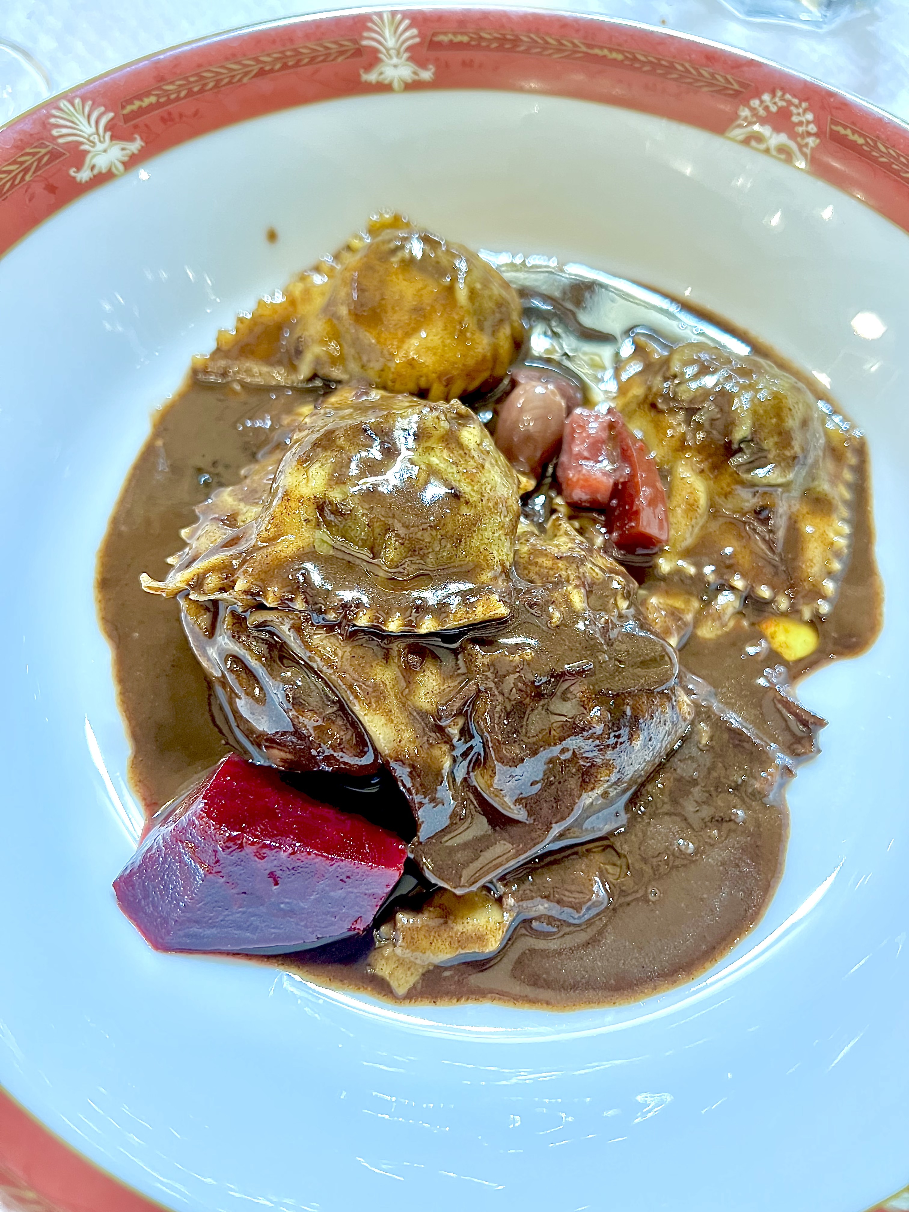 Les gros Raviolis de Daube à la Monégasque sont telles de savoureuses bouchées herbacées à la fine pâte, en concentré d’une daube familiale à l’enjôleuse sauce. La betterave vient intelligemment dynamiser, de sa douce verve, les papilles.