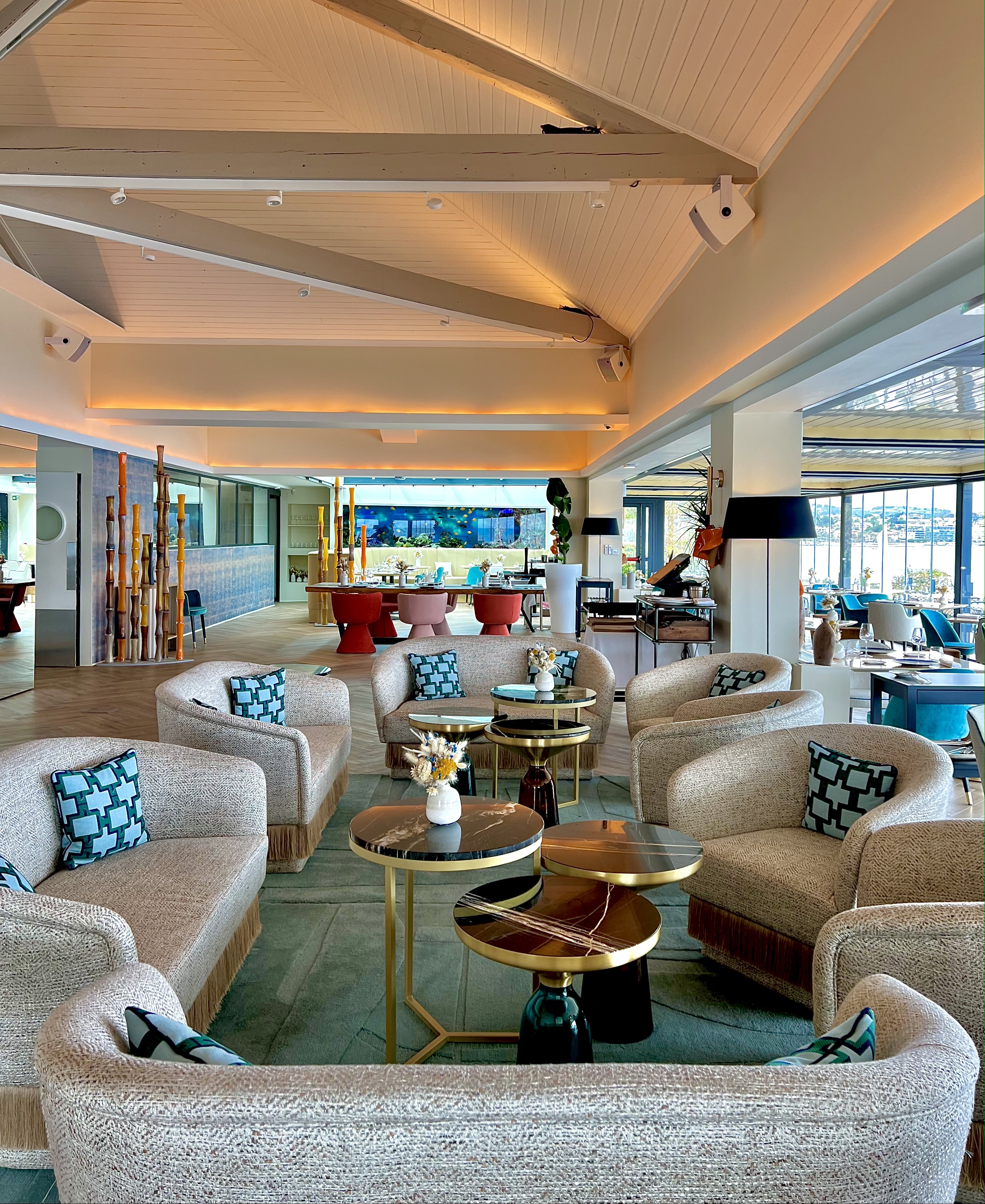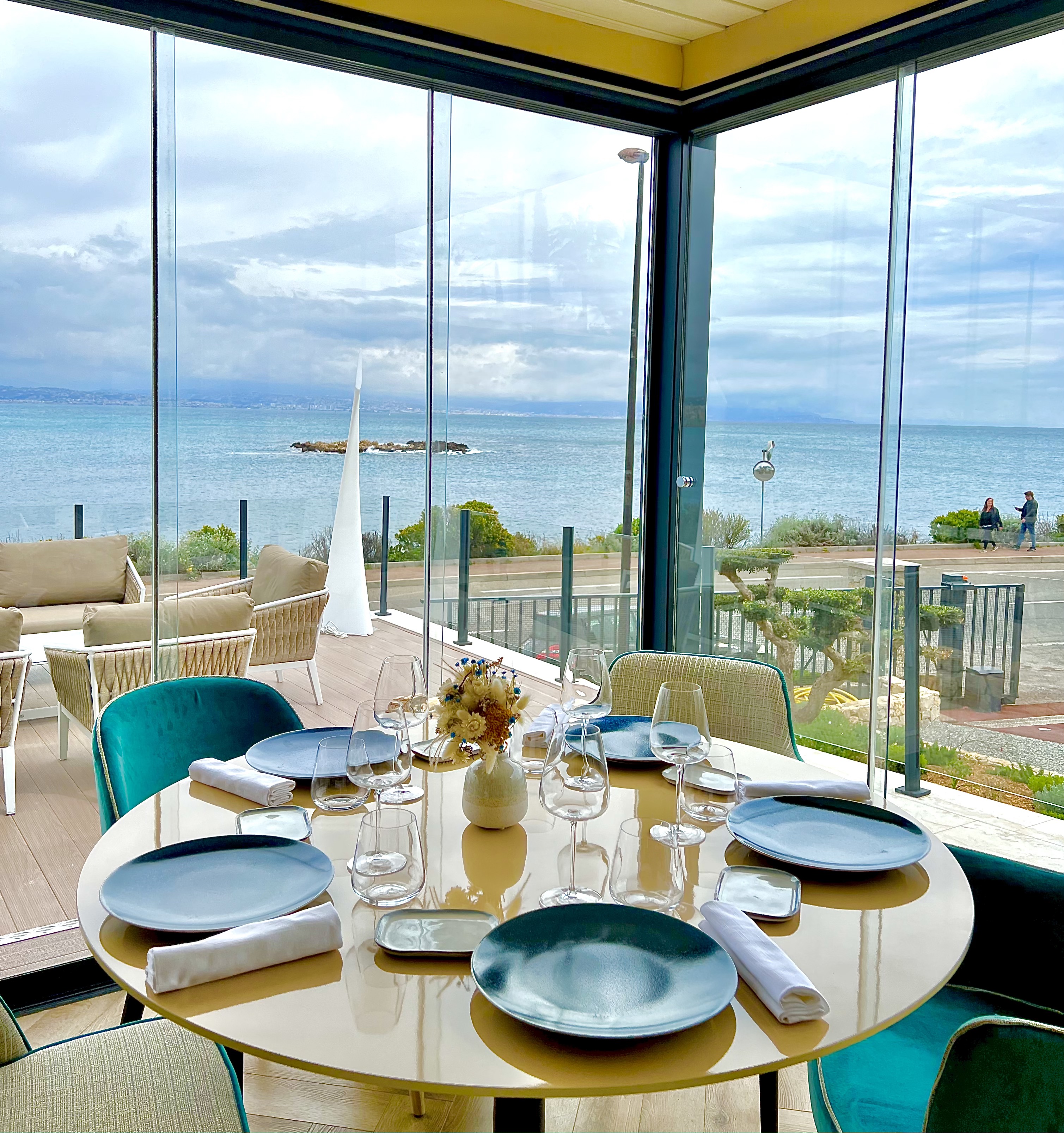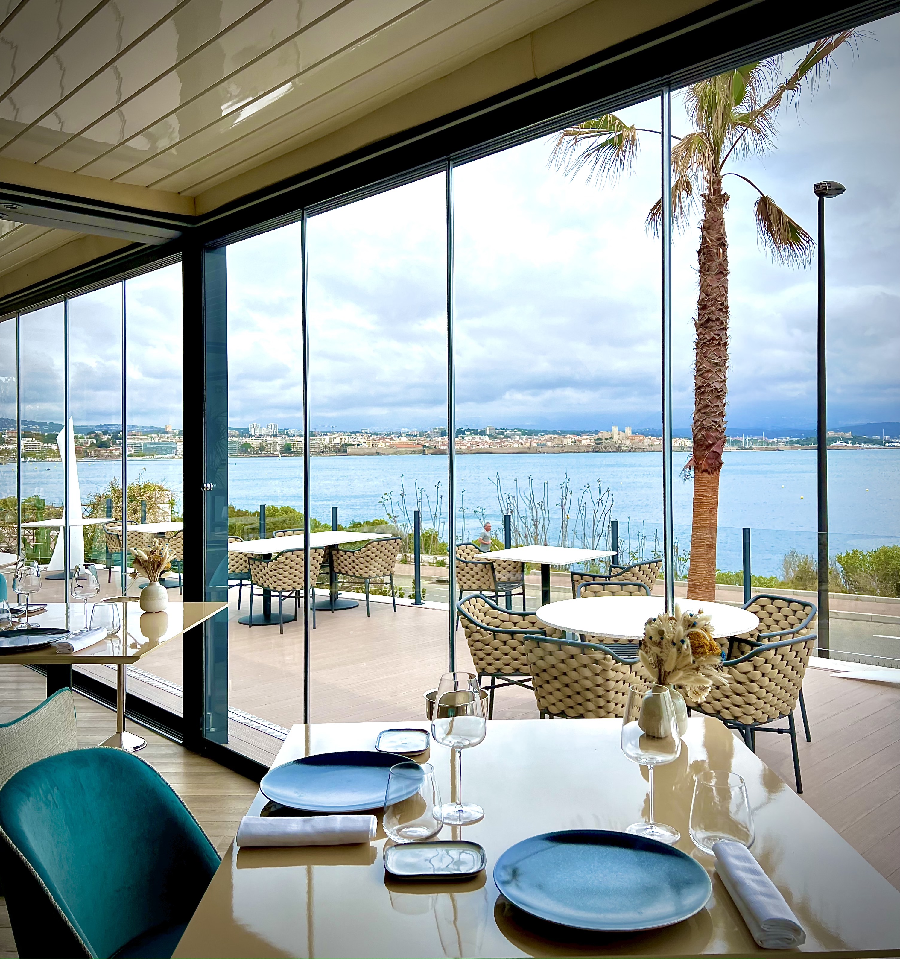La salle, entièrement réaménagée dans une vision claire et dynamique, laisse entrer la lumière à l’infini d’un fabuleux panorama en triptyque de la Méditerranée, du Vieil Antibes et du massif du Mercantour. La superbe cave à vin, située au centre, délimite en transparence de ses superbes flacons l’espace restauration du nouveau bar-lounge, idéal pour découvrir « La Maison », dans une version chic et conviviale autour d’un apéritif ou d’un cocktail accompagné de savoureux « En K » à partager. La vaste terrasse, tel un loft en plein ciel, vous offre la possibilité de vibrer au plus près des embruns et du ressac, à l’ombre d’une pergola contemporaine et modulable. La table de partage, sculptée dans la masse et rehaussée d’un lustre nuage aux pampilles miroir virevoltantes tel un banc de poissons en villégiature, vous fait vivre, devant les cuisines désormais ouvertes d’une baie vitrée, toute l’activité du chef et de sa brigade.