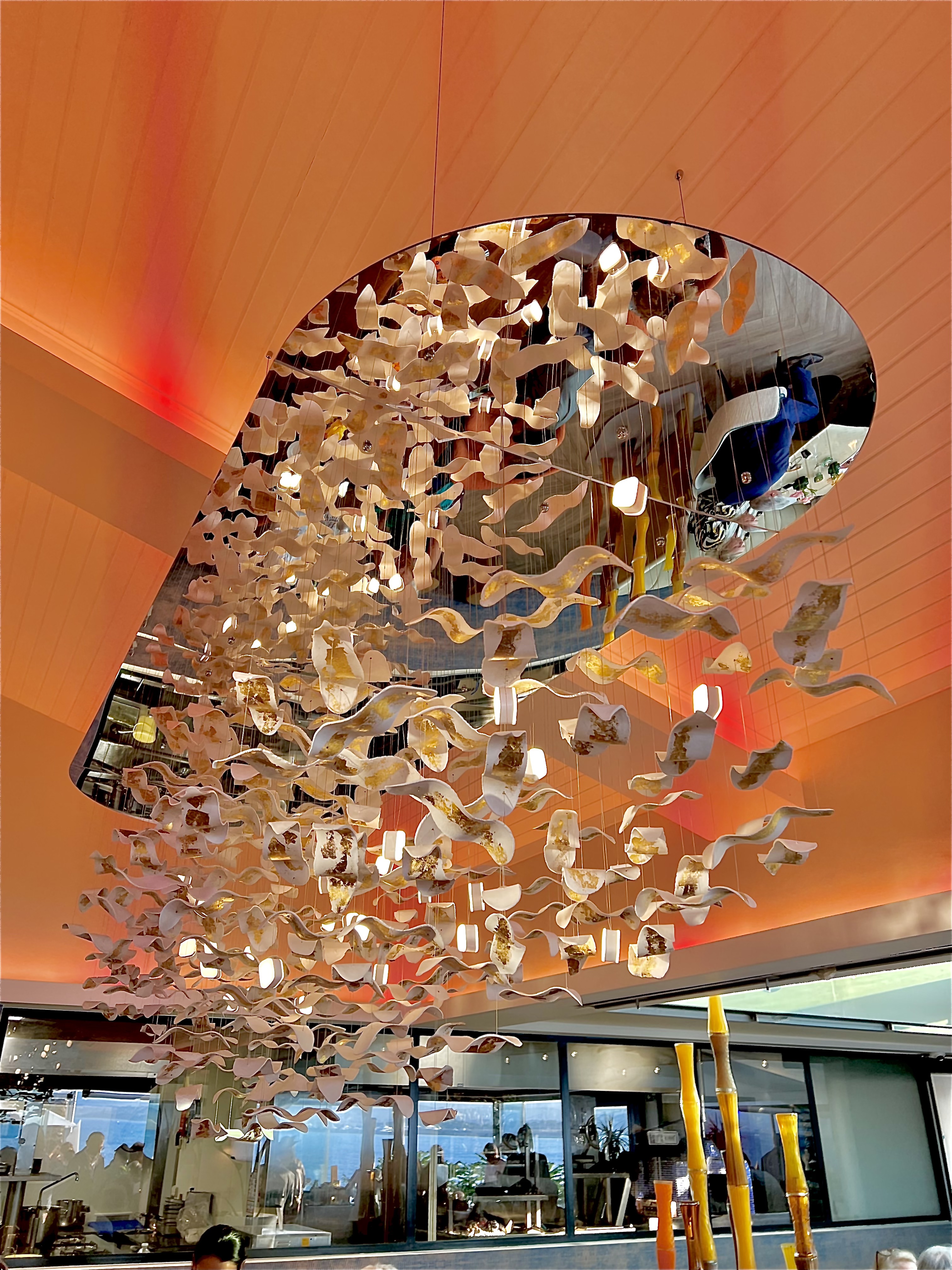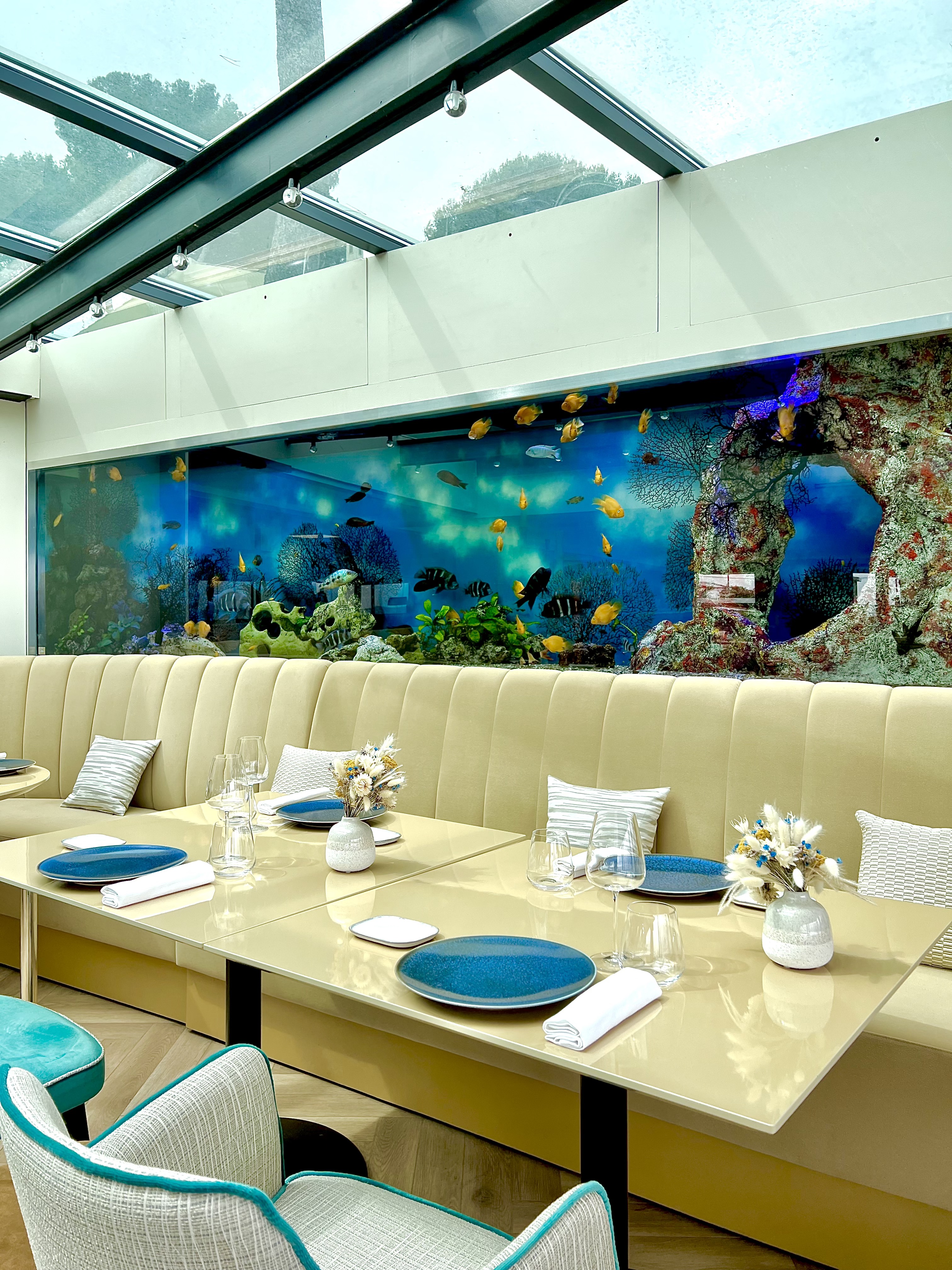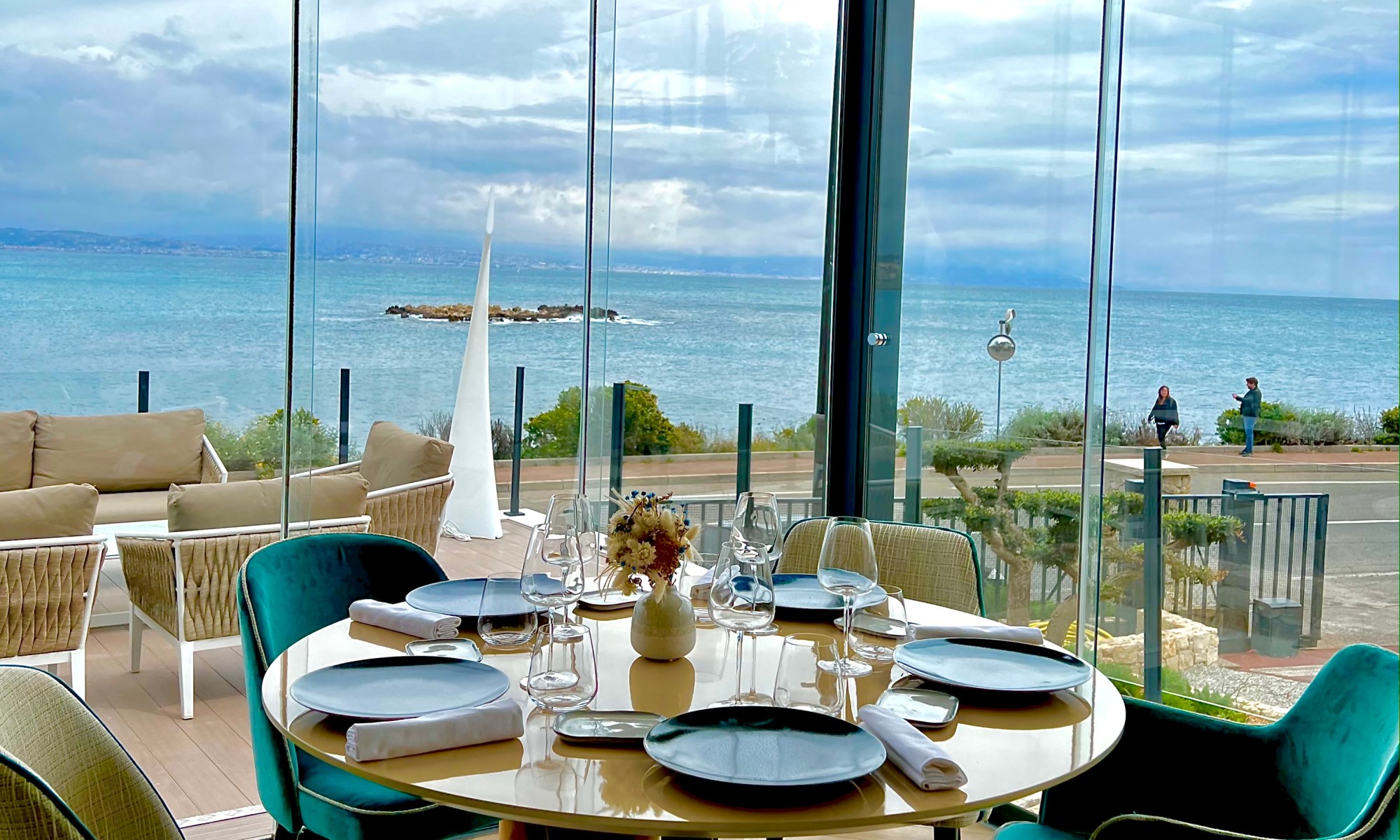La salle, entièrement réaménagée dans une vision claire et dynamique, laisse entrer la lumière à l’infini d’un fabuleux panorama en triptyque de la Méditerranée, du Vieil Antibes et du massif du Mercantour. La superbe cave à vin, située au centre, délimite en transparence de ses superbes flacons l’espace restauration du nouveau bar-lounge, idéal pour découvrir « La Maison », dans une version chic et conviviale autour d’un apéritif ou d’un cocktail accompagné de savoureux « En K » à partager. La vaste terrasse, tel un loft en plein ciel, vous offre la possibilité de vibrer au plus près des embruns et du ressac, à l’ombre d’une pergola contemporaine et modulable. La table de partage, sculptée dans la masse et rehaussée d’un lustre nuage aux pampilles miroir virevoltantes tel un banc de poissons en villégiature, vous fait vivre, devant les cuisines désormais ouvertes d’une baie vitrée, toute l’activité du chef et de sa brigade.