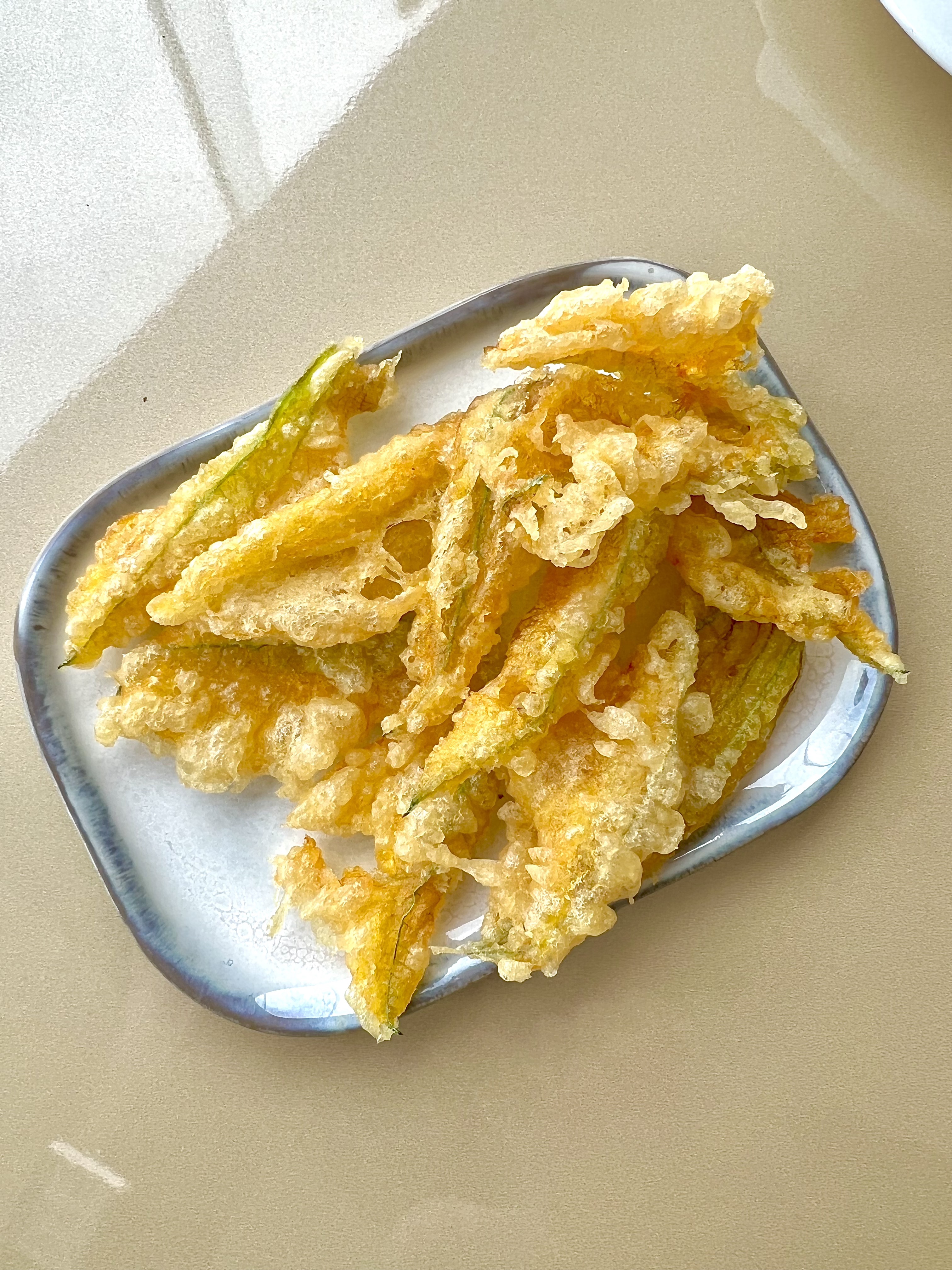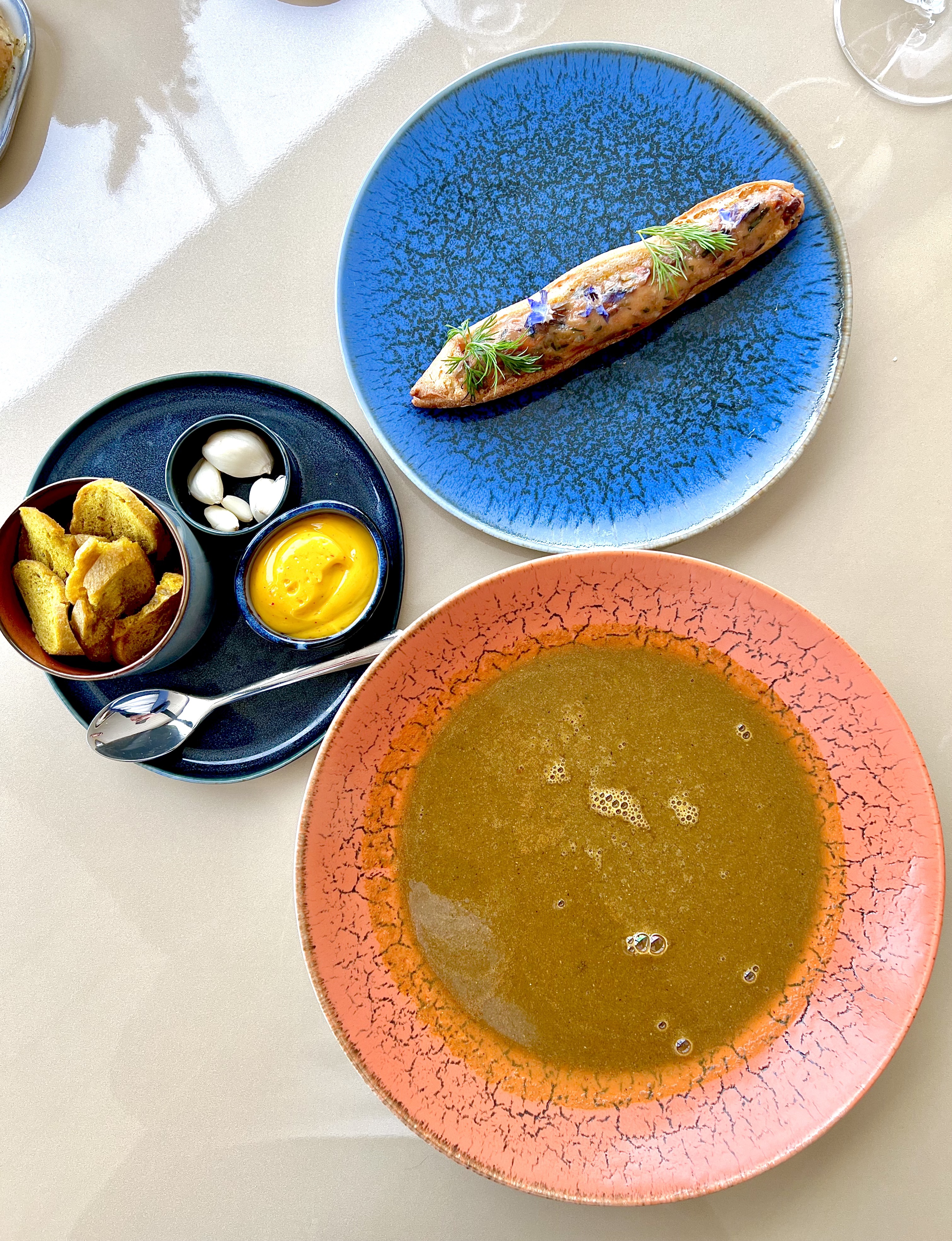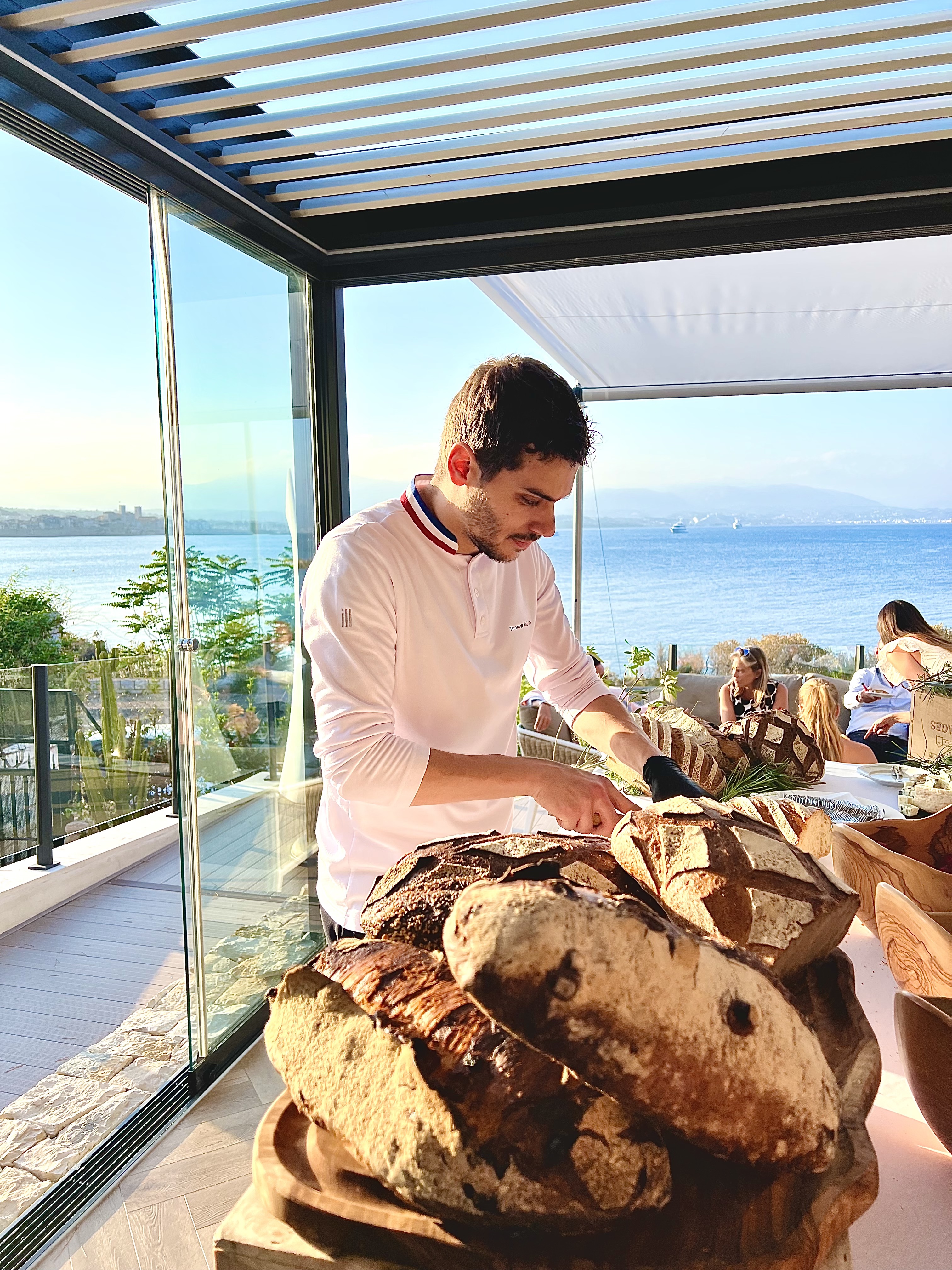 Merveilleusement installé face à cette incomparable vue d’une mer sans fin, vous voilà scrutant et balayant à la manière d’une vigie le moindre mouvement d’un voilier, d’un yacht et peut-être dans l’espoir de voir une famille de dauphins jouant et surfant au gré des vagues et du vent. On vous éveille alors avec délicatesse de votre « mission » en vous apportant une tiède et moelleuse foccacia accompagnée d’une émulsion d’olive et citron vert, ainsi que des fleurs de courgette en croustille légère à la belle saveur.