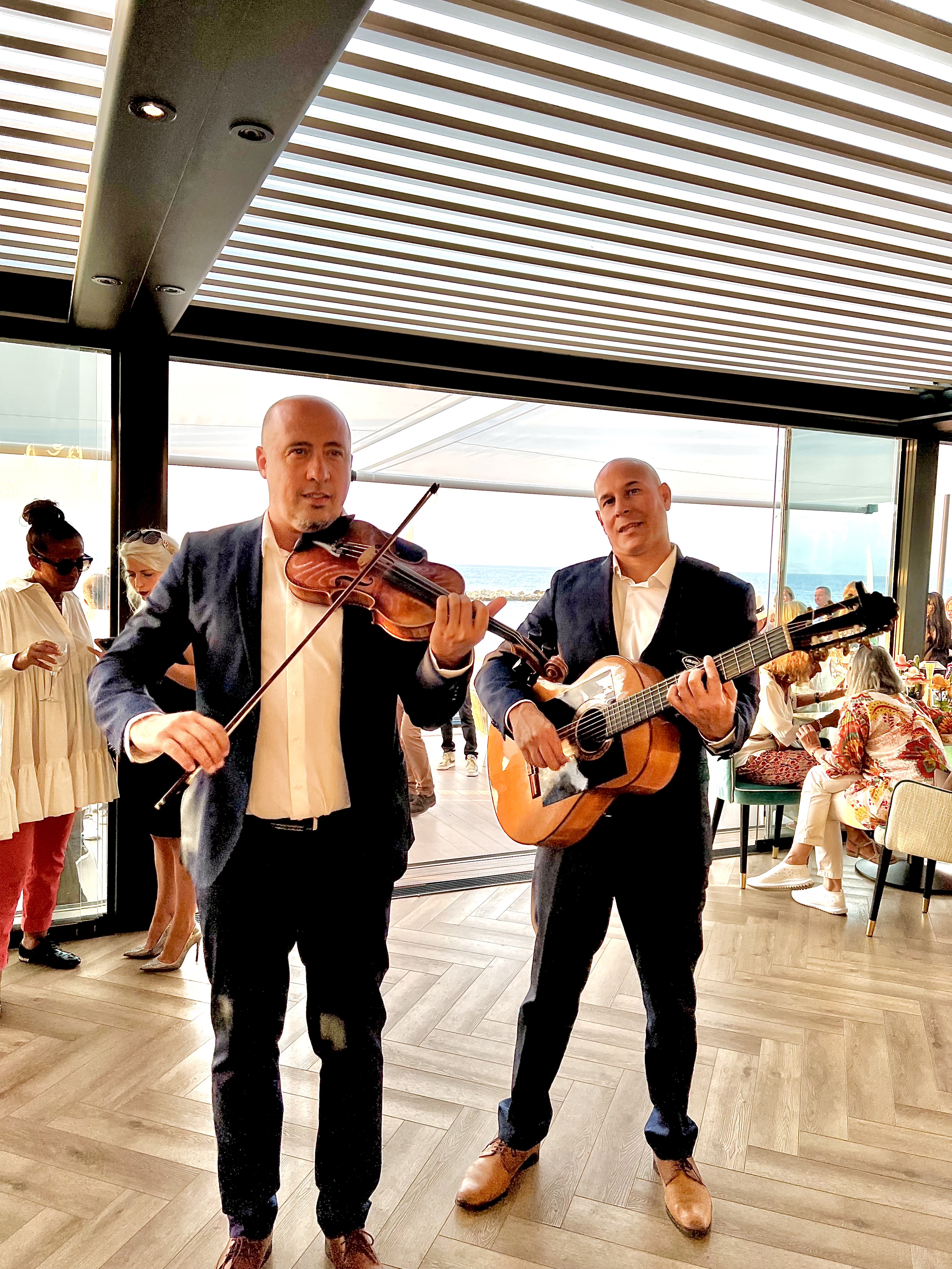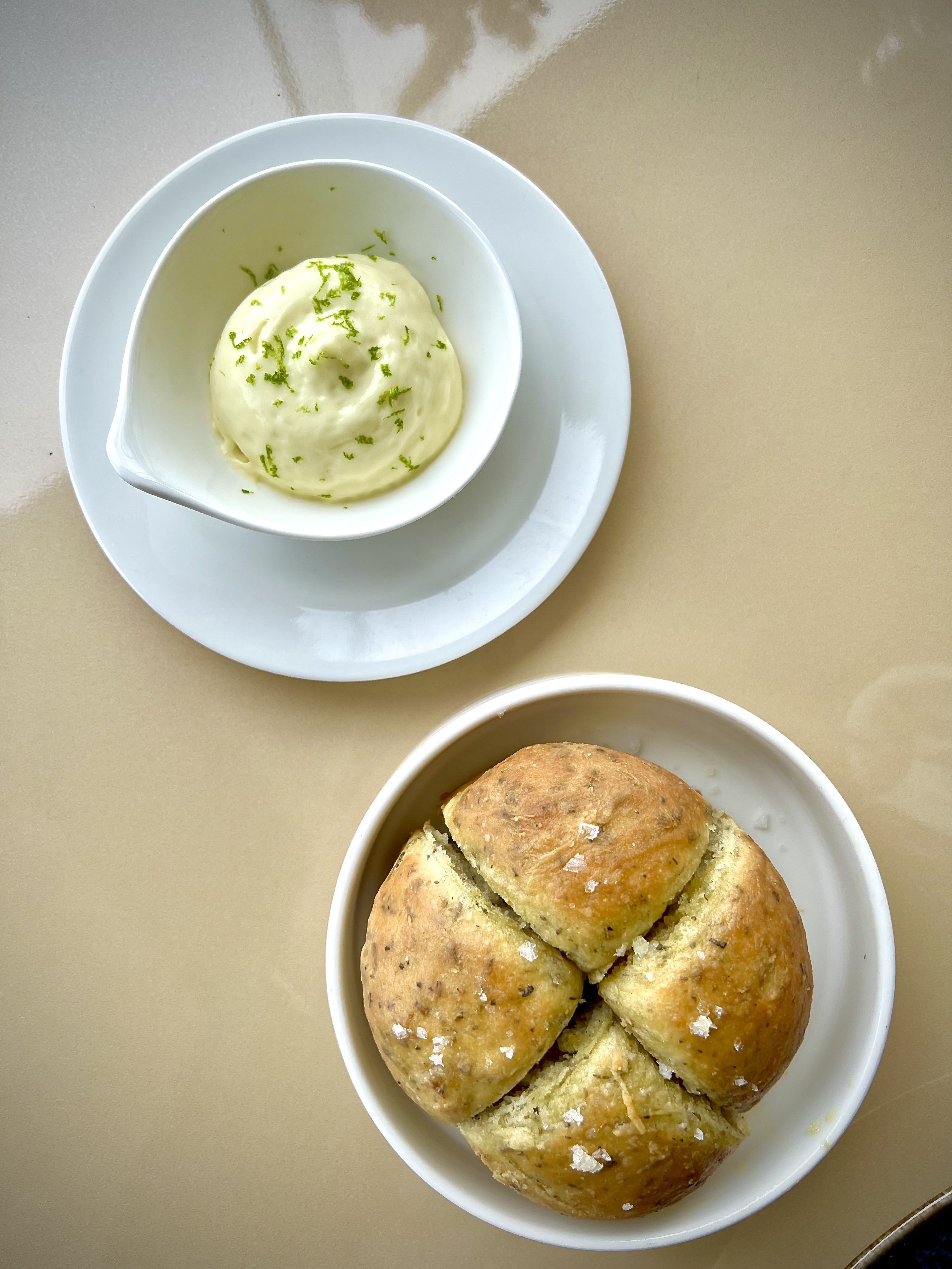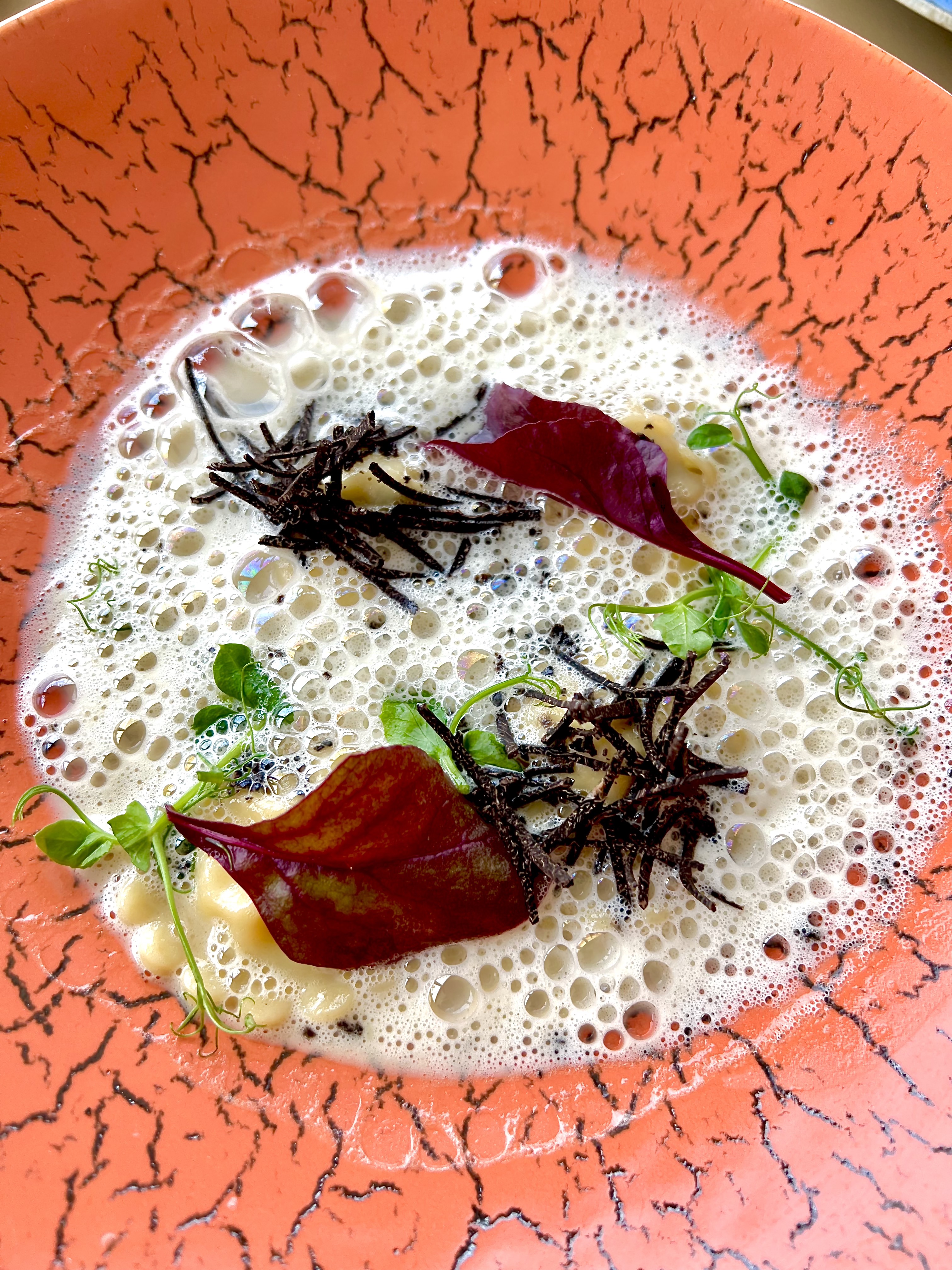 Merveilleusement installé face à cette incomparable vue d’une mer sans fin, vous voilà scrutant et balayant à la manière d’une vigie le moindre mouvement d’un voilier, d’un yacht et peut-être dans l’espoir de voir une famille de dauphins jouant et surfant au gré des vagues et du vent. On vous éveille alors avec délicatesse de votre « mission » en vous apportant une tiède et moelleuse foccacia accompagnée d’une émulsion d’olive et citron vert, ainsi que des fleurs de courgette en croustille légère à la belle saveur.