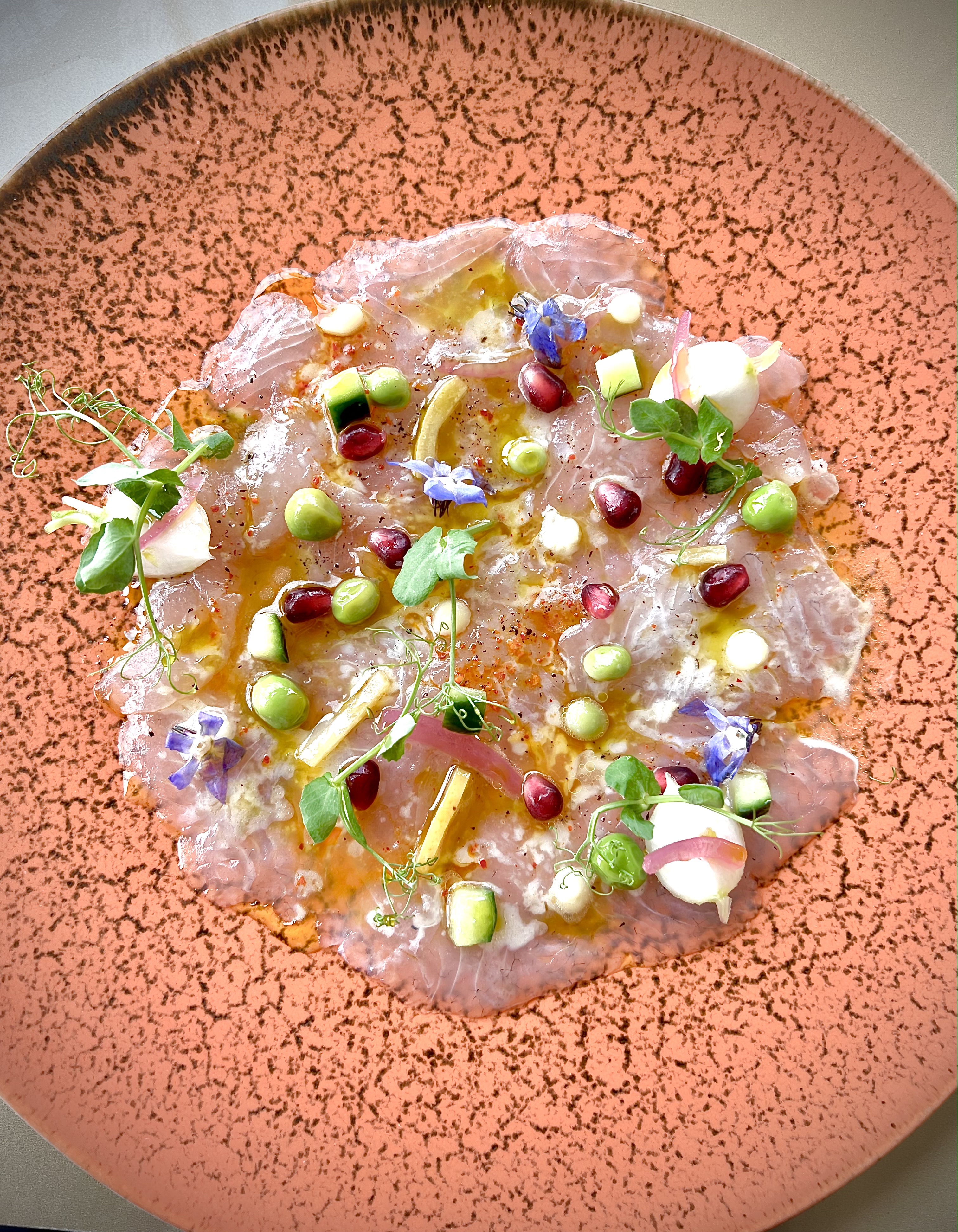 Carpaccio de la pêche du jour mariné minute, condiments citron de pays et grenade : la daurade juste pêchée est d’une incroyable vivacité, la découpe en transparence de sa chair garde de la mâche. Les petits pois à cru, les radis, le concombre en croque et la grenade qui claque, cadencent et apportent une pimpante dynamique printanière.