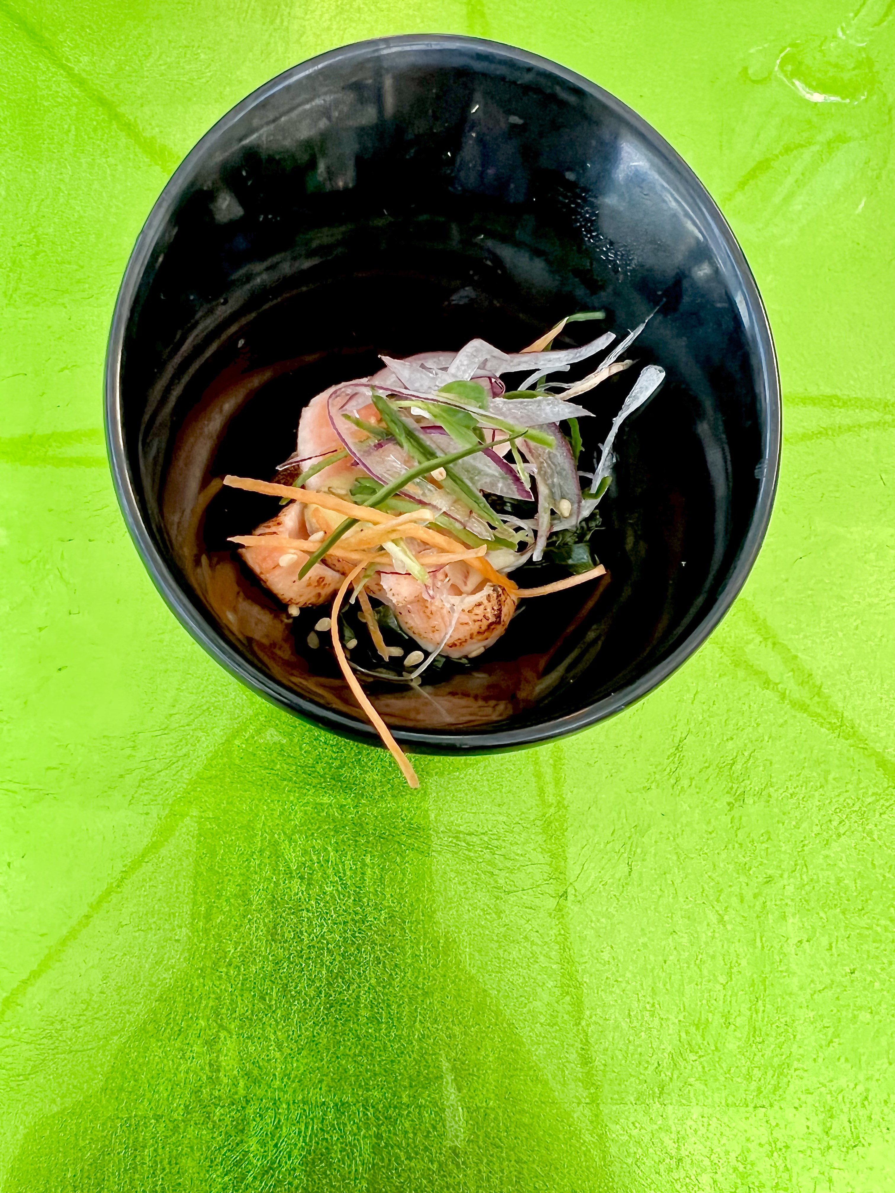 Le Ebi Shinjo est une petite boulette de crevette en double texture entre moelleux et fondant d’un coeur en croustille, qui nage de bonheur dans un bouillon dashi (algues Konbu) cristallin et herbacé des aromatiques du jardin.