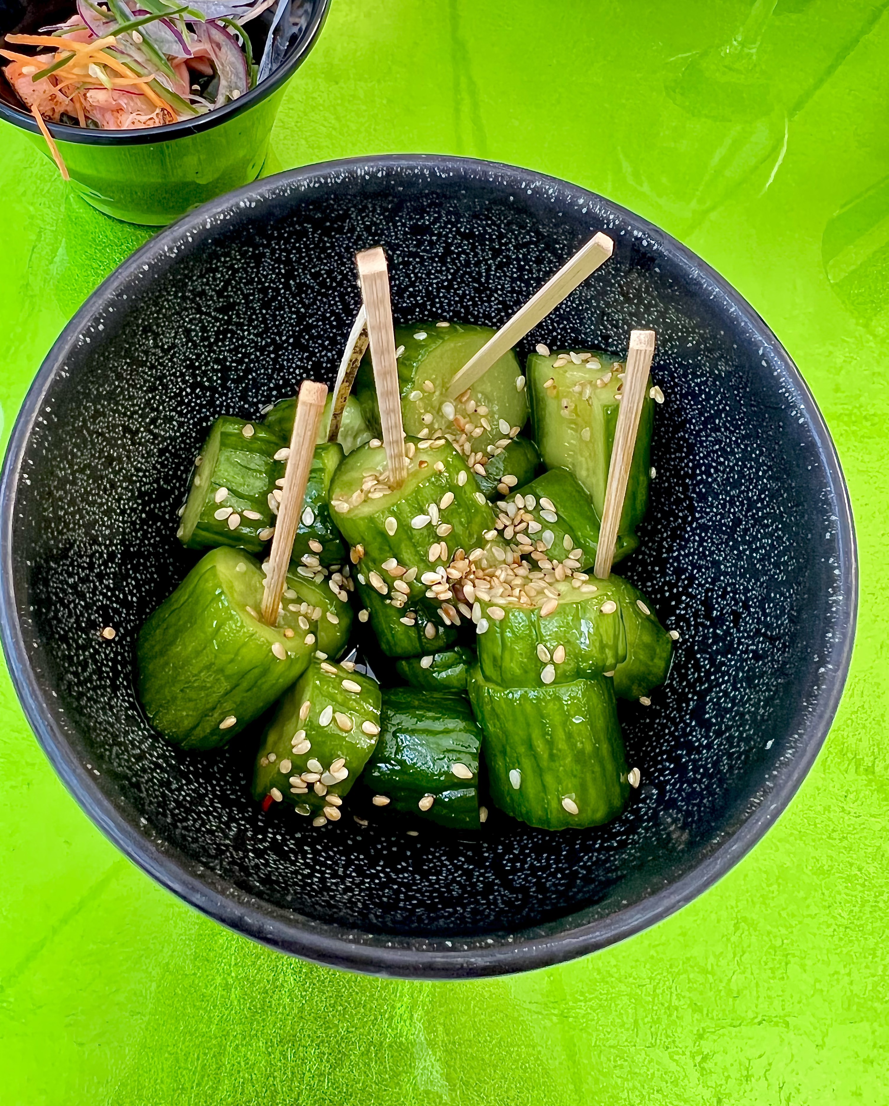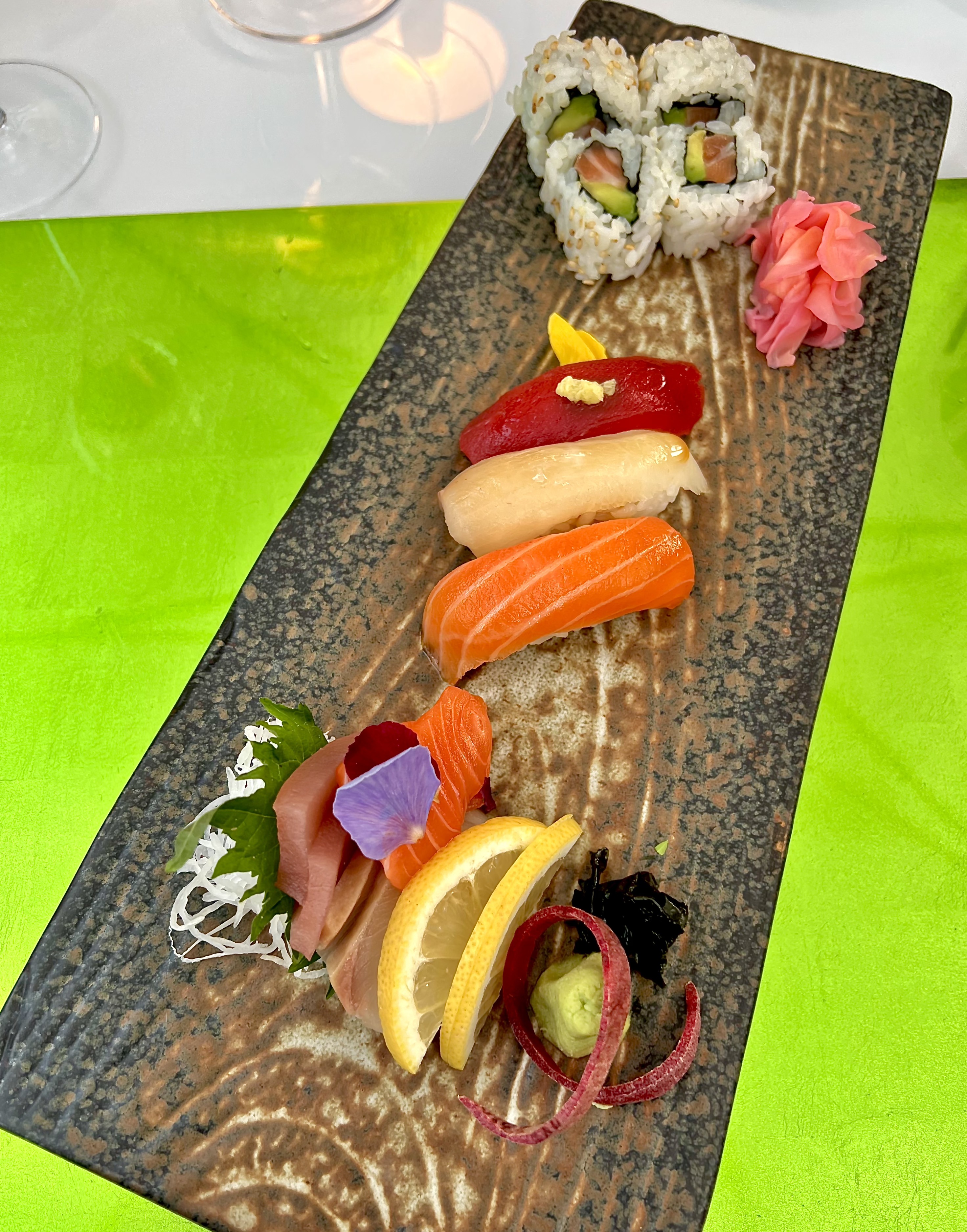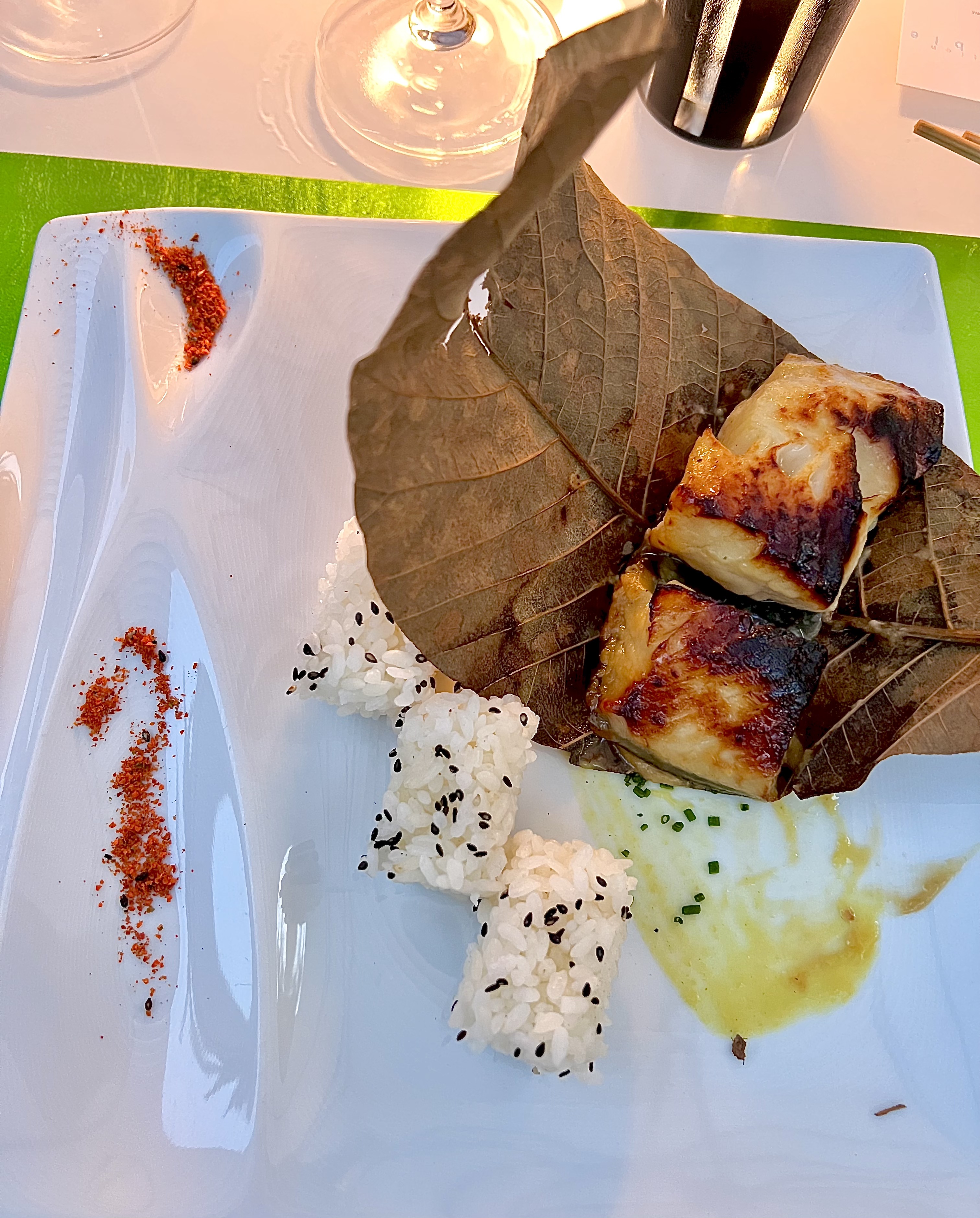 Pour débuter, un cocktail créatif au saké accompagné des traditionnels Edamame, ces petites fèves de soja vertes qui se consomment avec aisance et sans pudeur à l’apéritif, vous voilà agréablement lové dans des fauteuils damier sous une cascade de glycines, et vous vous délectez de cette parenthèse de douceur qui se vit dans cet oasis de verdure à deux pas de la trépidante Place du Casino.