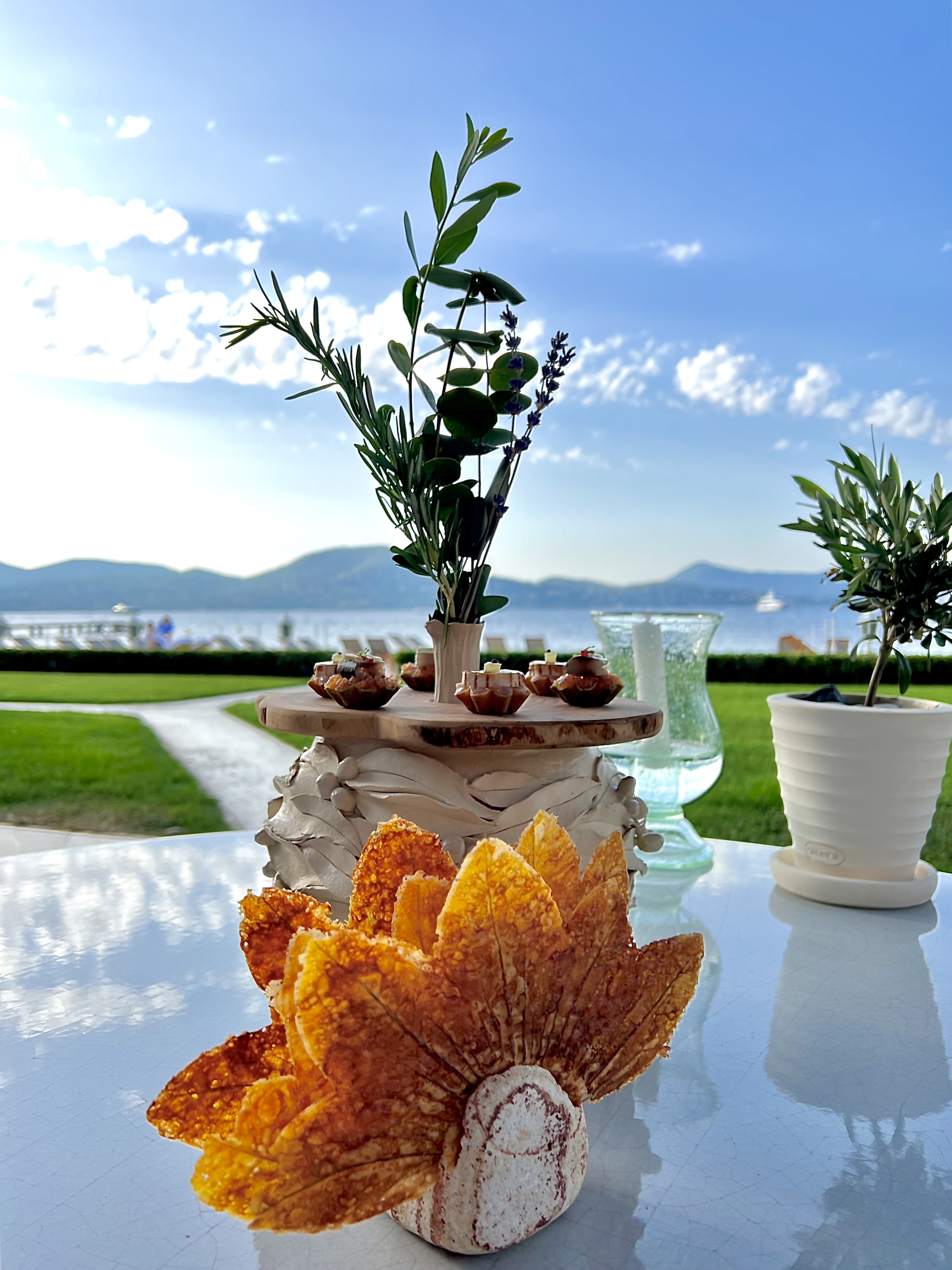 C’est presque les pieds dans l’eau ou le sable fin, face à l’inestimable Golfe de Saint-Tropez qui se rougit d’émotion d’un superbe coucher de soleil, que tout commence. Les amuse-bouches, servis sur la terrasse préservée, bien loin de la clameur populaire et tonitruante du plus mythique des villages, ont l’allure végétale d’un olivier pétrifié et se révèlent d’une déferlante puissance marine en pureté : croustillant d’Espadon snacké caramel de poisson et confiture d’algues, sardine artichaut condiment huile d’olive et vinaigrette. La fleur de courgette en croustillance au parmesan et transparence tout droit cueillie de son jardin est une oeuvre d’art hommage à la nature ensoleillée des tableaux de Cézanne. Le Pisco Saint-Tropez est un cocktail onctueux, aérien et raffiné de la fraîcheur du concombre, dynamisé du parfum de la bergamote et adouci de l’Aloe Vera.