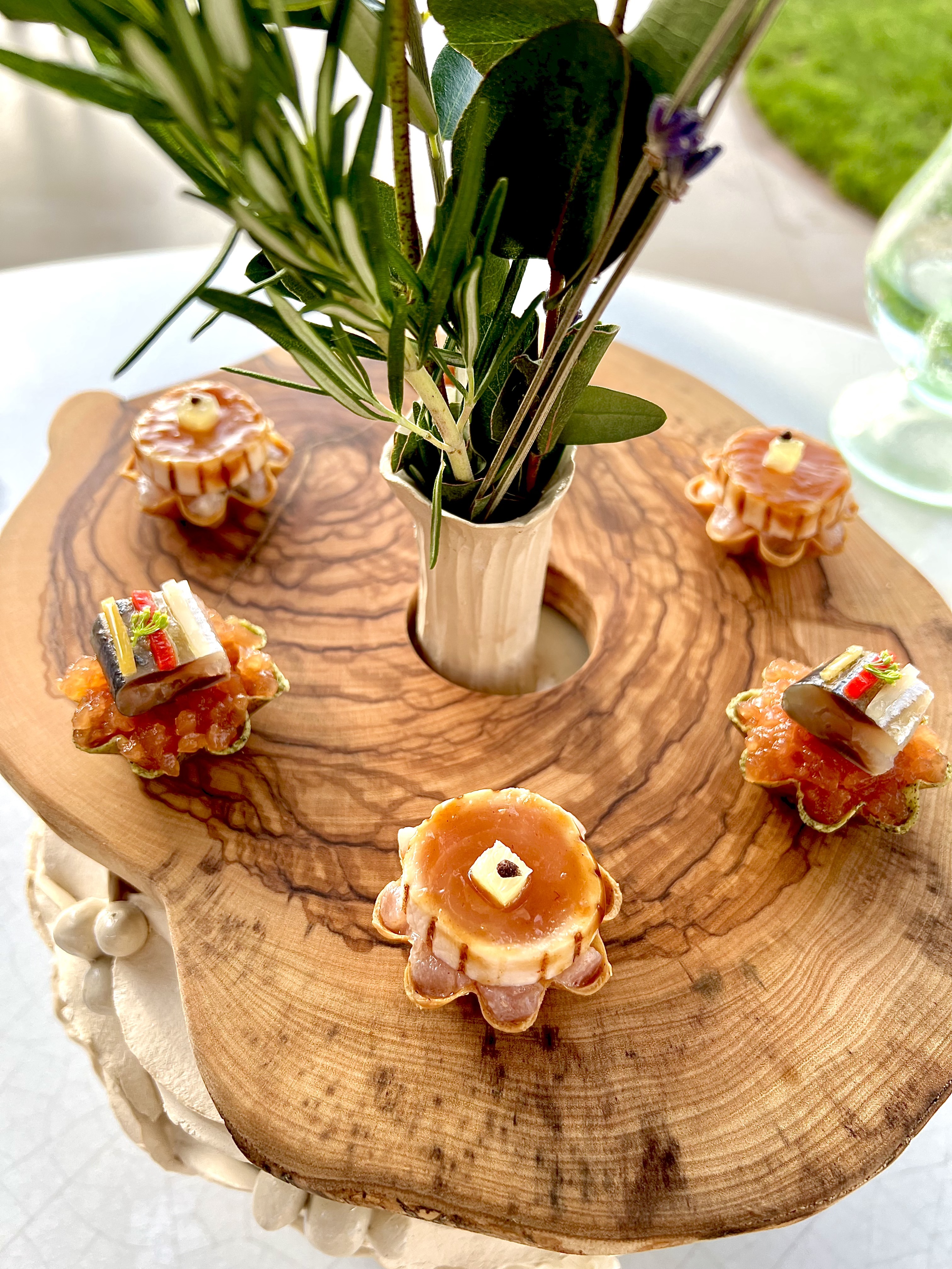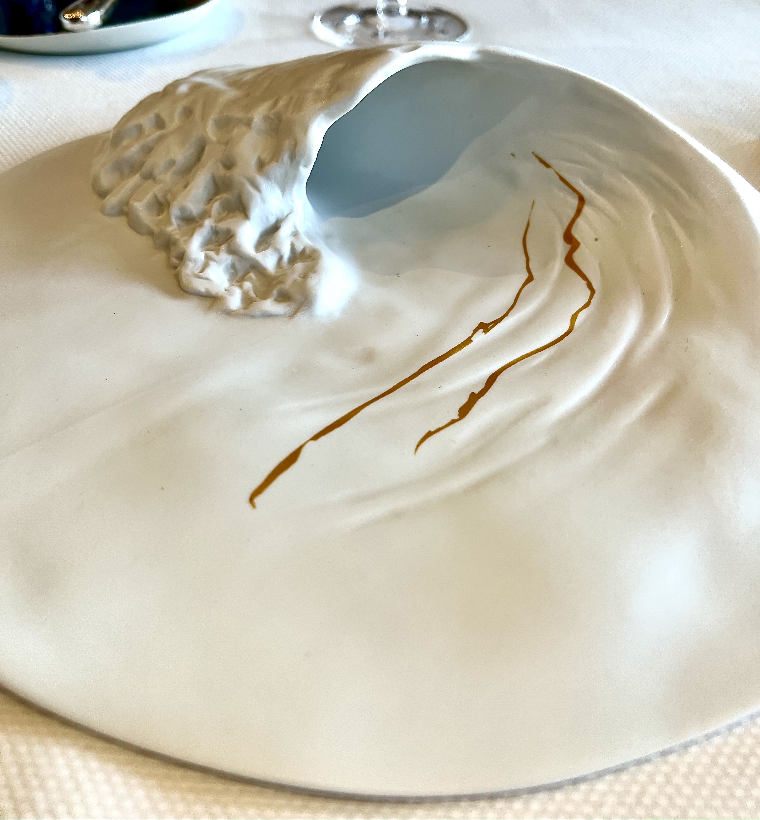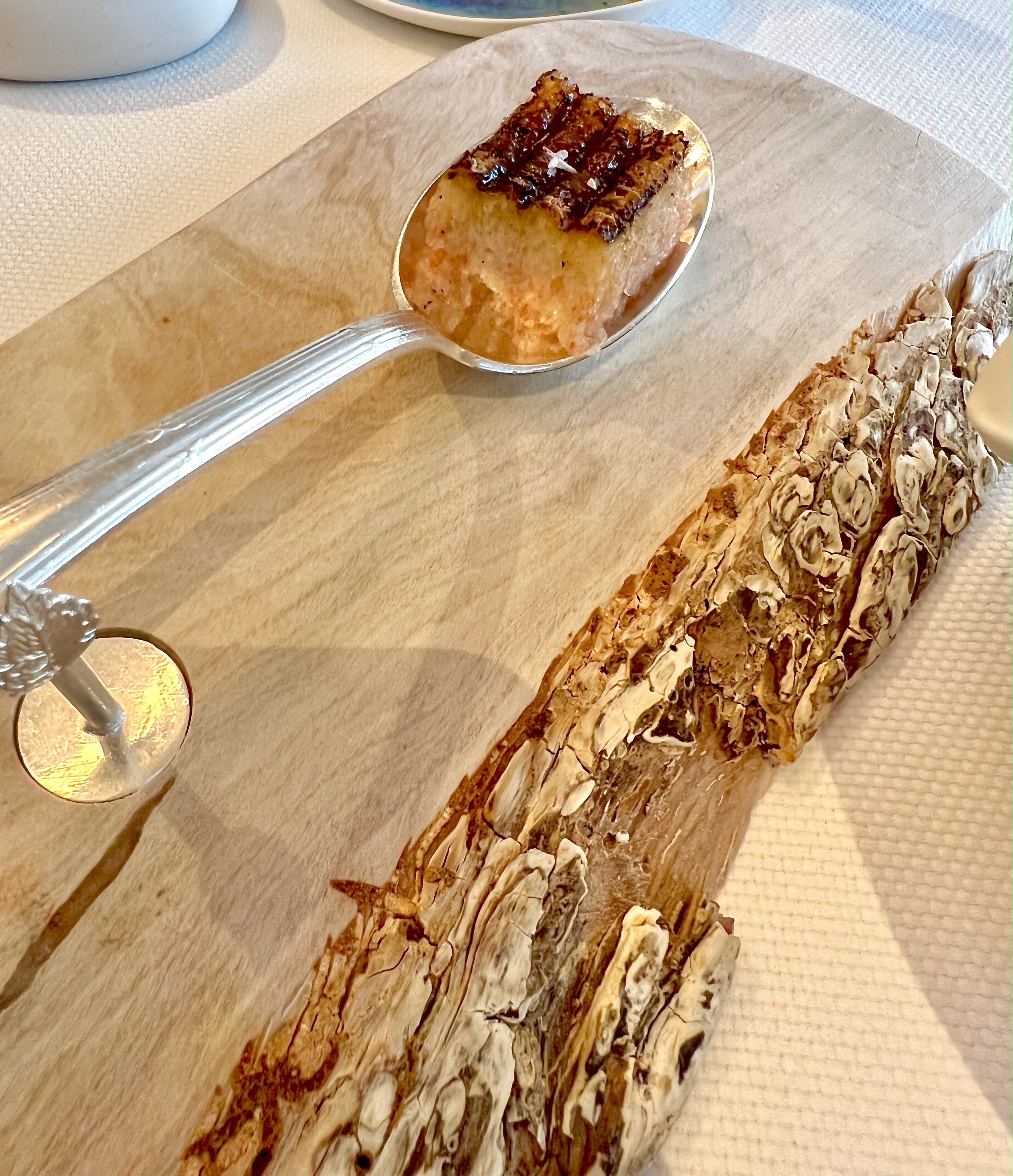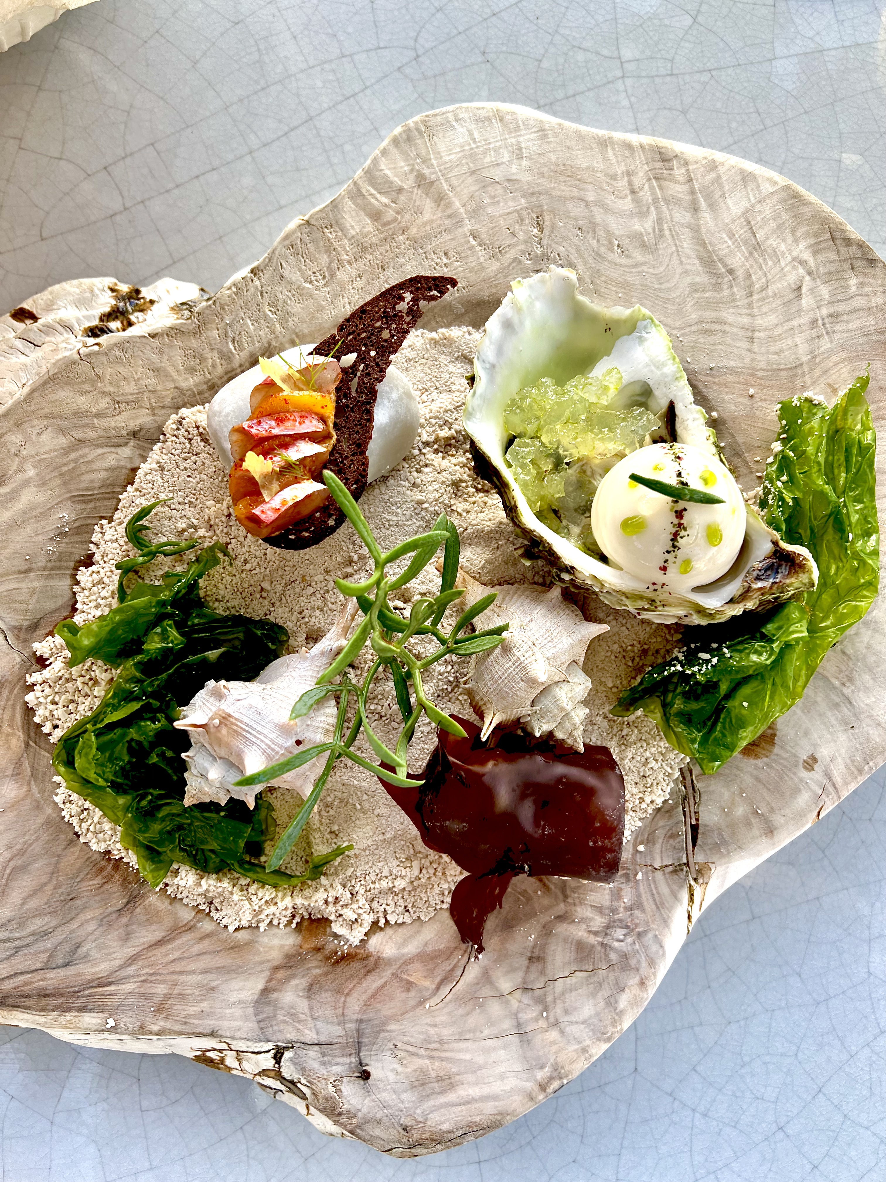 La seconde partie des amuse-bouches marines racontent la plage, le sable, le fond marin et le bois flotté : Huîtres de Giol espuma de verdure, Croustillant de rouget, citron yuzu, marinade à l’huile d’olive, l’huître juste raidie a une mâche exceptionnelle, elle s’enveloppe en délicatesse de son voile de verdure iodée. Le rouget en croustille a l’intense saveur d’une bouillabaisse liée au yuzu et à l’huile d’olive.