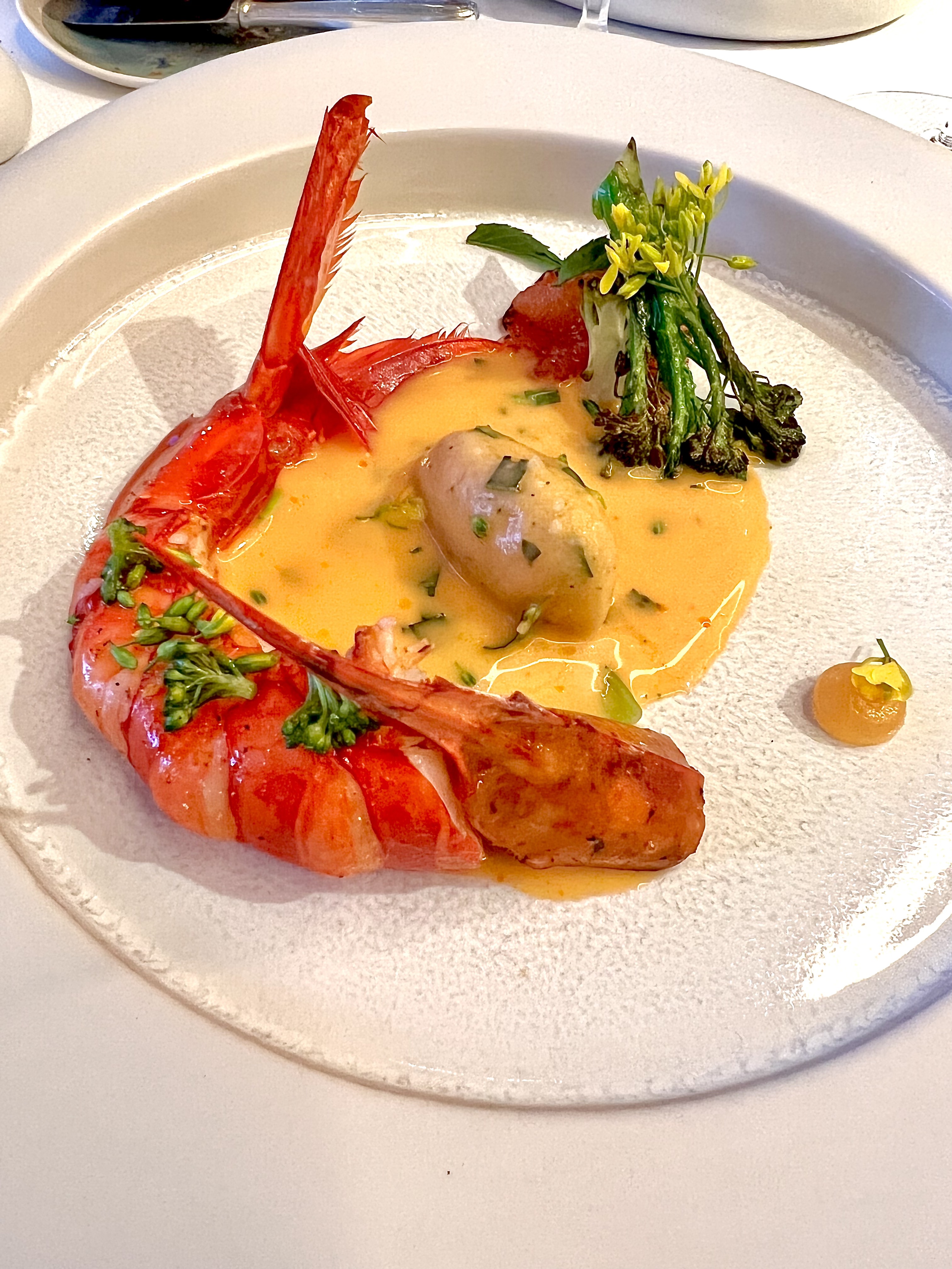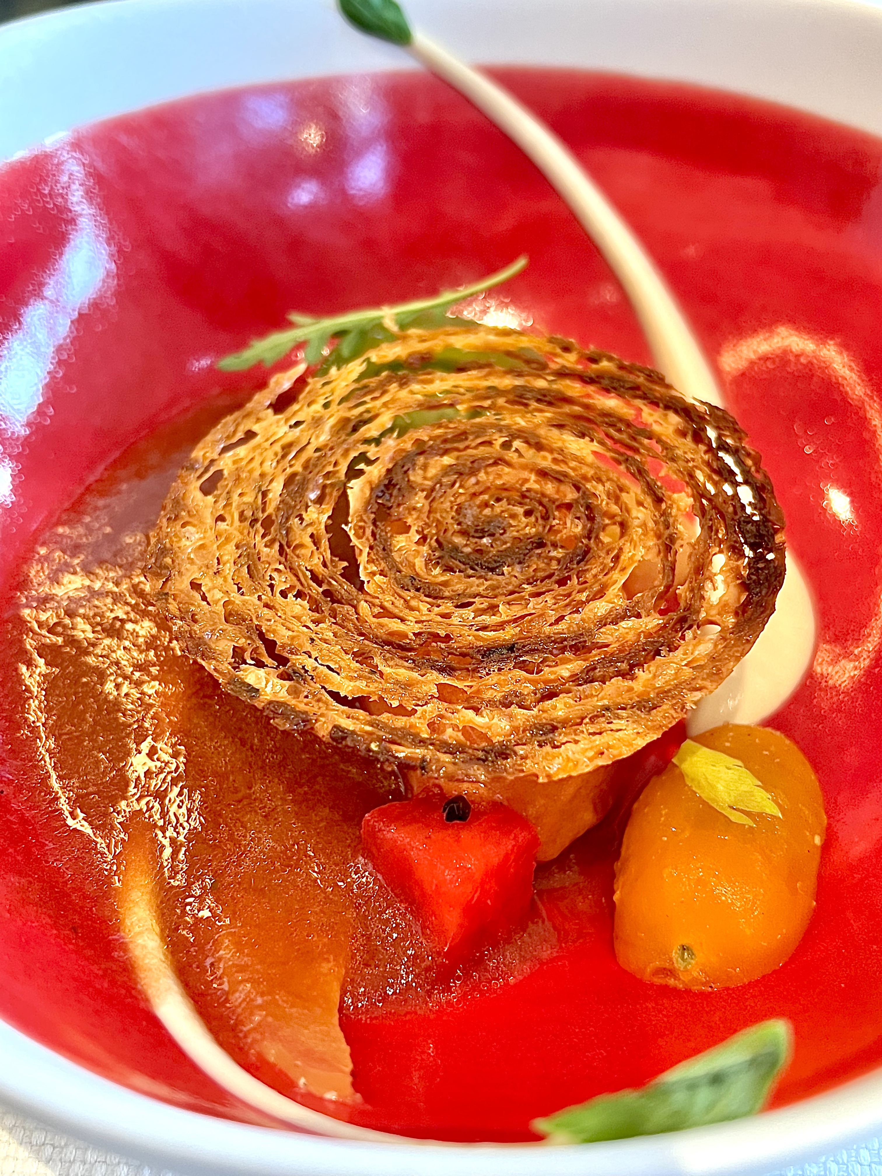 Le Gambon écarlate juste saisi et vivifié au pamplemousse corse, broccoletti coupés du matin, menthe bergamote et aloe vera au naturel, confection d’un jus d’Oro Bianco et huile d’olive infusée aux têtes grillées. Le gambon écarlate, appelé également carabinero, est une crevette des profondeurs à la chair dense, intensément iodée et légèrement pimentée. Ici, il est saisi en instantané au barbecue, la sauce est à nouveau en double dimension et est le percutant de tous les éléments avec un jus d’Oro Bianco (pamplemousse Corse) adouci au miel de citronnier et relevé de menthe et de bergamote, le sorbet de corail de têtes en fondant se fait vinaigrette et s’entrelace au pamplemousse pour ne former qu’une seule sauce qui devient alors éblouissante.