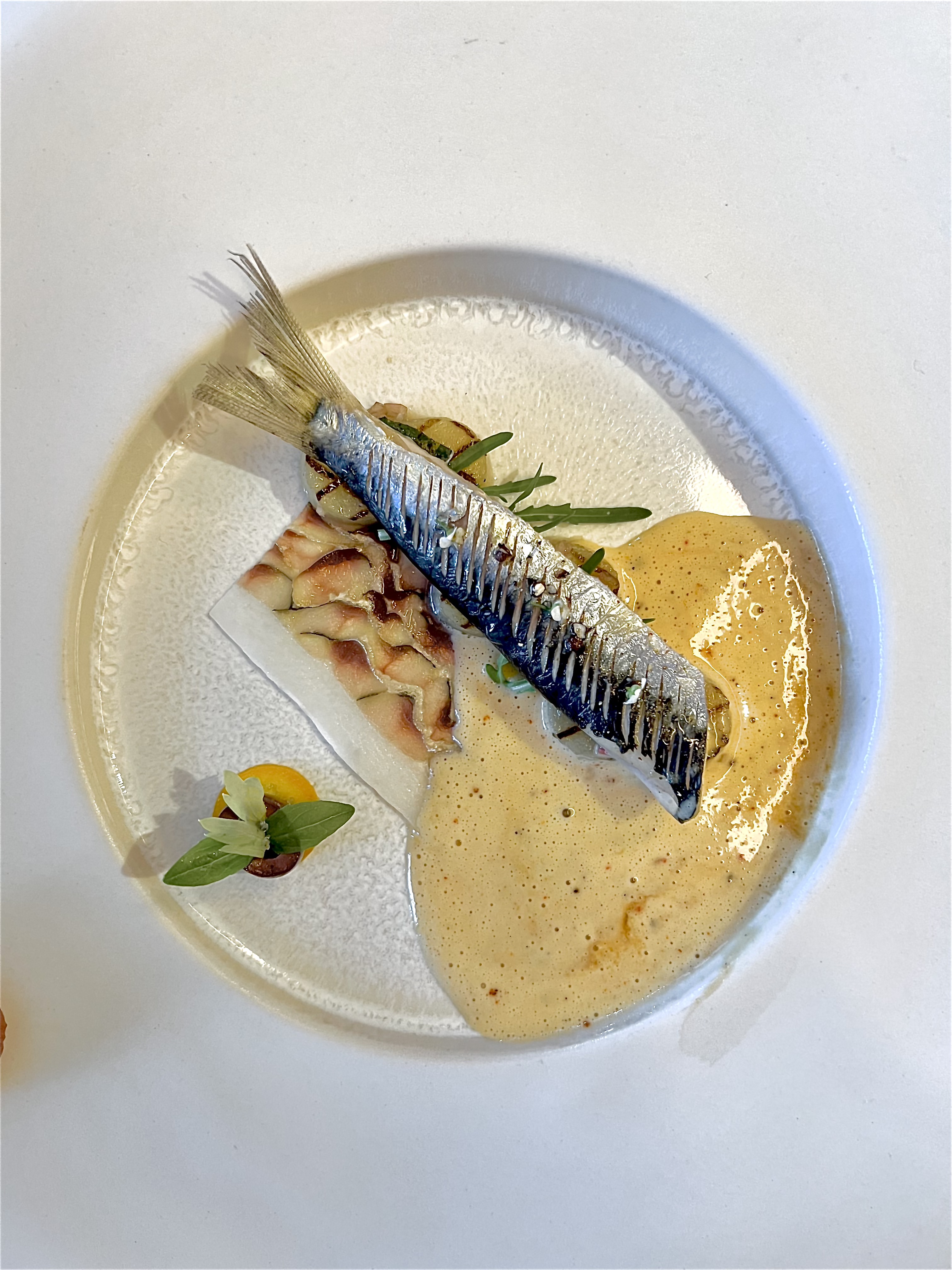Anchois de pleine mer Méditerranéenne, quintessence d’un jus de girelles transformé en sabayon tiède et éphémère, distillation d’un jardin potager provençal. Comme indiqué dans l’intitulé, un seul mot pourrait définir ce plat : quintessence… Quintessence de la Méditerranée pleine de vie et de puissance de l’anchois qui, travaillé de cette façon, devient noble et délicat, rustique et raffiné à la fois, classique et moderne; tout est magnifiquement en place, tout s’imbrique en évidence, tel un damier parfait des saveurs. Le sabayon de girelles (petits poissons de roche) se révèle en double dimension de deux sauces en une : d’abord iodée, onctueuse et crémeuse, puis vinaigrée acidulée de la mandarine et puissamment herbacée des aromates du jardin.