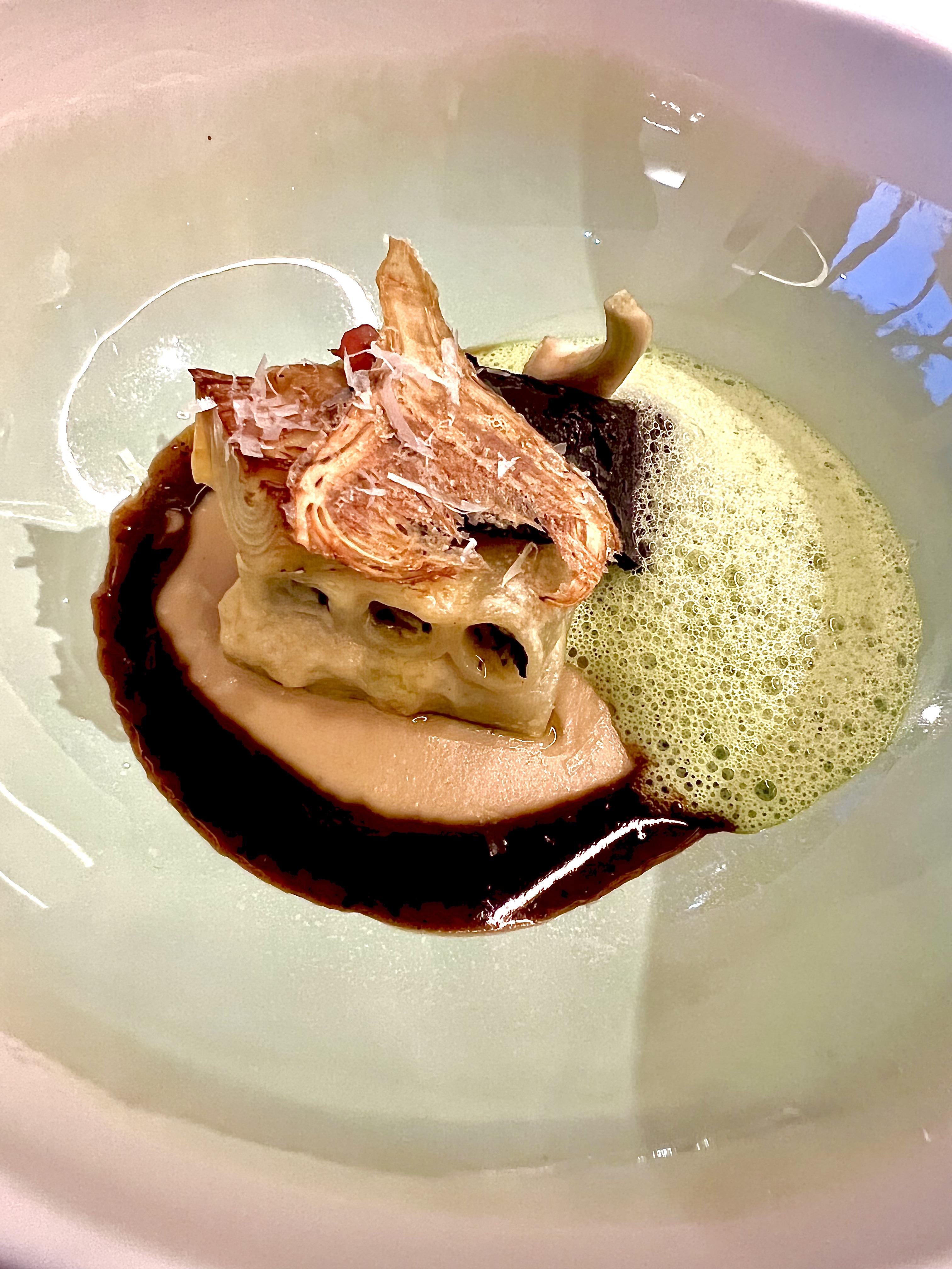 La pâte Zitone, délicatement fourrée de truffe noire et foie gras, l’artichaut violet en trois textures, ravivé au basilic, plat hommage à Jean-Louis Nomicos, ancien chef d’Arnaud Donckele. Une apothéose de la gourmandise d’autrefois, à la touche légère et aérienne d’aujourd’hui. Le foie gras s’associe en splendeur avec la truffe, les pâtes légèrement gratinées au Parmesan s’imbibent de bonheur de la sauce Périgueux , les artichauts en triple texture : cuit, cru, en tuile attisent avec bienveillance les papilles. Le nuage de basilic signe ce plat d’une ouate de modernité infinie.