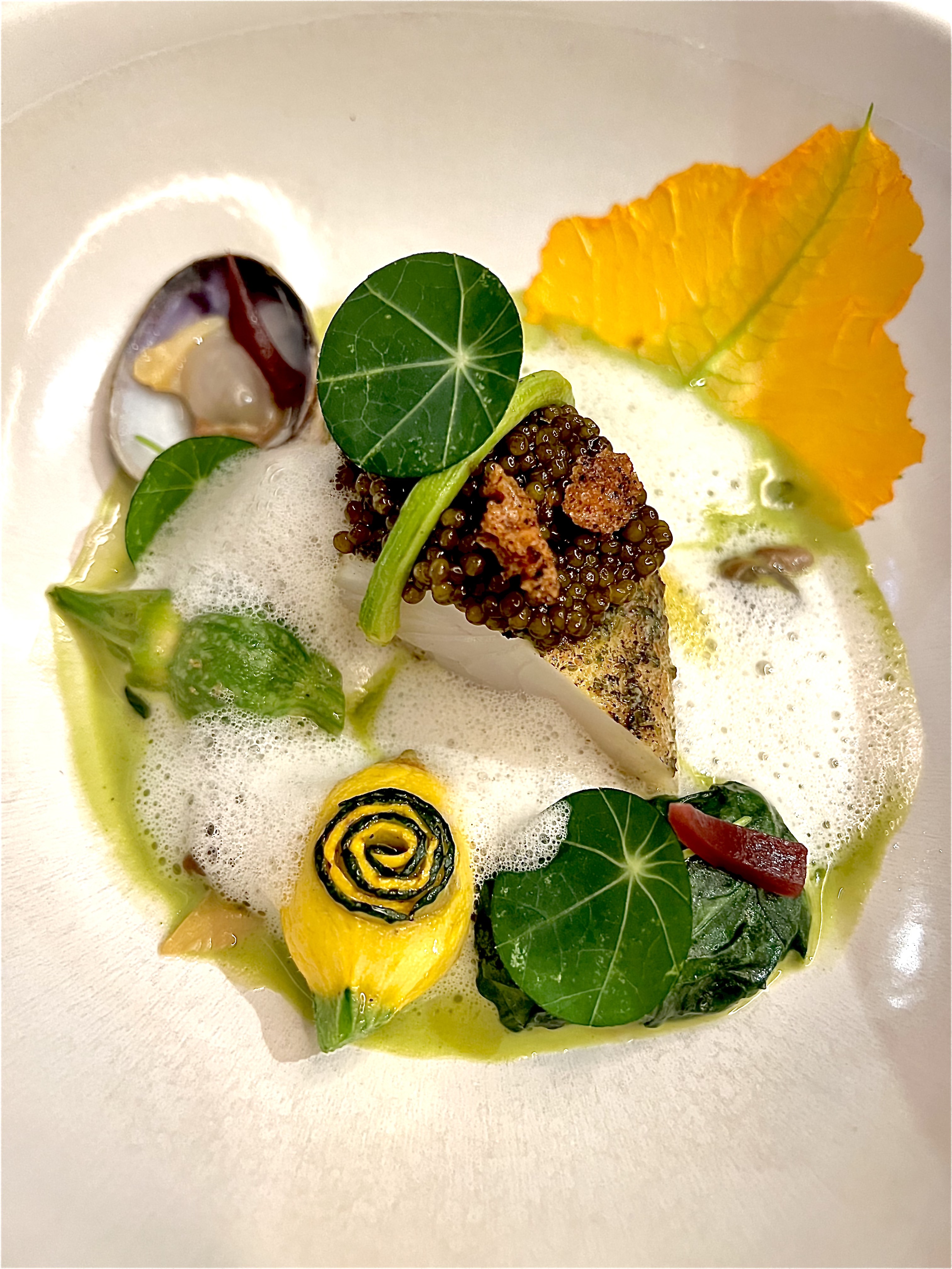 Saint-Pierre en suc de plancton marin et capucines, courgettes violons et boules étuvées aux algues, vapeur d’huître, palourdes au sautoir, bouillon d’haliotis « al verde » monté à l’huile d’olive citron. Ne soyez pas étonné si vous ou un de vos convives verse une larme iodée d’émotion à la dégustation de ce Saint-Pierre à la « sous-cuisson », au millième de seconde près, d’une perfection rare. Il est nourri d’un beurre d’ail, puis plongé en immersion dans de l’eau de mer pour lui garder toute sa stature. Le caviar Krystal vient transcender en raffinement cet univers ultra-marin, l’huître meunière se cache de sa feuille d’épinard comme un bonbon gourmand noisetté. Le jus de courgette s’infuse de fleur de capucine de cette sauce pleine de vie qui évolue en bouche avec poésie.