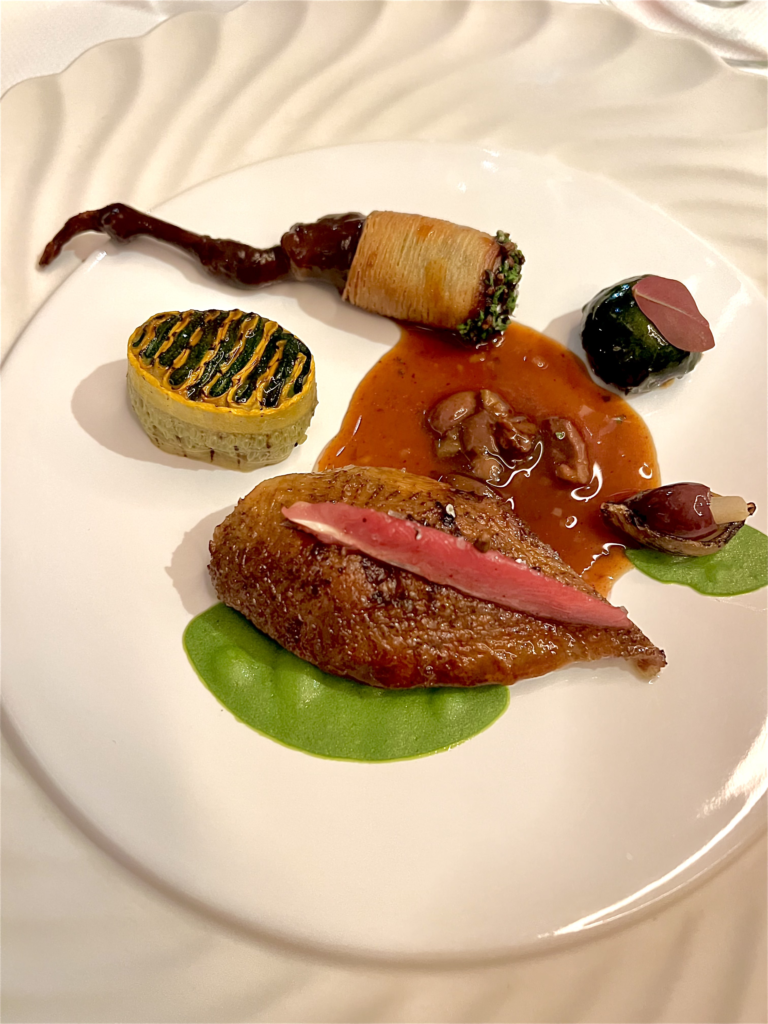 Dans la salle, ou sous les étoiles en saison, la suite, tel un ballet gastronomique, se déguste, à la fois en grande émotion, simplicité et profondeur : dîner trois étoiles exceptionnel, poétique, percutant, puissant et délicat à la fois. Les produits locaux, d’une incroyable véracité et élevés avec amour de façon « haute couture » par les petits producteurs, sont sublimés et épaulés par des condiments et des sauces multidimensionnelles inoubliables. Les jeux de textures, de températures et les cuissons sont époustouflantes de justesse et de précision. Chaque plat restera gravé dans votre mémoire gustative et vous les revivrez comme un grand moment de chaque instant.
