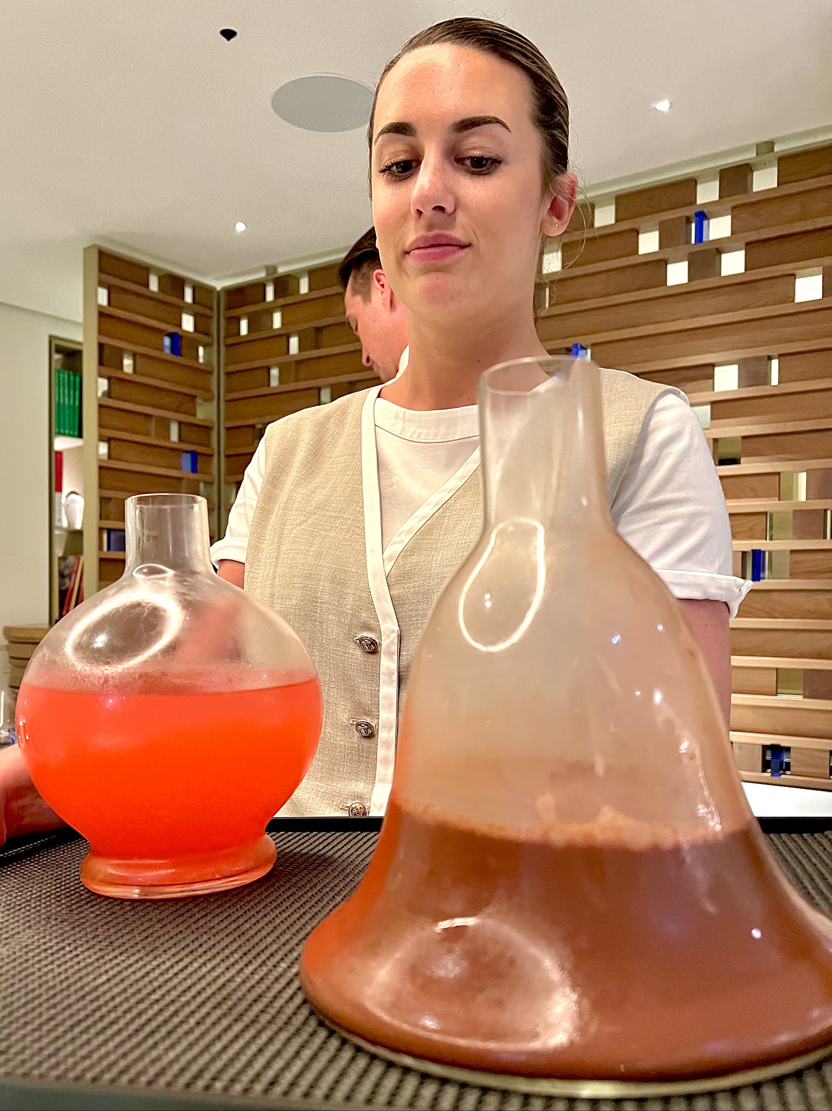 Puis arrivent, en avant-goût et de façon transitoire, des eaux infusées en accord des desserts choisis : ainsi eau de rhubarbe et eau de cacao.