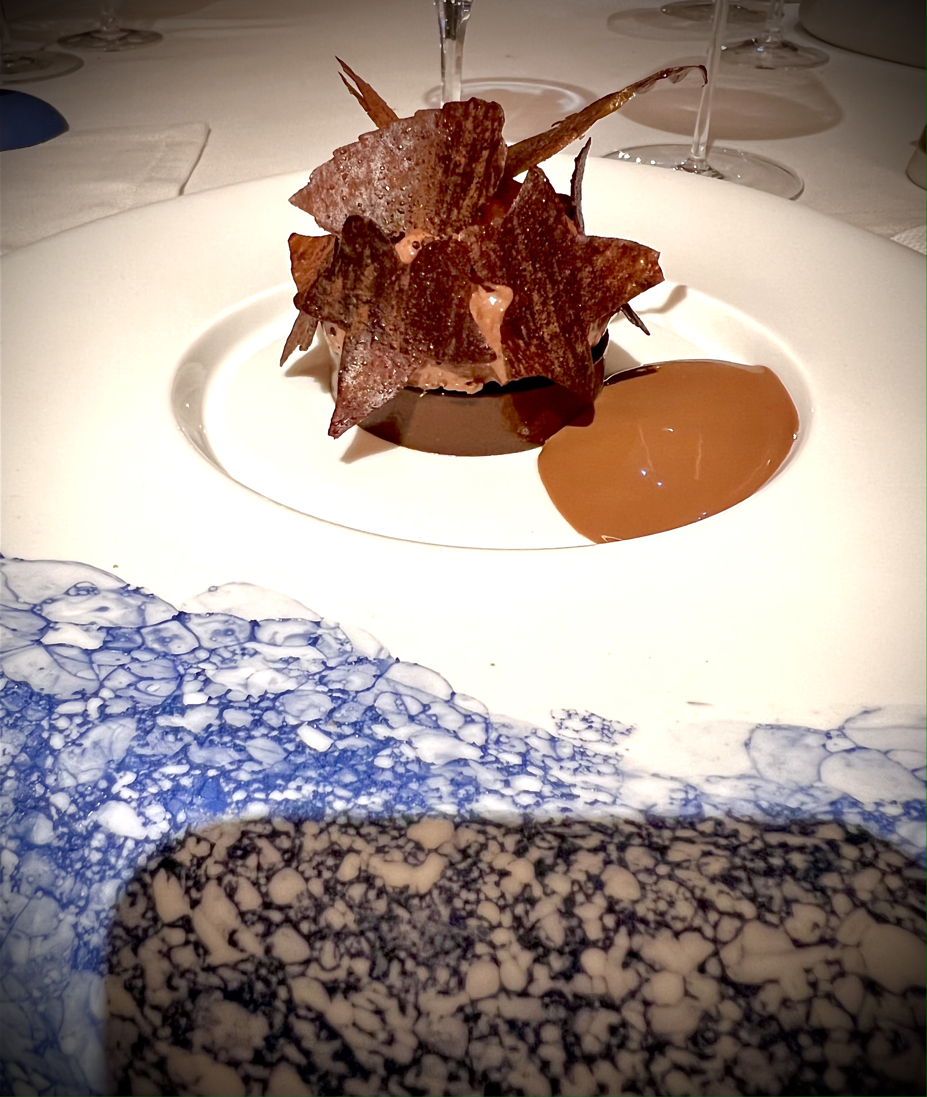Une symphonie personnelle du chocolat Grand Cru, le chocolat est ici dans toutes ses textures : en palet croustillant, en pétale, en mousse, qui passée au four, enferme en son centre un sorbet cacao qui se réchauffe d’un chocolat chaud dans l’idée d’un soufflé. La mandarine vient faire vibrer tout ce monde chocolaté, tout comme la pointe de menthe citronnée en filigrane.