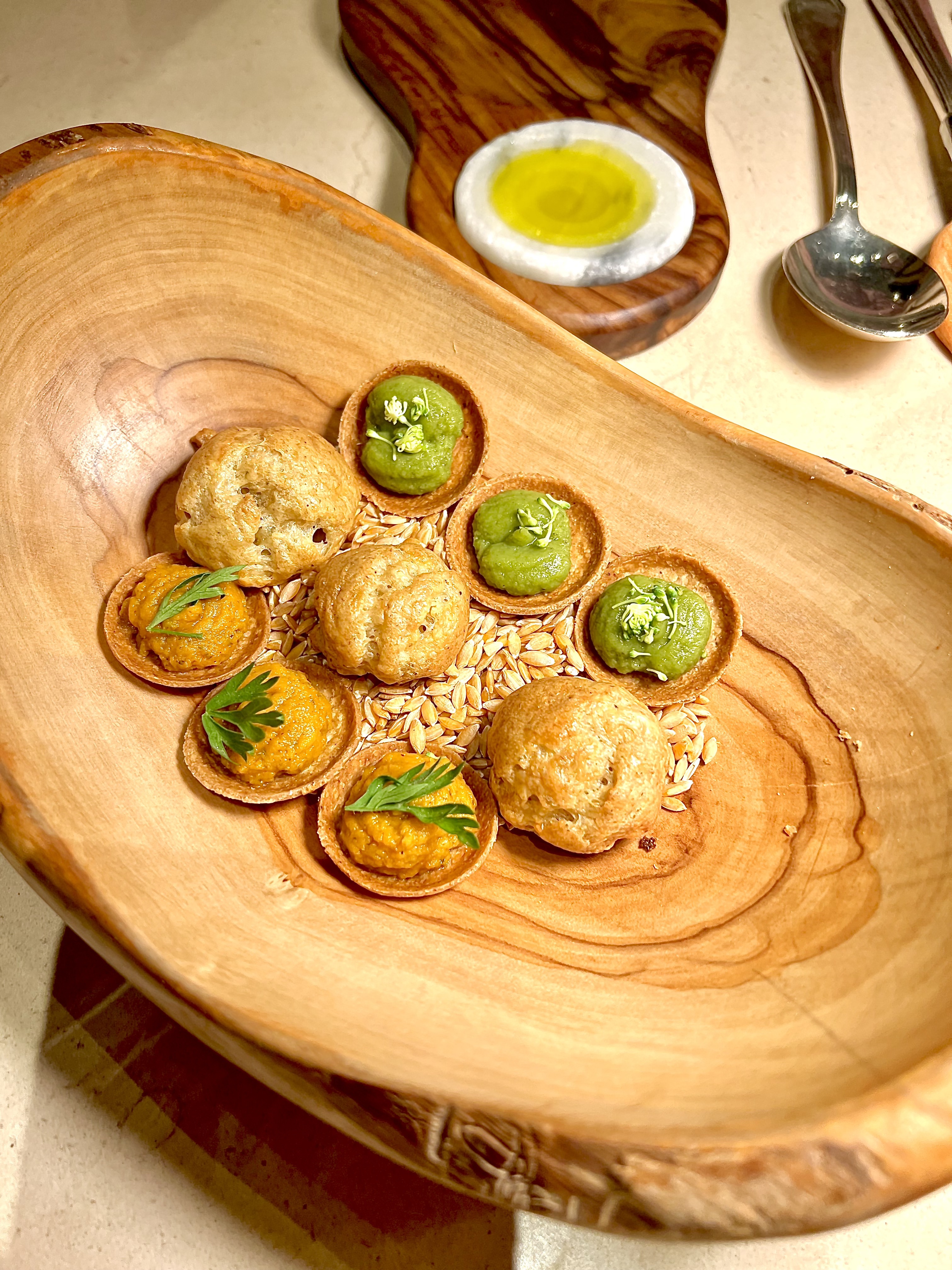 Tout commence par des amuse-bouches entre fraîcheur herbacée d’une tartelette brocolis-fromage frais et la gourmandise d’une moelleuse gougère.