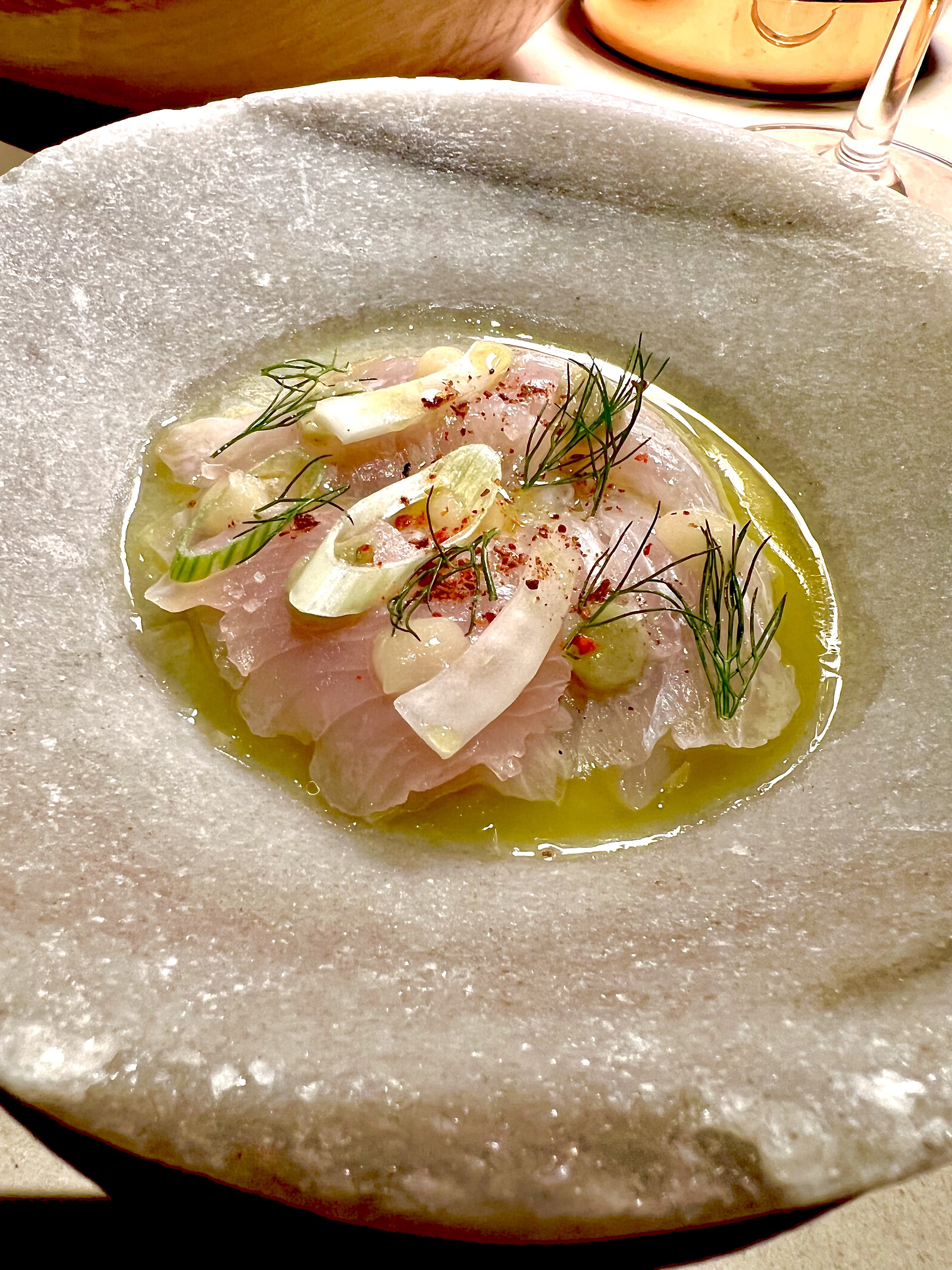La Sériole marinée, fenouil et huile d’olive est une entrée qui garde toute sa mâche et sa verve iodée, qui s’anise en élégance du fenouil du jardin et s’enveloppe d’une ardente et précieuse huile d’olive, le tout est servi à une parfaite température qui déploie les saveurs.