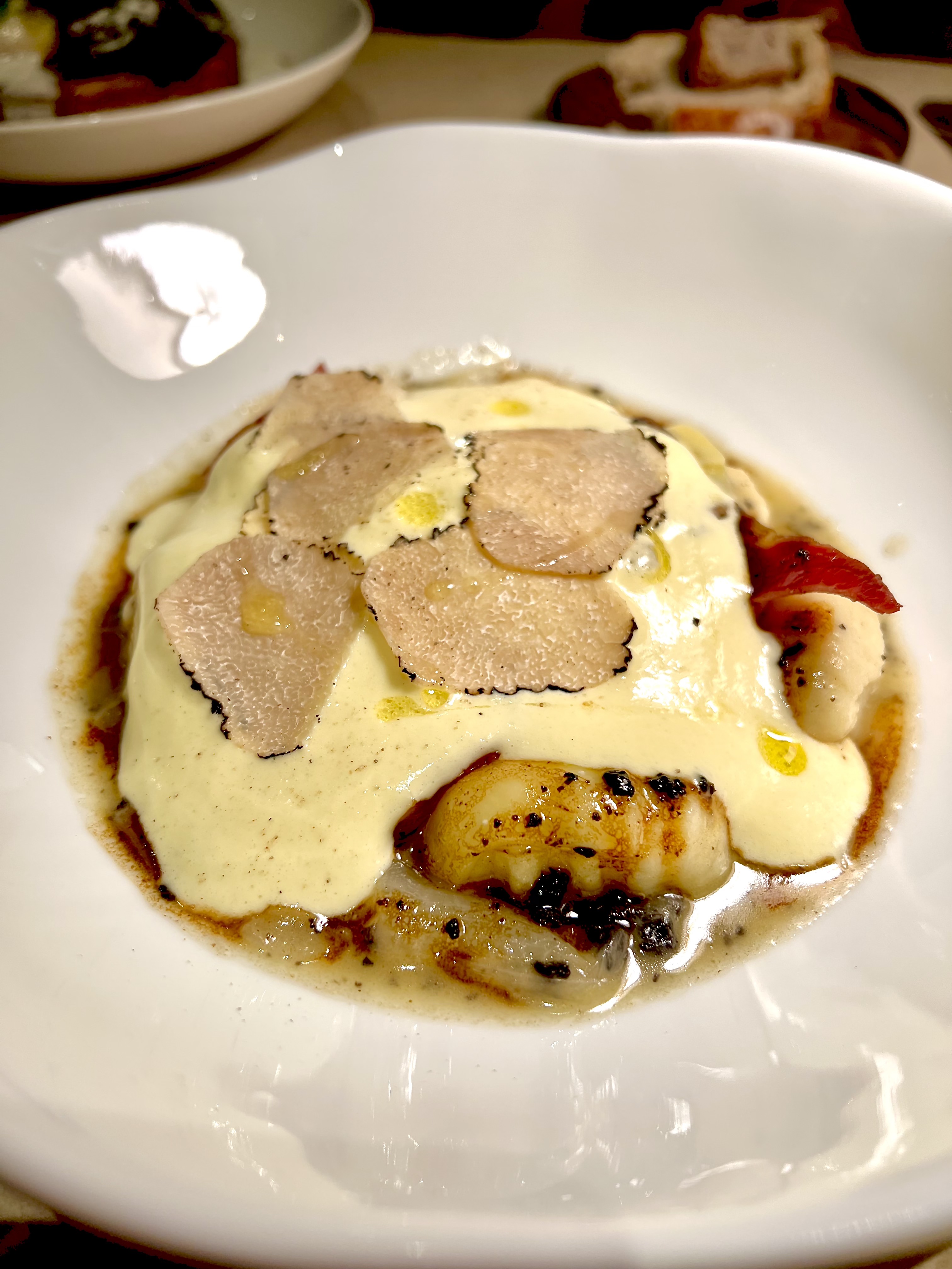 Oeuf poché sabayon au vieux Comté, mijotée d’oignons doux, gnocchis et lard fumé paysan, jus truffé : l’oeuf coulant se pare de l’onctuosité infinie du sabayon au Comté et s’ajuste de bonheur du lard, lui même renforcé du jus truffé.