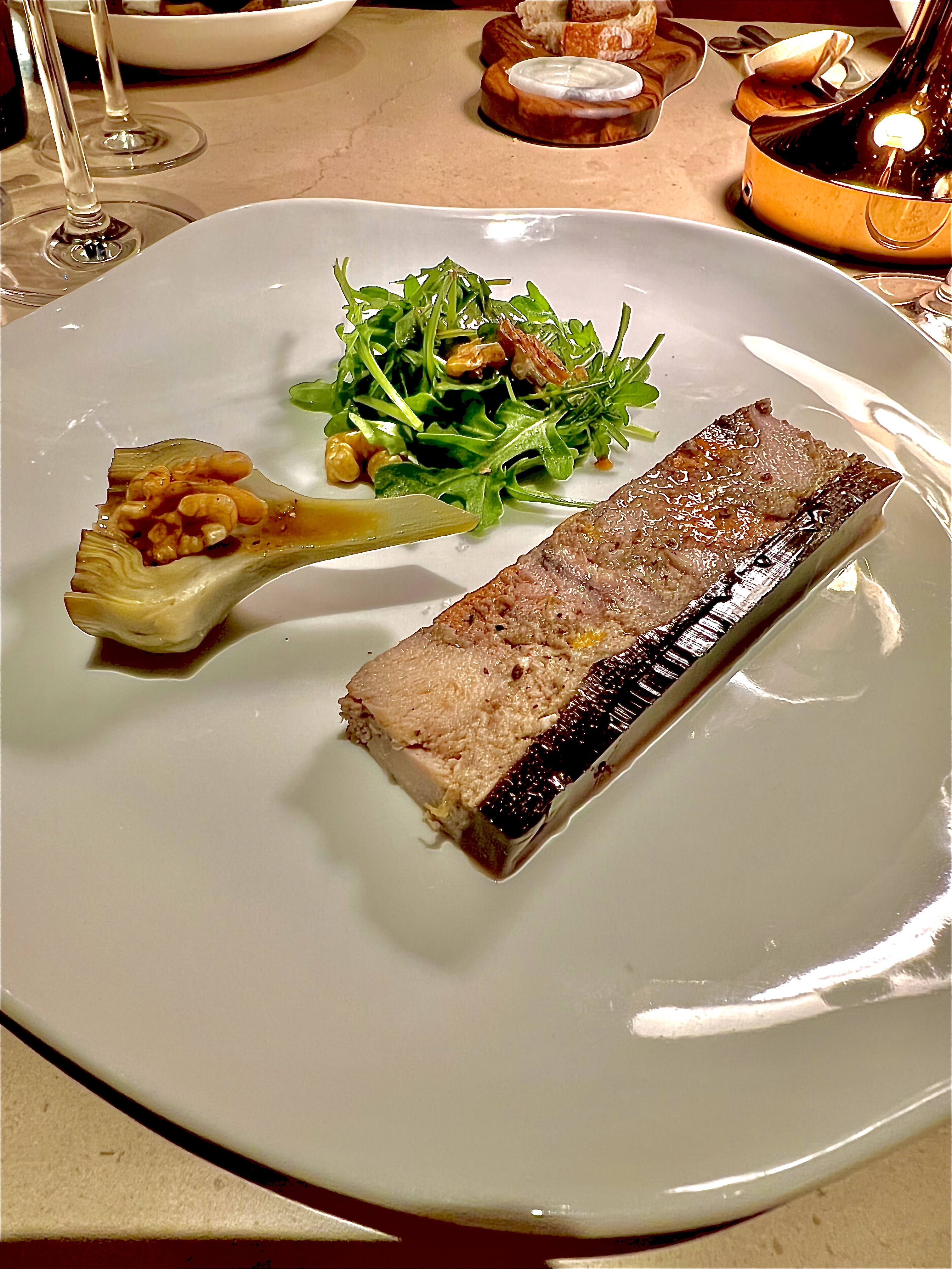 Le Pressé de volaille de Bresse aux foies blonds et artichauts, roquette et petits violets fondants, un pressé où toutes les viandes gardent de la personnalité et de la mâche, la pointe d’épices apporte le relief, la roquette et les artichauts délivrent le végétal attendu.