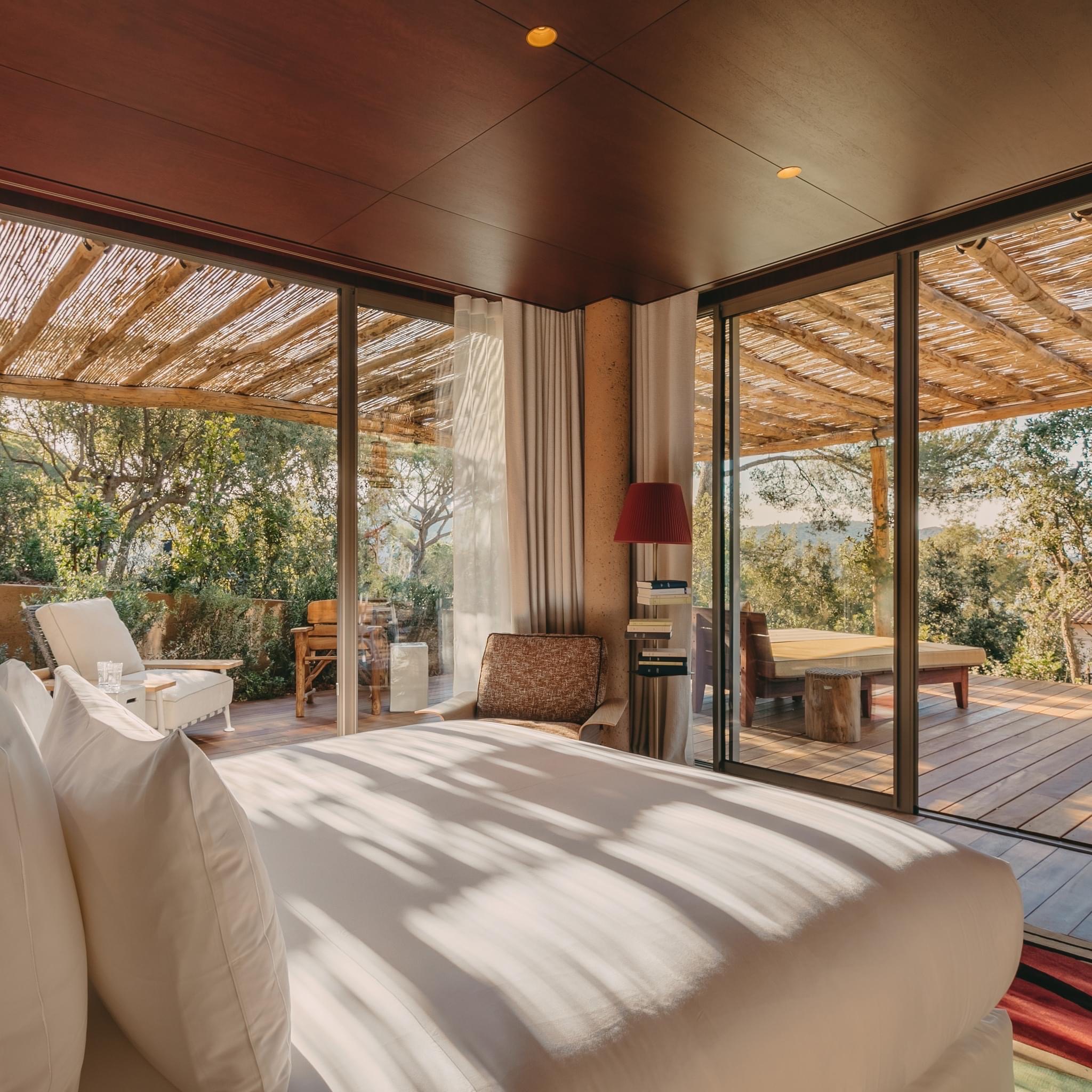 Les chambres, à la minéralité brute, respirent les embruns et le romarin de leur terrasse, dont certaines se prolongent d’un jardin privatif. Les matériaux célèbrent la Méditerranée entre les bois locaux, le marbre poli et les cuirs naturels, les poteries de-ci de-là, exposées comme des bibelots, résonnent d’une histoire et délivrent chaleur et réconfort comme dans ces belles maisons provençales. Lilly of the Valley, du nom de cette délicate fleur des sables, n’est pas un hôtel comme les autres, il prend soin de vous à chaque instant, ce « luxury wellness hotel » tient toutes ses promesses avec son superbe spa et son incroyable Shape Club de plus de 2000m2, la piscine extérieure chauffée est encadrée de cabanes de bien-être en bois et permet à quiconque de profiter à son rythme des programmes de soins ou minceur et des activités proposées, comme le yoga ou des randonnées en paddle…