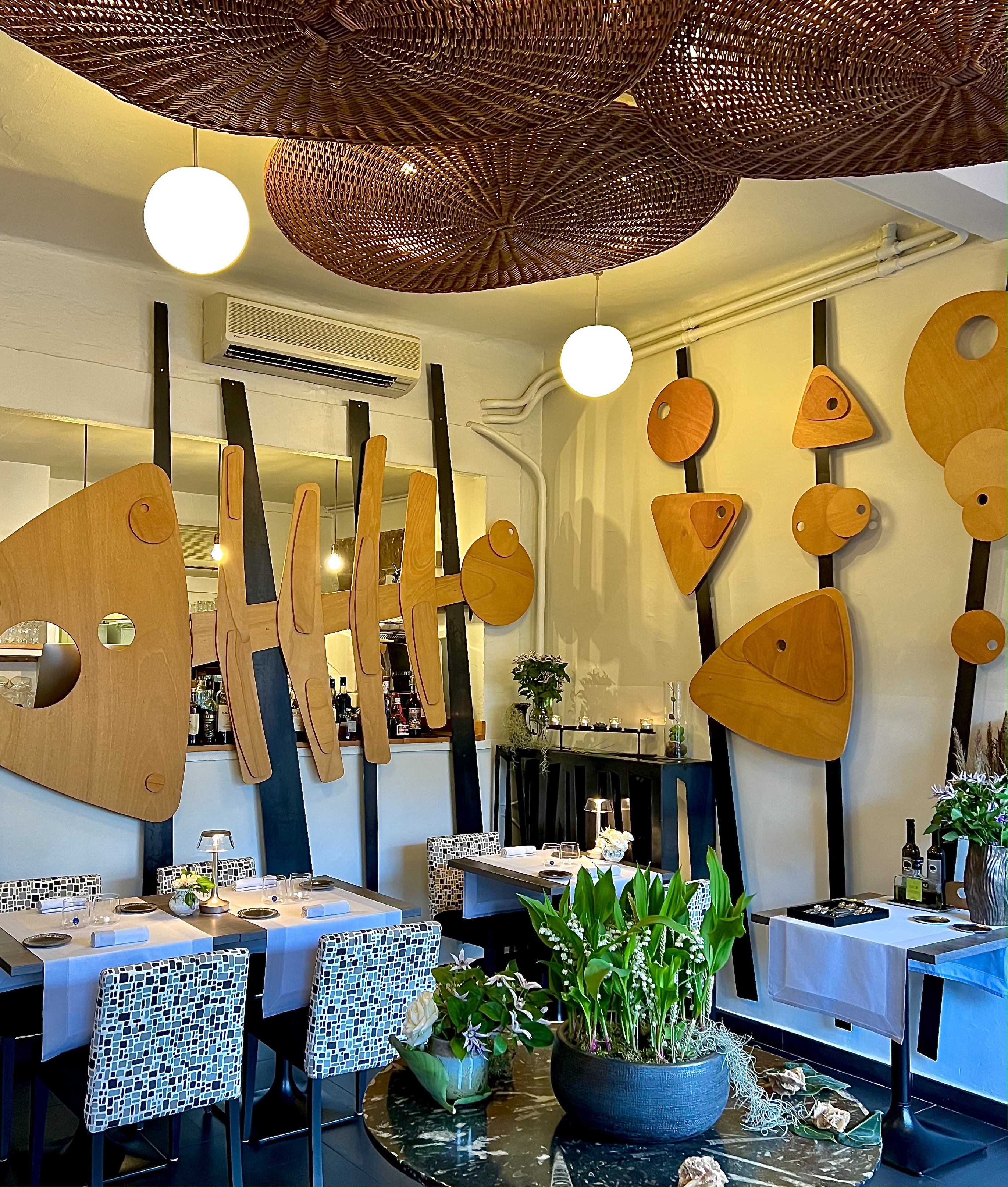 La lumineuse salle est épurée et intimiste, les murs martelés de plaques de bois blonds pourraient rappeler des bancs de poissons en mouvement. Les superbes arts de la table sont véritablement à l’honneur et mettent parfaitement en avant la minutie créative des mets.