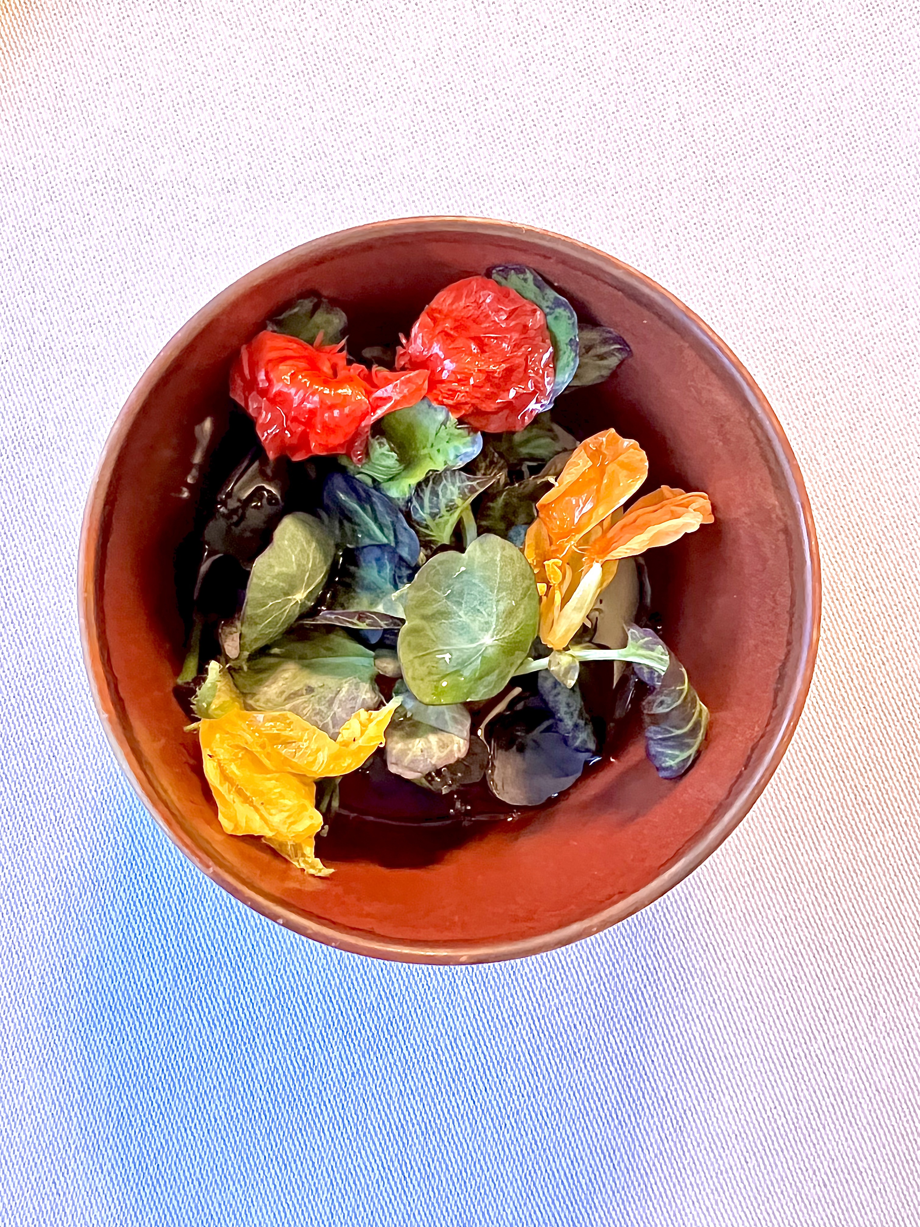 Gomasio – Bonite : la bonite, travaillée comme une bavaroise sans crème, s’agrémente d’un gomasio (brocolis et sésame) en surface avec un effet « crouté » au goût intense, telle une viande à la saveur d’un vitello tonnato. La Truite de Rémi Callonico – Paprika – Saké : un aspect jardin fleuri de cette délicate truite du Cians au saké, saupoudrée d’un crumble de paprika-curry vert et rehausée d’une salade d’herbes aromatiques au relief méditerranéen et japonisant. La Secca d’Entrevaux : (jambon de boeuf séché et salé) pulvérisée en surface sur une tartelette d’ail noir fermenté, se déguste en une bouchée et recentre le palais de son côté astringent pour clôturer avec ingéniosité cet opus du Terroir Maralpin et débuter celui de L’iode et les épices.
