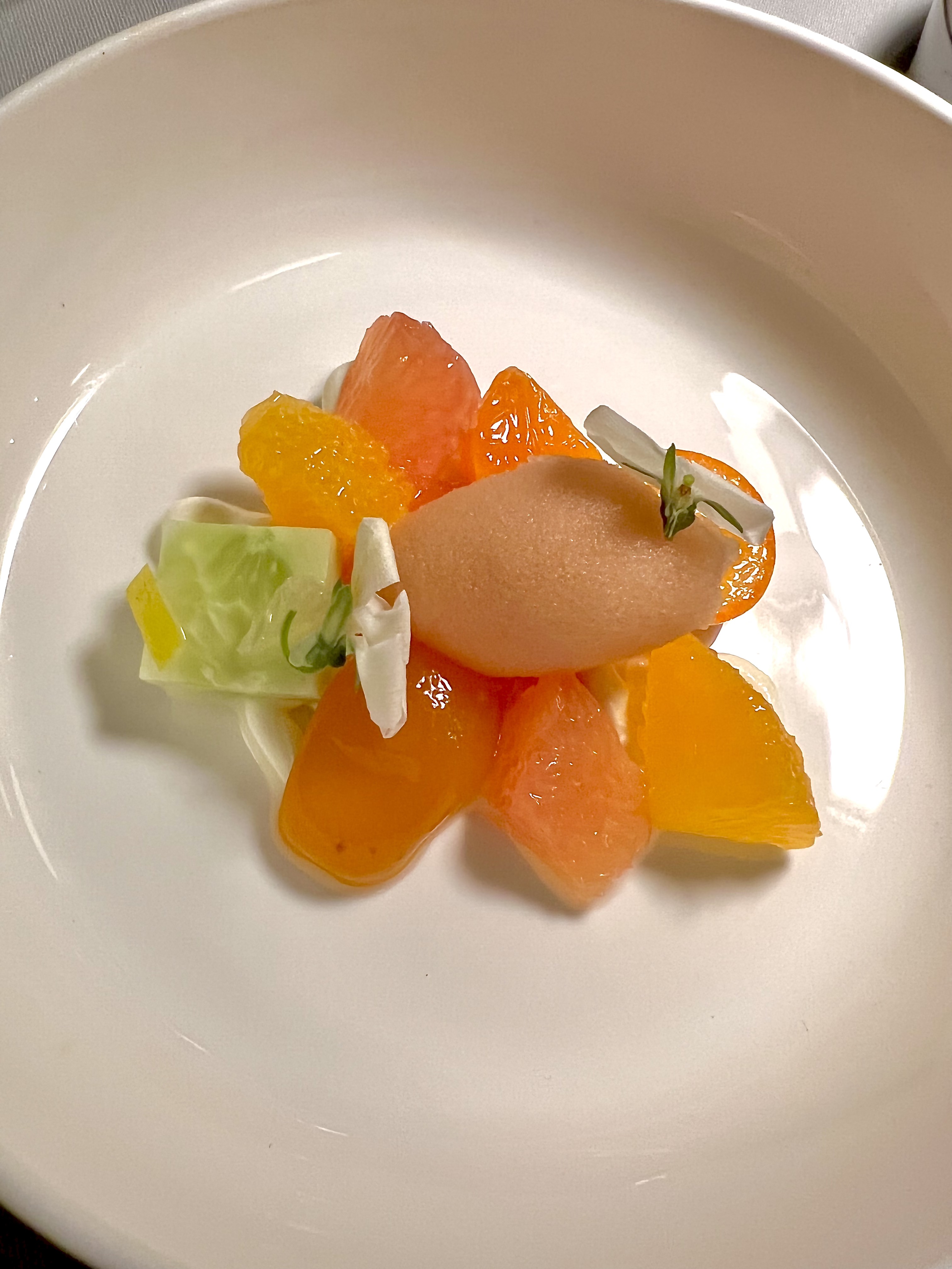 L’Arlequin – Pomelo, piment oiseau et concombre Noa : un véritable damier de fraîcheur acidulée qui redynamise à merveille le palais. Les agrumes se déclinent comme des fruits confits de Nice : du kumquat au pamplemousse. Le zeste de citron vert vient titiller le doux mascarpone et le concombre Noa rafraîchit en justesse cette vive assemblée. Le sorbet pomelo se fait trompeur de sa saveur piment oiseau qui vient pulser en finale.