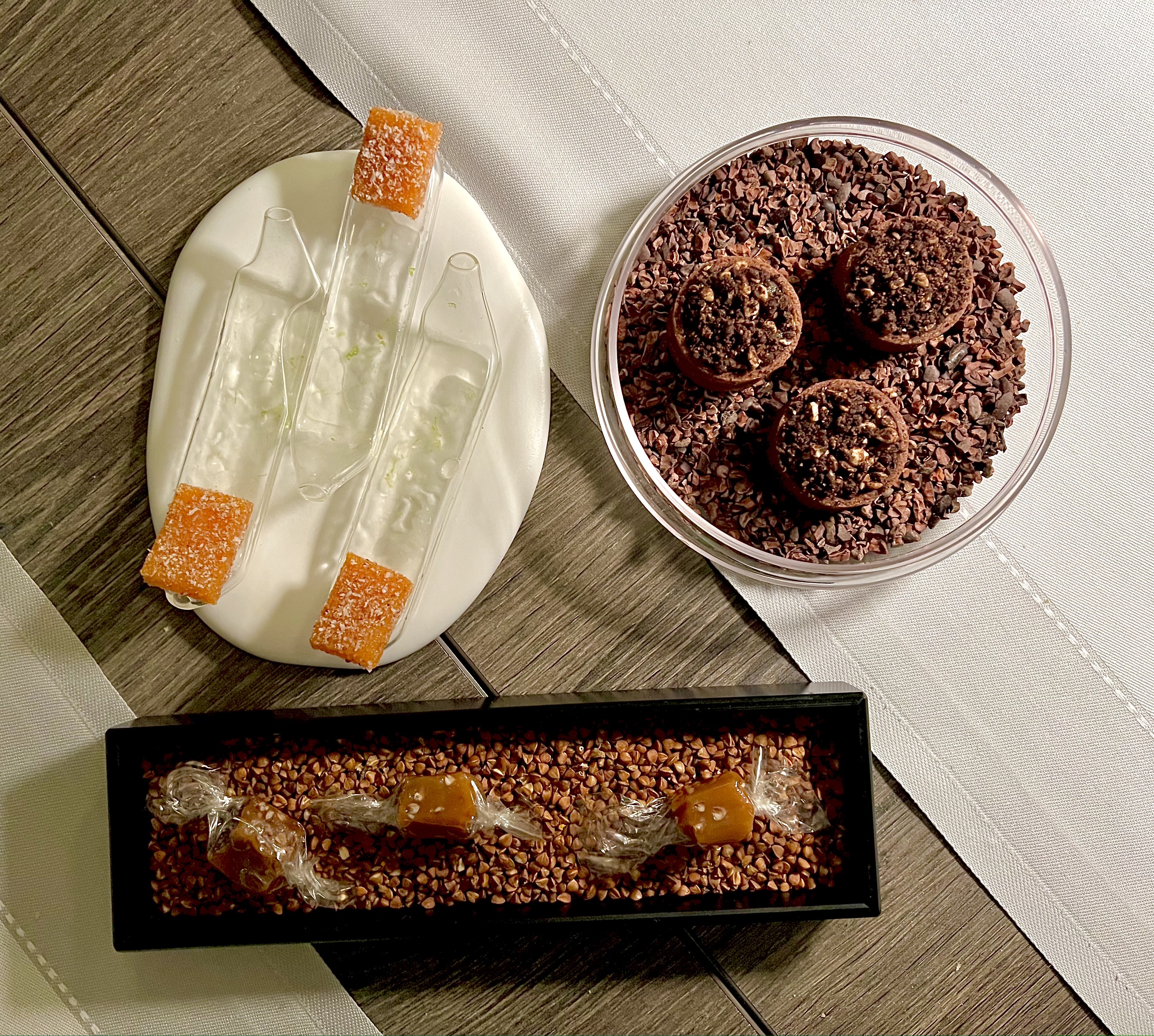 La pipette eau de coco et citron vert s’assemble de la pâte de fruit à la papaye-mangue, la crème glacée mascarpone se couvre de praliné au curcuma et dévoile une amande torréfiée au curry. La verrine de Halva glacé s’équilibre de citron, de datte et de graines de sésame torréfiées, la tartelette est un grand cru Guanaja croquée de noisettes du Piémont. Les Papillotes de l’enfance sont au caramel beurre salé et épeautre. C’est amusant, léger, digestif, tout est à nouveau pensé et réfléchi entre texture et sensation.