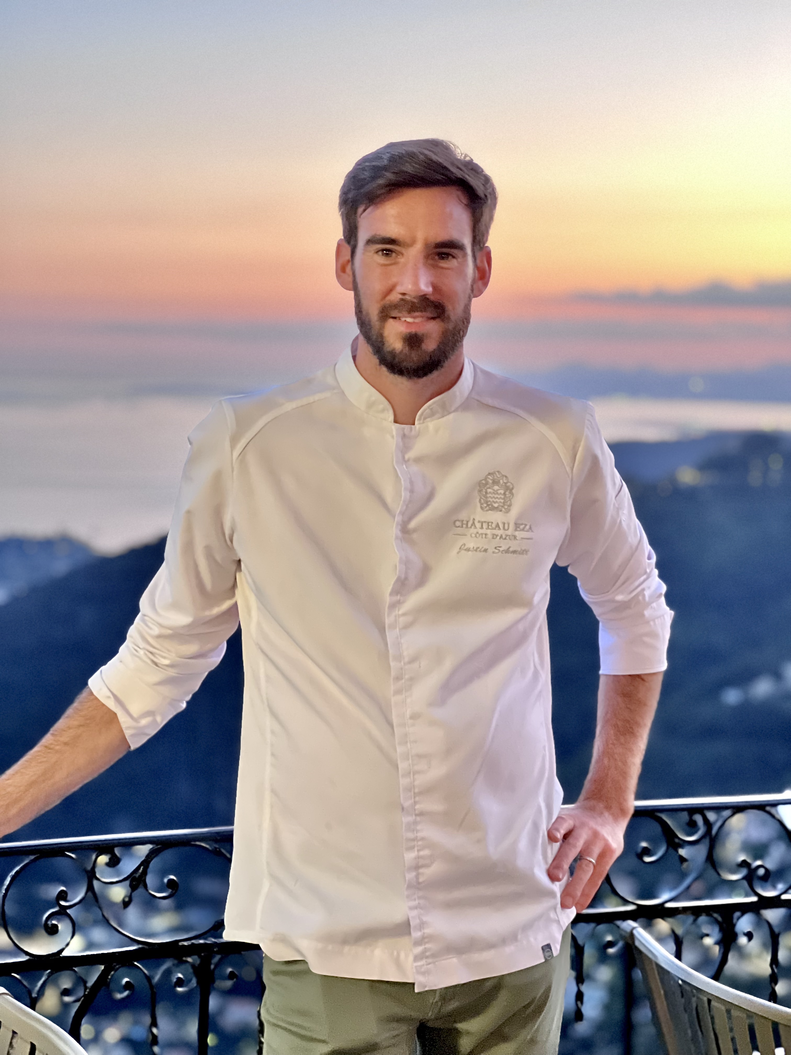 Justin Schmitt a très tôt commencé la cuisine à Paris où il a fait sa formation à l’école Grégoire Ferrandi. Il débute son apprentissage au Gaya Rive-Gauche* de Pierre Gagnaire, où il découvre une créativité sans limite impulsée par le chef aux 12 étoiles, puis au restaurant Lucas Carton*** auprès de l’emblématique Alain Senderens (précurseur de la Nouvelle Cuisine) où il apprend la rigueur d’une brigade trois étoiles à la cuisine ciselée, raffinée et précise. Il quitte Paris un été pour Eugénie-les-Bains en tant que demi-chef de partie chez un autre grand chef trois étoiles qui a également révolutionné la gastronomie française avec la cuisine minceur : Michel Guérard***. De retour à Paris, il officie au Grand Véfour*** chez Guy Martin, puis à la Grande Cascade* au poste de Chef de partie, où il restera deux années. Avant de devenir 1er Sous-Chef au Crillon avec Christopher Hache aux Ambassadeurs*, il fait un passage au Bristol*** auprès d’Eric Fréchon. Après quatre années de travaux spectaculaires, le Palace de la place de la Concorde réouvre ses portes sous la gestion Rosewood et Justin est nommé Chef Adjoint et Chef de la brasserie chic et tendance « La Brasserie d’Aumont ». En 2019, il reprendra la suite d’Alain Pégouret (parti au Sergent Recruteur) au Laurent*, restaurant étoilé des Champs-Elysées, en tant que Chef Exécutif où il conservera l’étoile avec une cuisine délicate et assurée. Juste avant que le groupe Partouche ne cède l’établissement, il décide, par amour, de s’installer sur la Côte d’Azur dans l’idée d’ouvrir son propre établissement en Principauté auprès de son épouse monégasque… mais le Covid ayant rendu frileux les investisseurs, le projet est reporté. Sur le conseil de Mauro Colagreco, il prend le poste de Chef Exécutif au Château Eza qui a besoin d’un chef dynamique à la gastronomie d’aujourd’hui, car l’établissement avait été laissé face à lui même, depuis quelques temps dans une chute lente et fâcheuse. Il reprend ainsi l’orchestration de cette adresse mythique (qui a vu passer Bruno Cirino, Dominique Le Stanc et Pierre Daret) dans l’idée de lui redonner toutes ses lettres de noblesses gastronomiques et regagner l’étoile perdue en 2016.