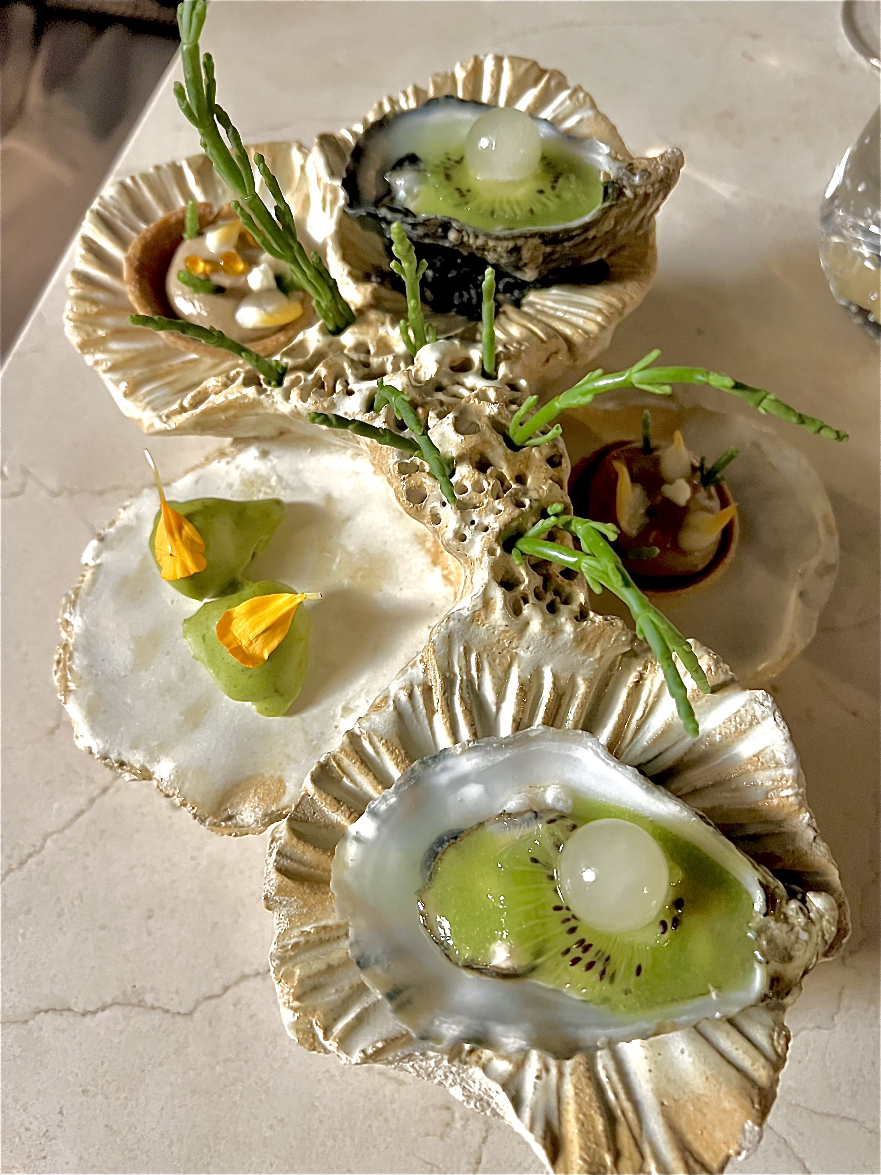 Le rocher … autour de la Méditerranée présente les amuse-bouches récréant l’univers marin, entre la roche et le corail, une pièce créée par la céramiste française Élodie Meirsman. Les bulots mayonnaise se revisitent d’une intense enveloppe estragon, qui apporte la pointe chlorophylle et équilibre l’iode. La tartelette ail noir est en texture caviar d’aubergine de sa fine pâte sarrasin. L’huître Kiwi se fait en premier temps douceur du Kiwi et se révèle de sa force marine d’une pointe noisette, la perle de yuzu vient éclater et balance le tout en bouche. Tout est efficacement en place.