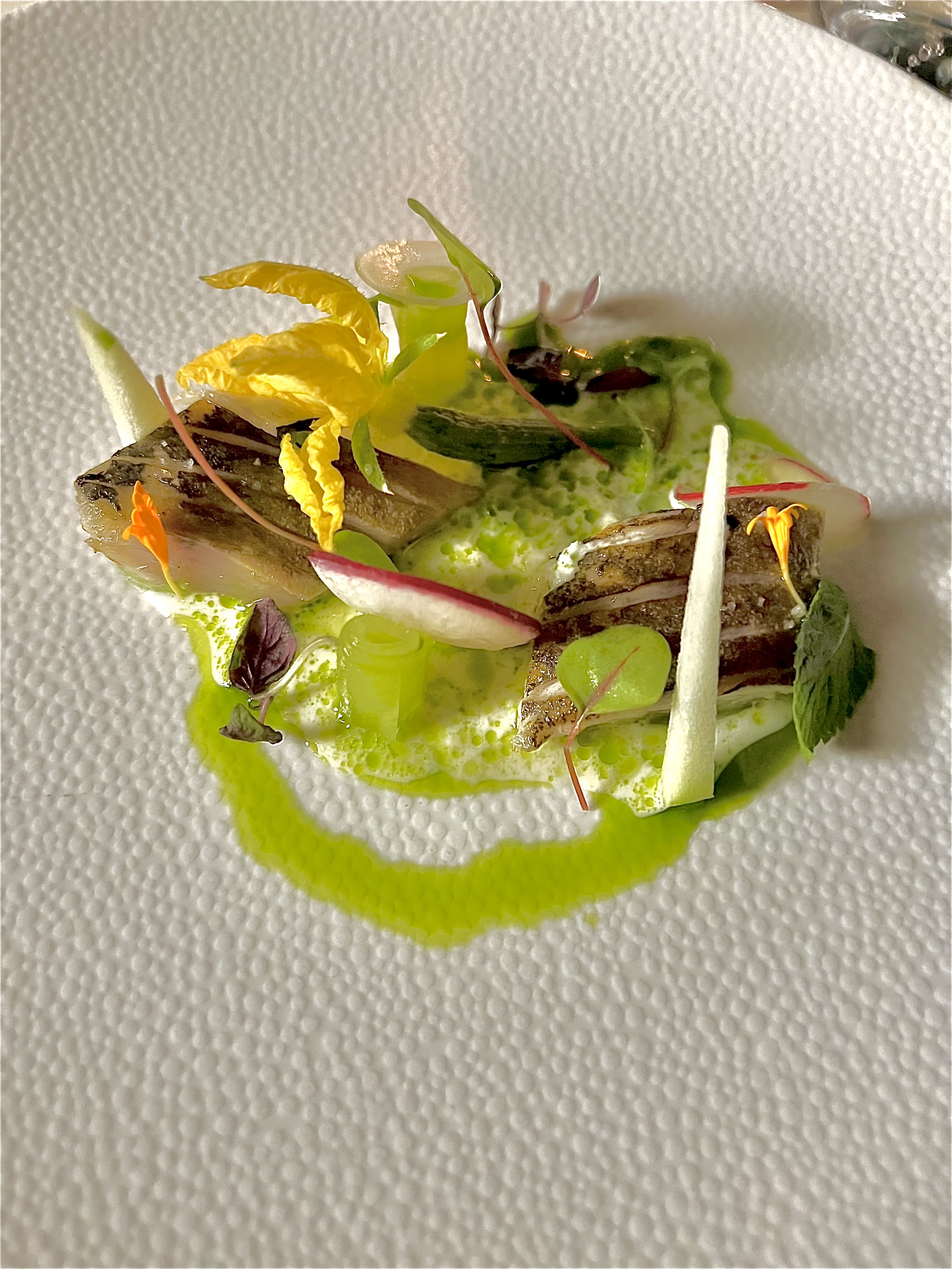 Le Saint-Pierre en écailles de pétales de fleurs de courgette, voile iodé de crevettes et verveine : une assiette au visuel délicat et poétique, tel un tableau gourmand de ce Saint-Pierre en parfaite cuisson, les crevettes pétrifiées de leur gel iodé et les délicats pétales de fleurs de courgette habillent ce noble poisson en élégance. La courgette est ainsi déclinée de toute sa fibre : la fleur farcie, cuite en fine vapeur, éclôt de citronnelle et de gingembre, la trompette du pays est travaillée en une fine mousseline d’une intense saveur vraie. Le jus de crevette en infusion verveine vient provoquer le tout à merveille, entre puissance et raffinement, et la fleur d’encre de seiche fait craquer cet exquis petit monde.