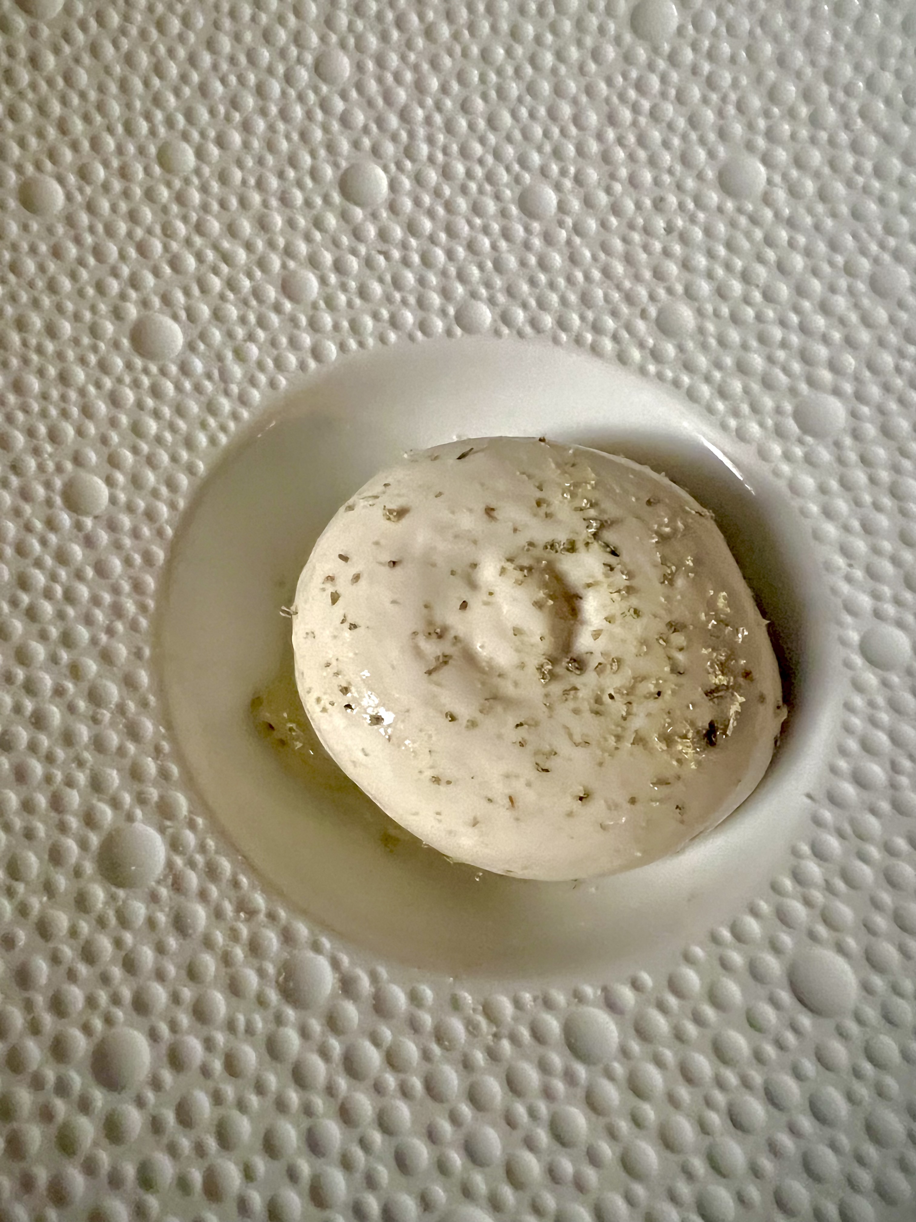 En pré-dessert de la mer, il propose en harmonie Algue en Ecume, qui est une parfaite transition. L’algue Konbu (un clin d’oeil au shot du début qui annonce la fin de cet opus marin) est travaillée en écume et est renforcée de fines tranches confites pour une mâche vive et claquante. La pomme Grany Smith, en émulsion et râpée, vient rafraîchir de son côté acidulé et mordant : un ingénieux, rafraîchissant et excellent rapport Terre-Mer de douceurs.