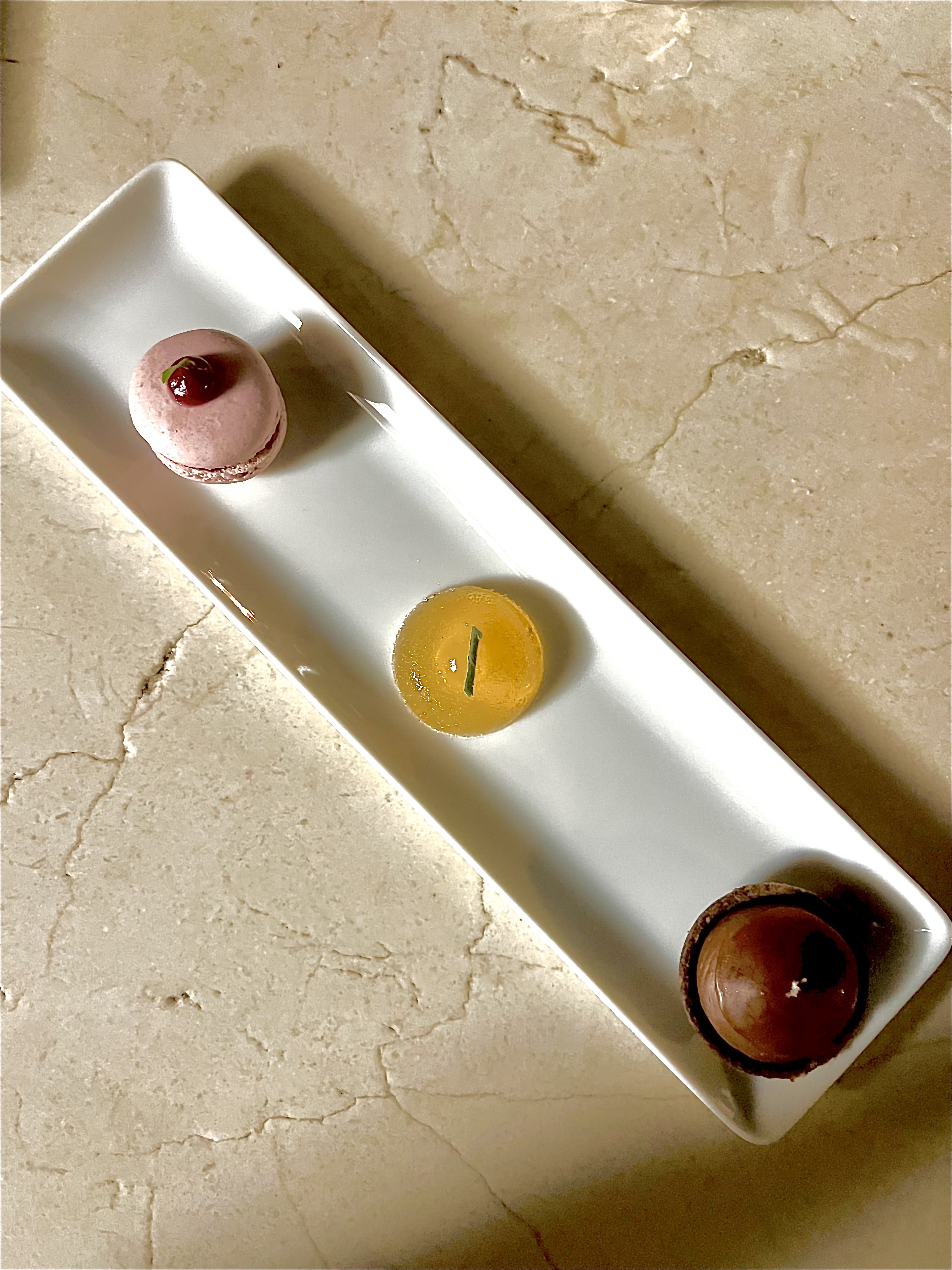 Les mignardises ont des notes régressives et enjôleuses, la tartelette chocolat cassis caramel est telle une barre Milky Way, la pâte de fruits citron sauge est en puissance du fruit et non saturée de sucre et le macaron framboise rappelle les biscuits de l’enfance Paille d’Or.