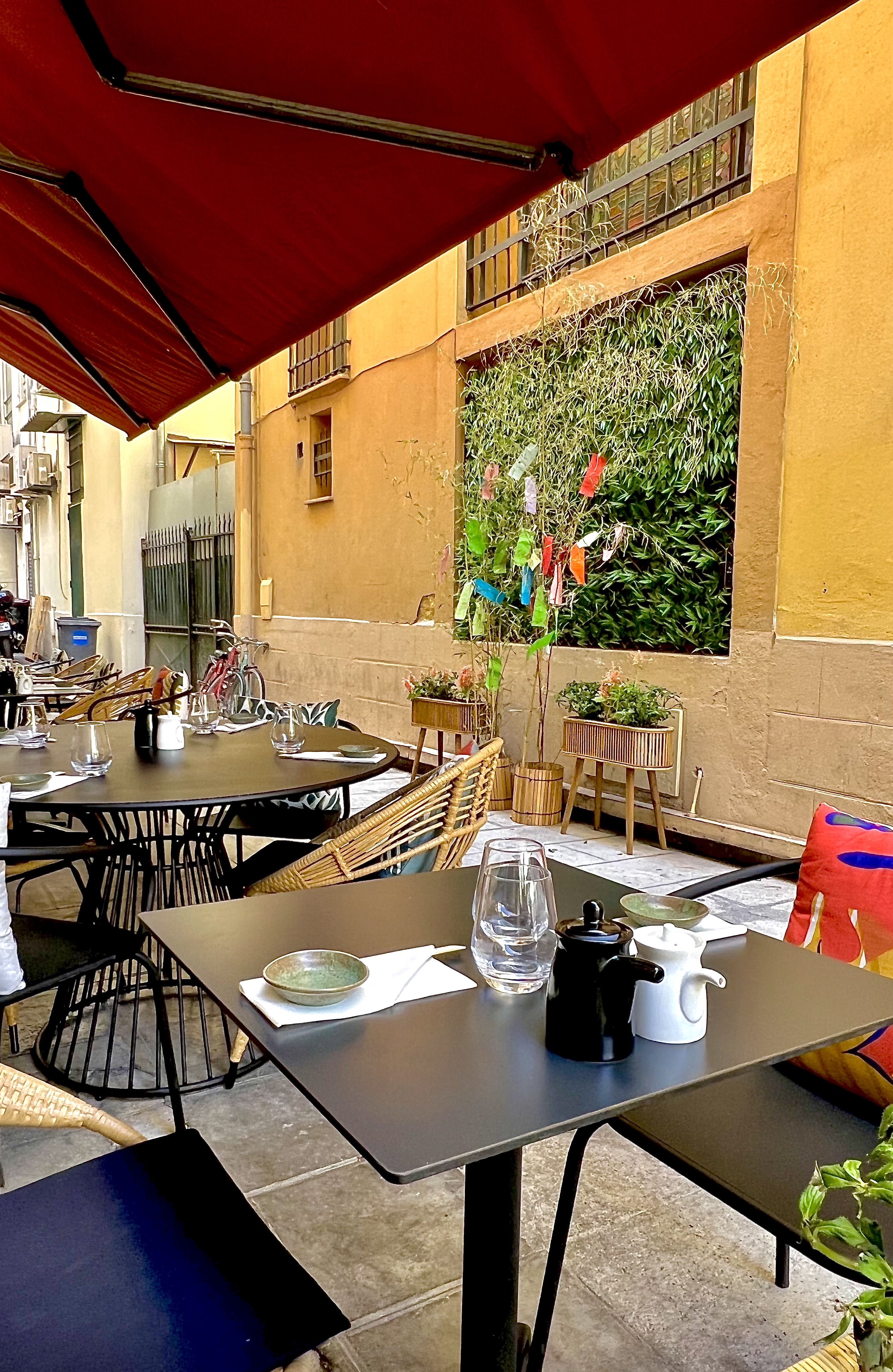 La salle, aux jeux de lumière et de miroir, le bois brun et les fresques encadrées apportent dynamisme et exotisme contemporain bien vu et élégant. La terrasse, les jours de beau temps, permet de déguster la cuisine du chef au calme de la petite impasse.