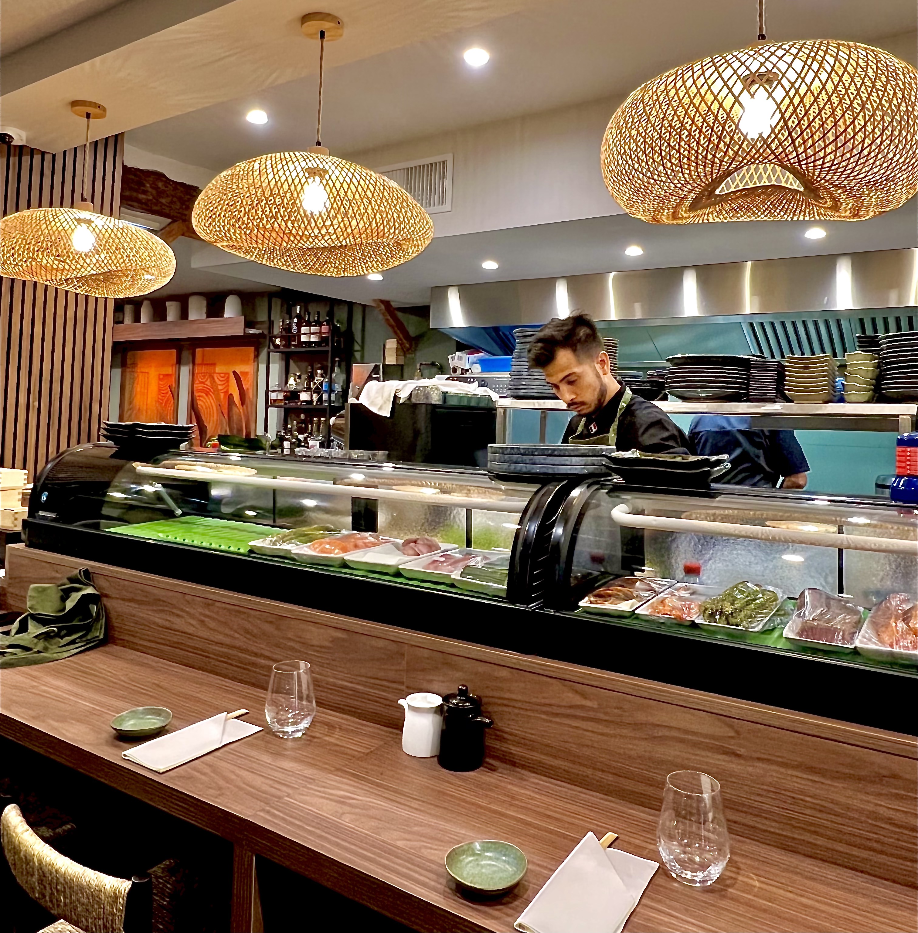 Poussez la porte et vous voilà à Tokyo, un franc et collégial « Irasshaimase » de l’équipe vous accueille. Le comptoir, en tradition, est idéal pour vivre les gestes précis et ciselés d’Alexis, qui vous propose les yeux pétillants de passion ses créations.