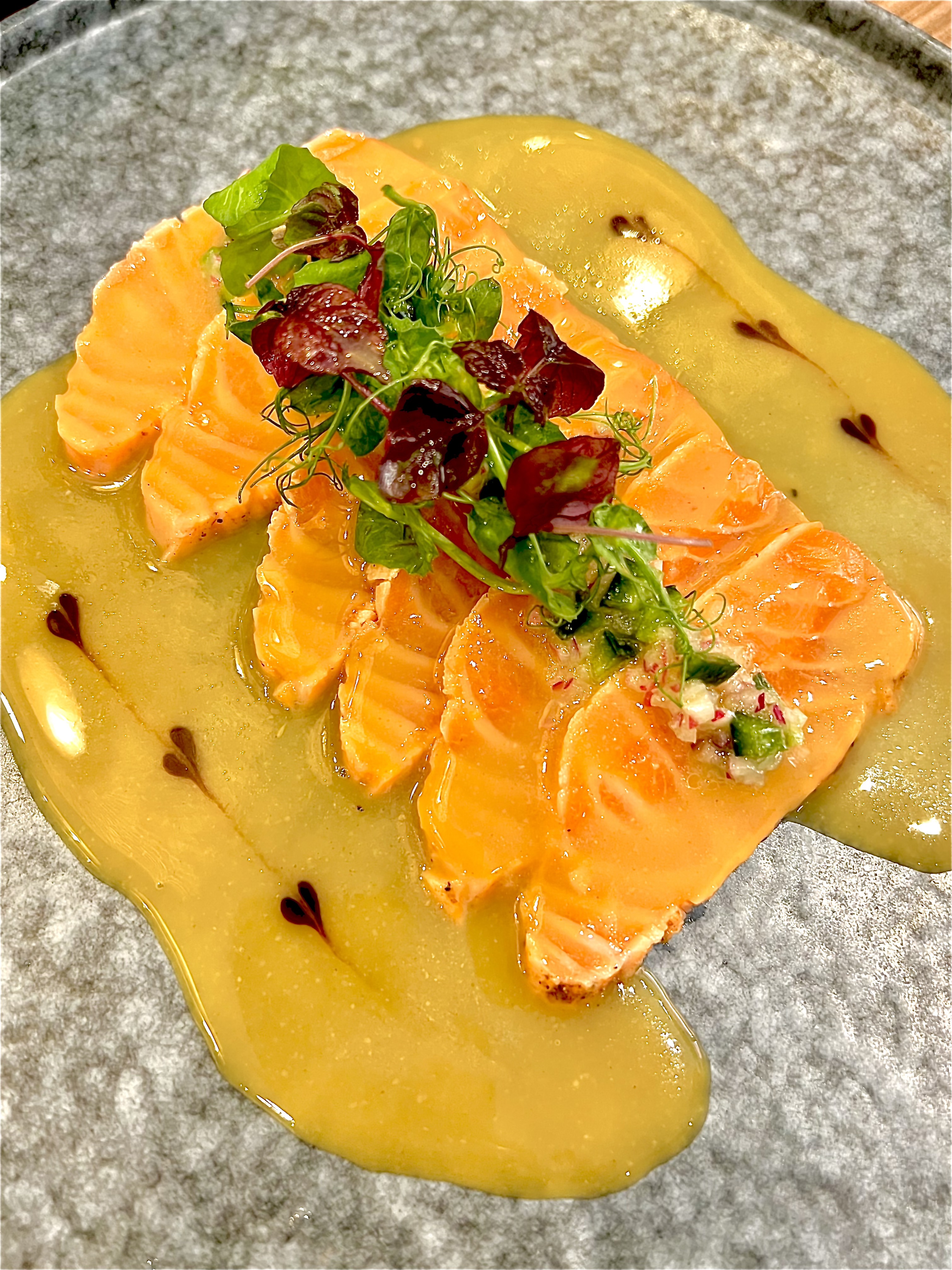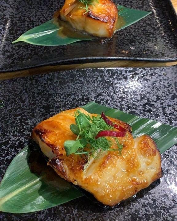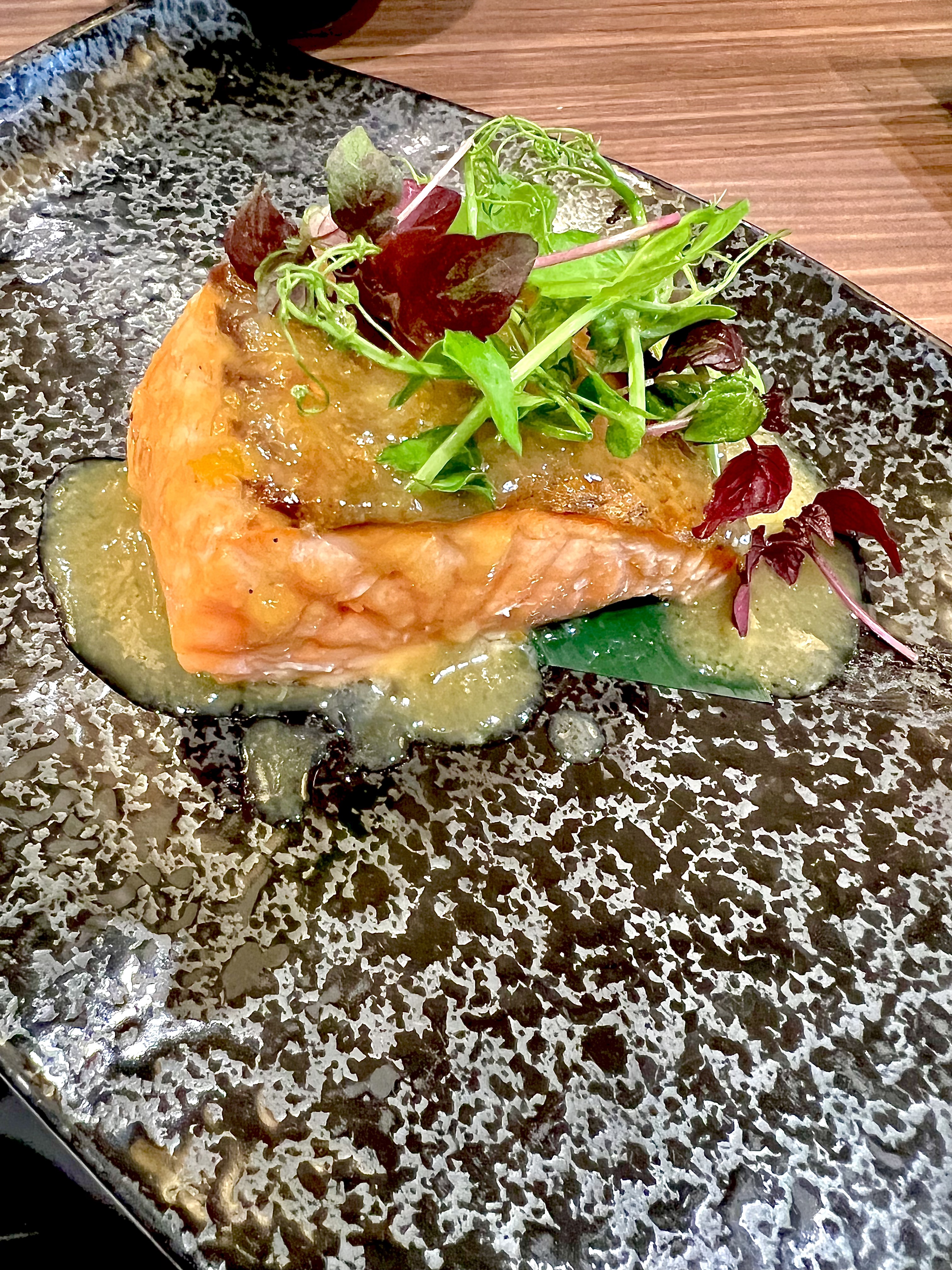 Filet mi-cuit de saumon, sauce yuzu miso : le saumon est fondant et se détache de délice, entre le cuit-cru, la peau croustille de saveurs et s’étoffe de la sauce yuzu-miso qui est percutante et enjôleuse.