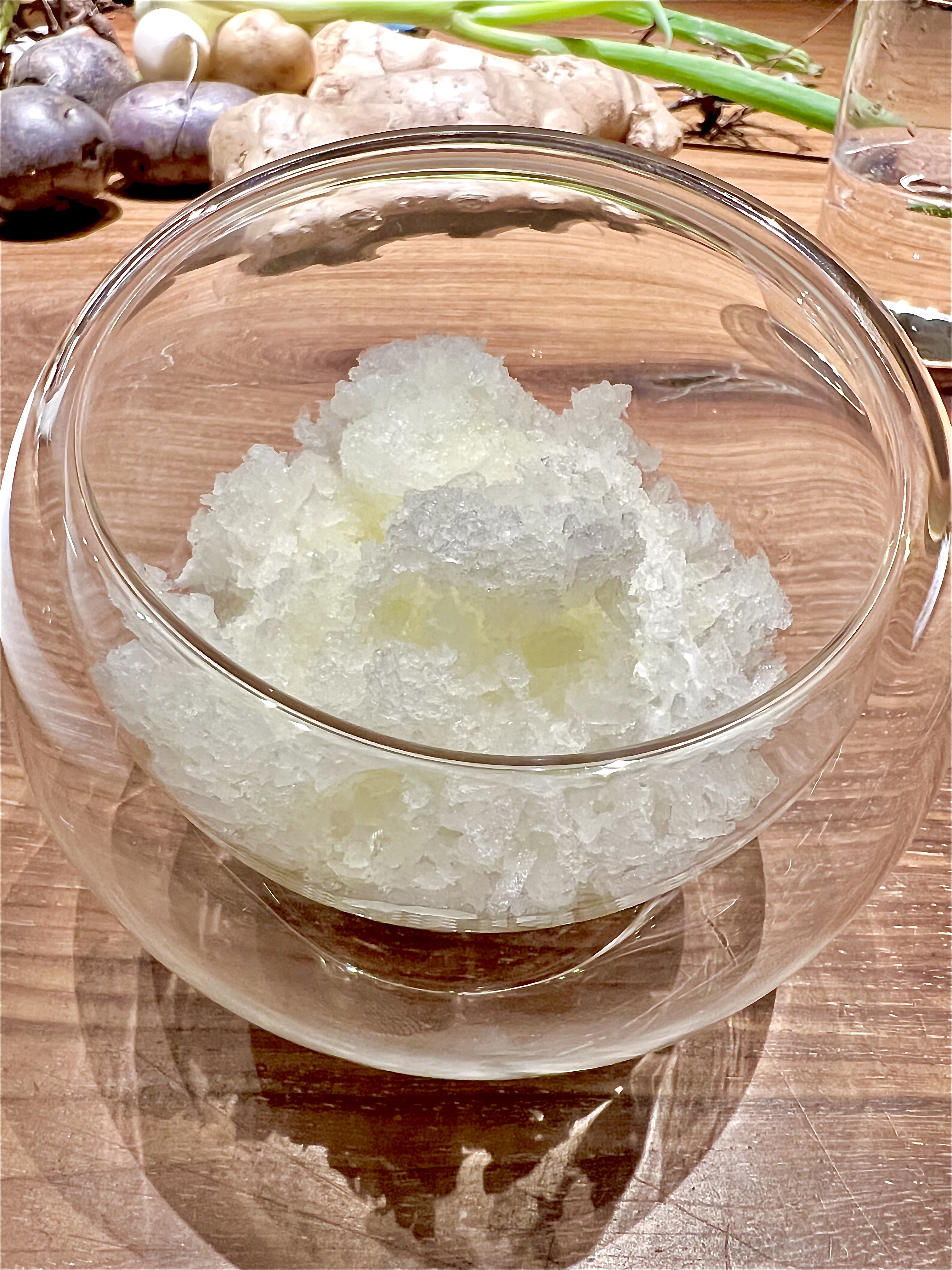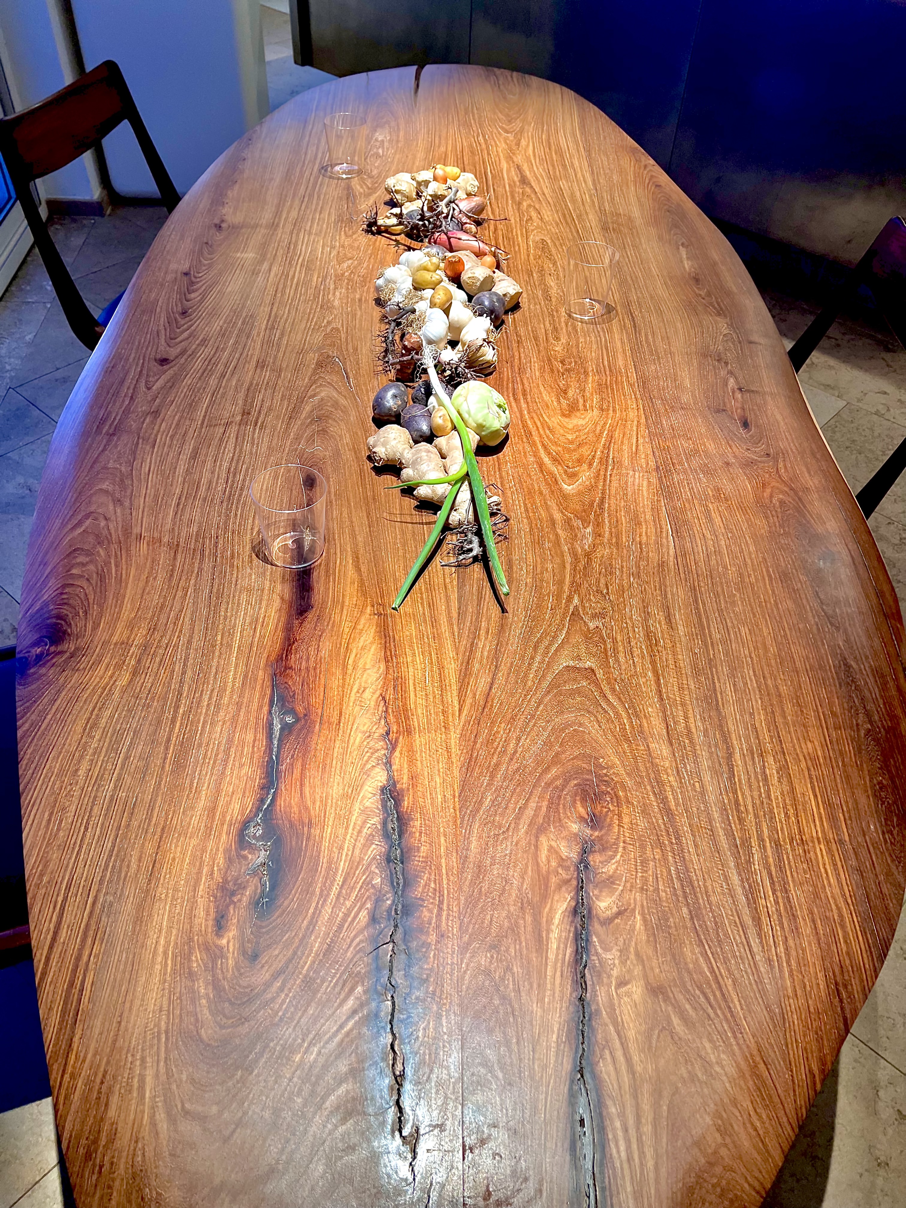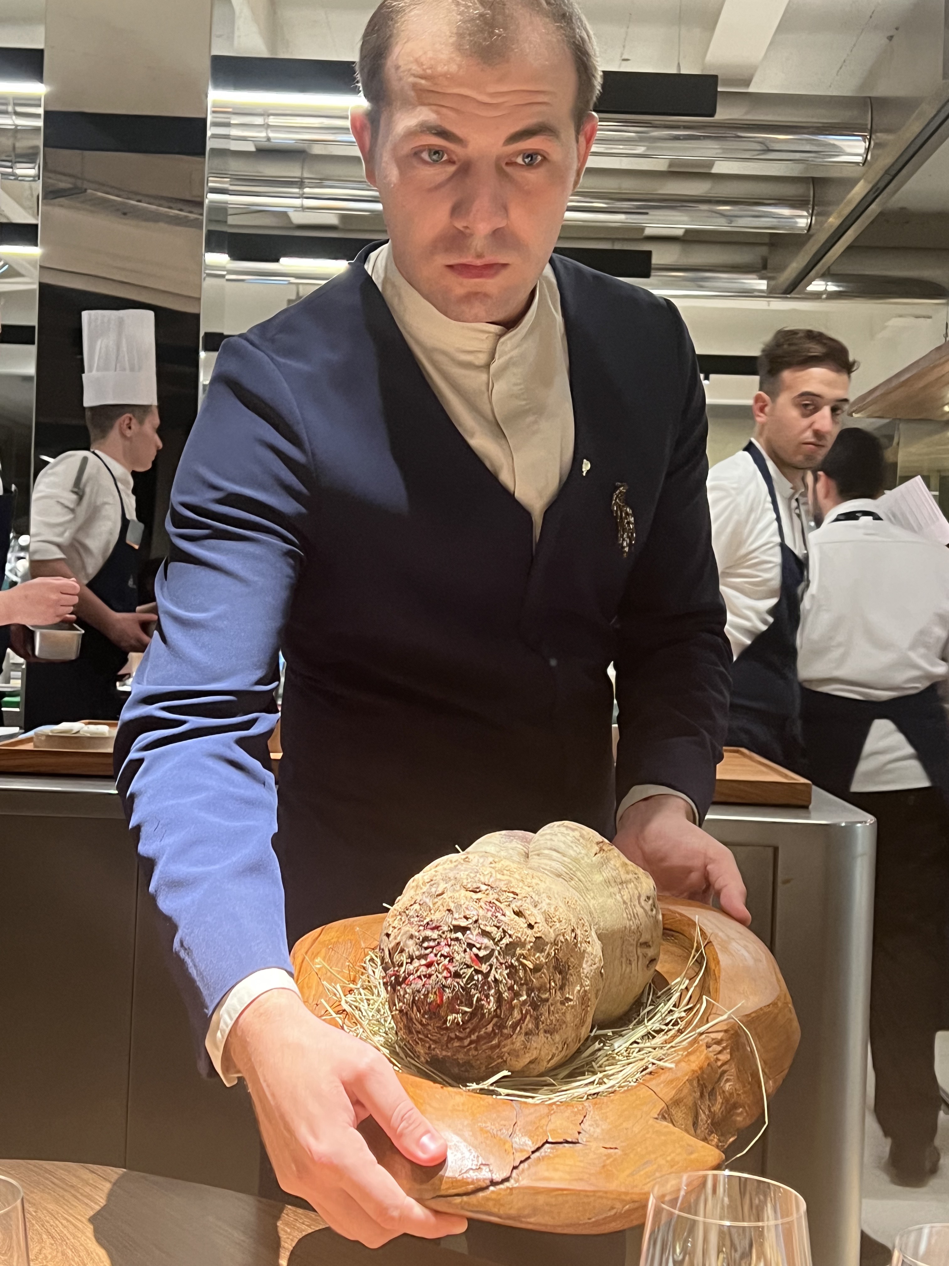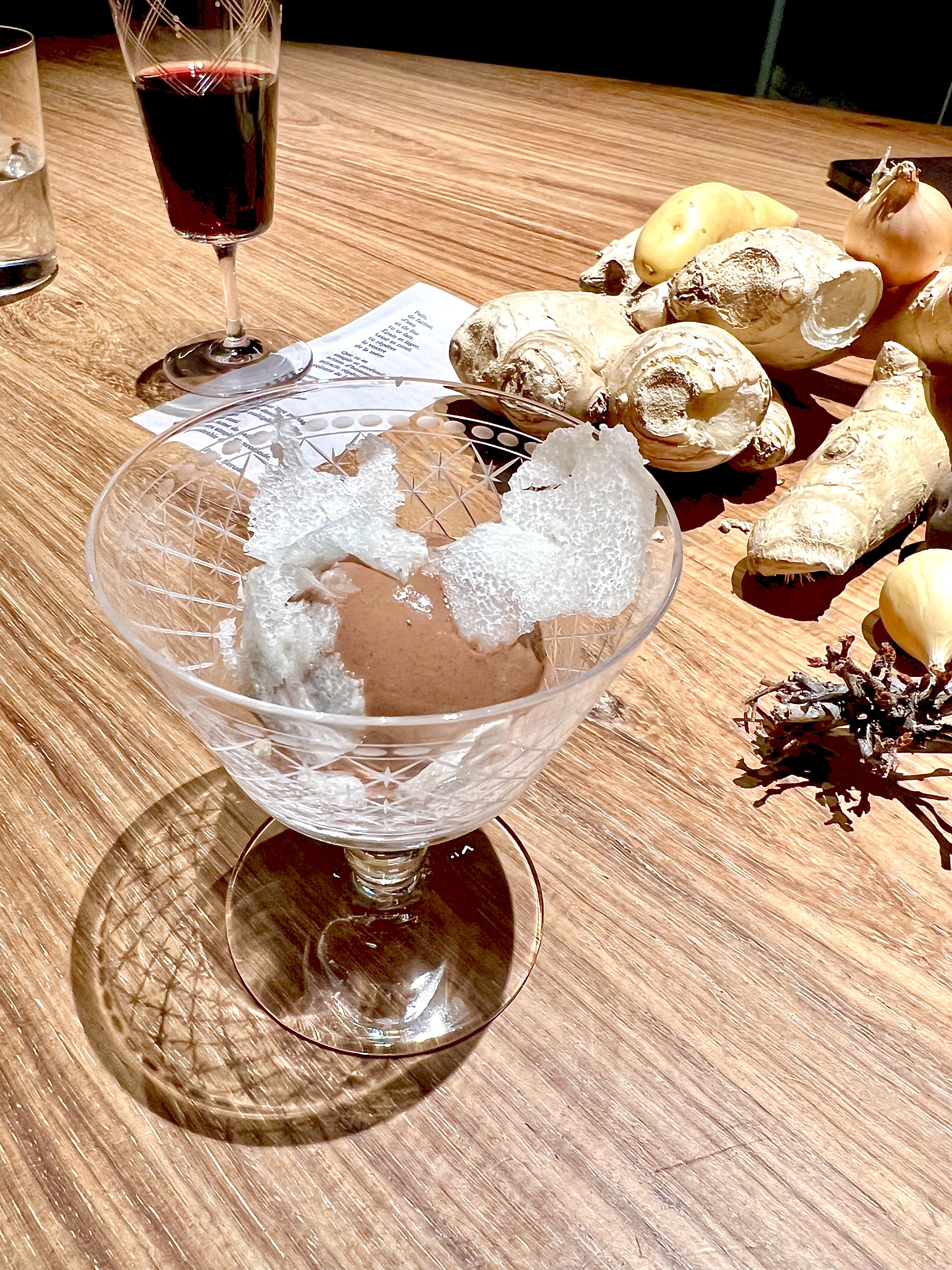 Vous voilà assis à cette table à la brutalité charnelle d’un bois noble, au touché sensuel et profond. Pendant que vous admirez, comme impressionné, cette ruche toquée qui ne bourdonne pas tant, on vous apporte à déguster une eau de carotte distillée. Cette eau est tel un rituel nettoyant de bienvenue, qui vous imprègne et vous enracine dans ce monde des Racines.