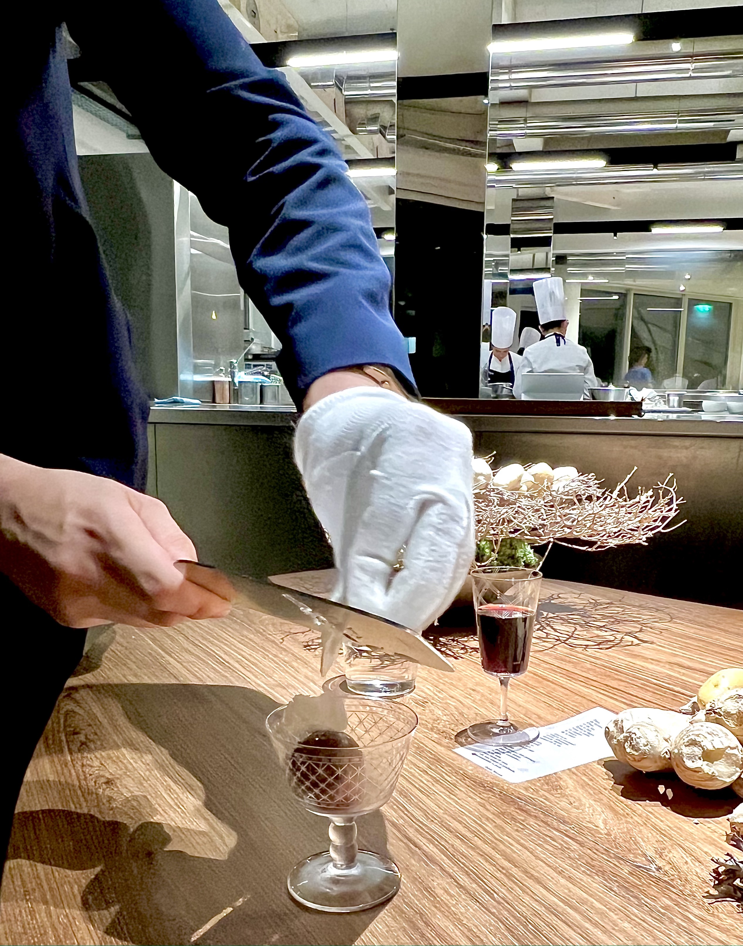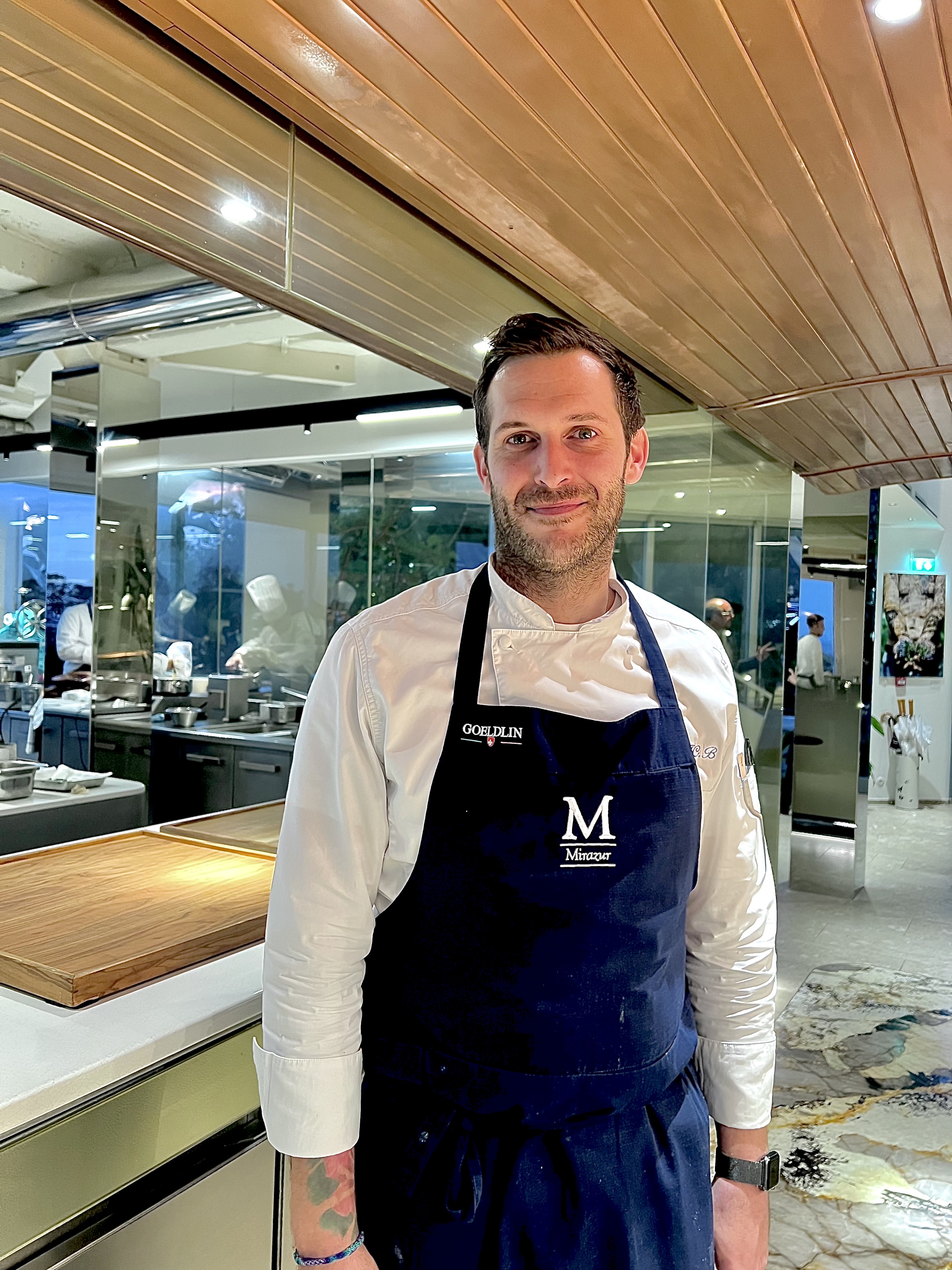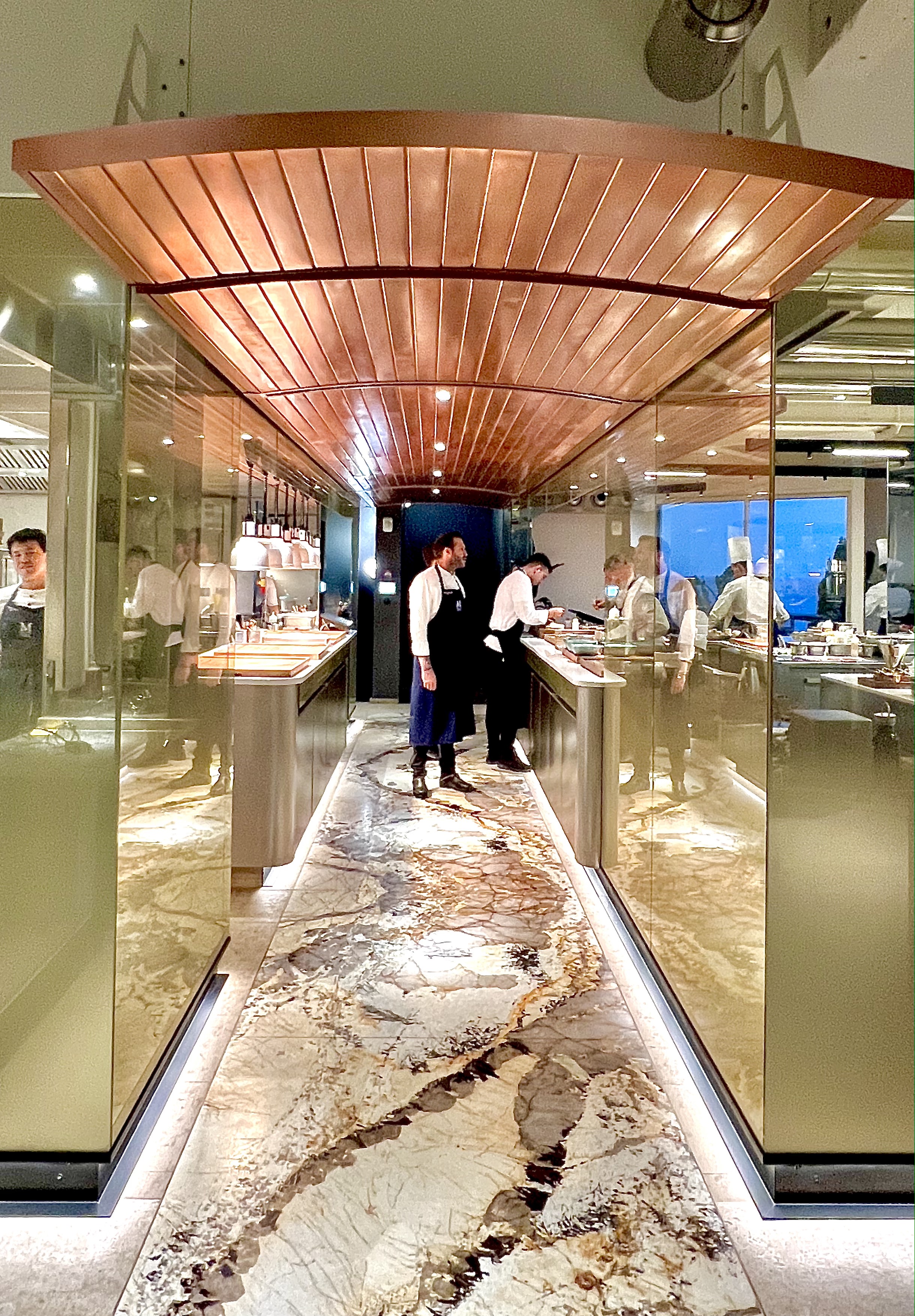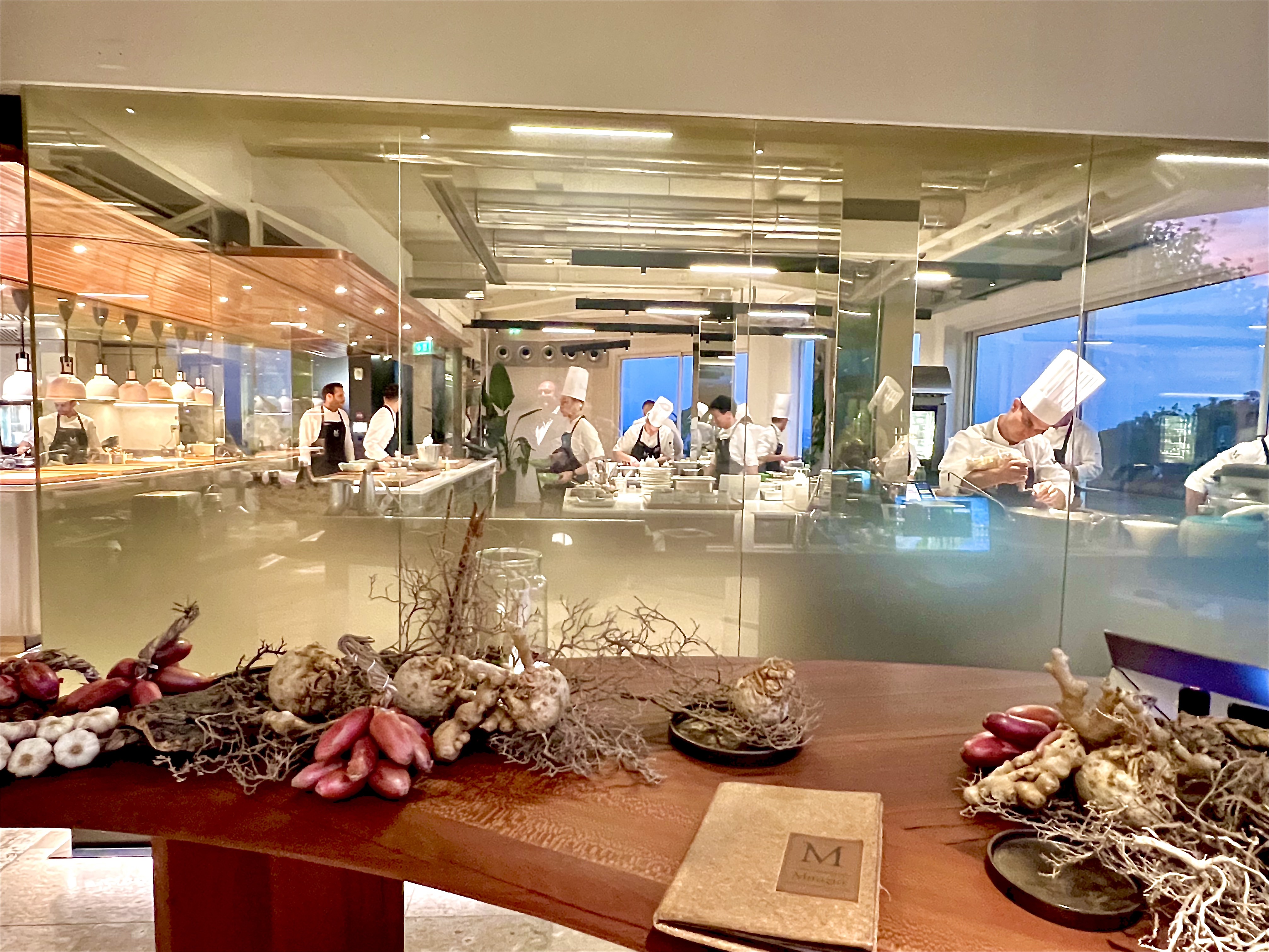 L’arrivée au Mirazur est toujours un moment tant attendu et ému, où l’on vous reçoit avec cette belle simplicité d’une humble fierté de vous accueillir dans ce microcosme de l’infiniment gourmand. Avant de vous installer à votre table, on vous invite à découvrir, en transparence de ses vitres, la nouvelle et sublime cuisine, où s’affaire la brigade dans une précision époustouflante au calme incroyablement monacal. La partition chaude d’un côté pour les cuissons et de l’autre la partition froide pour les amuse-bouches et les desserts sont délimitées d’une ligne d’un marbre rare de Patagonie, telle une rivière rythmant le sol de ses veines irrégulières.