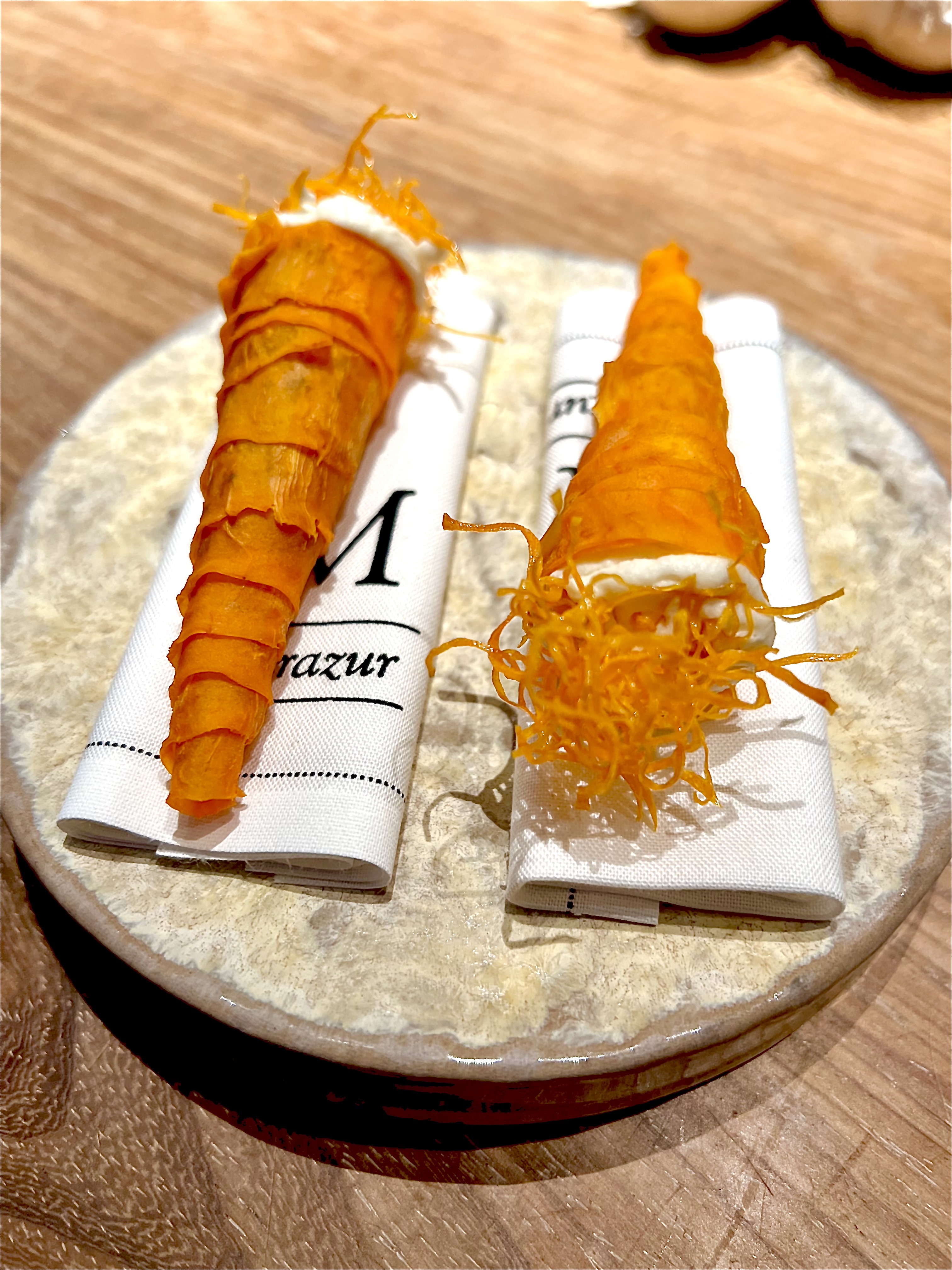 Pour terminer cette ode aux racines, les mignardises bouclent la boucle en minutieuse perfection, comme la truffe blanche du désert (truffe appelée également des sables qui se développe en symbiose avec les racines des arbres) sorbet cacao, la pâte de fruit au gingembre, la truffe au chocolat et à la carotte, la tartelette patate douce et chêvre, sans oublier le churros de topinambour à tremper dans un dulce de leche de topinambour.