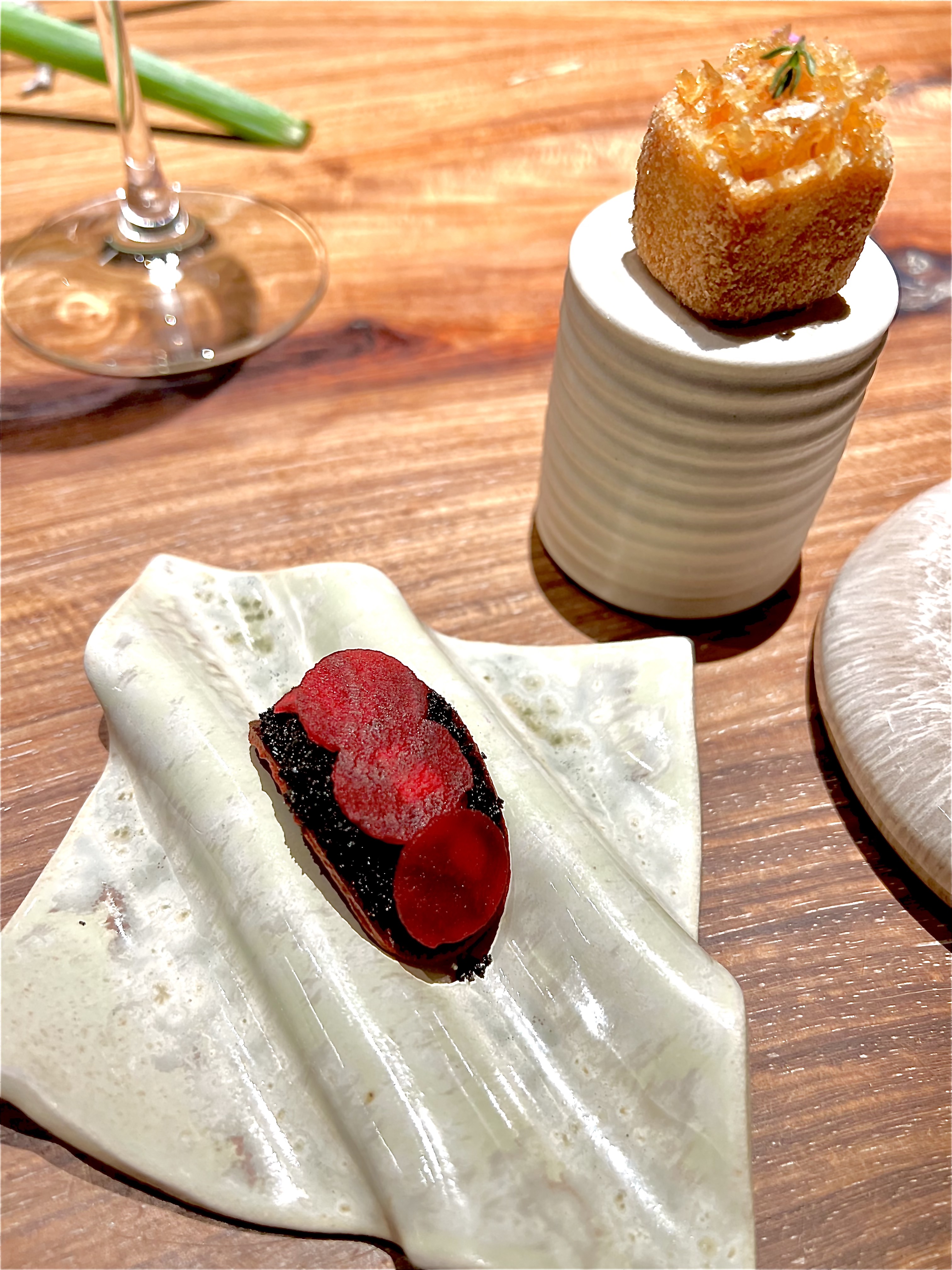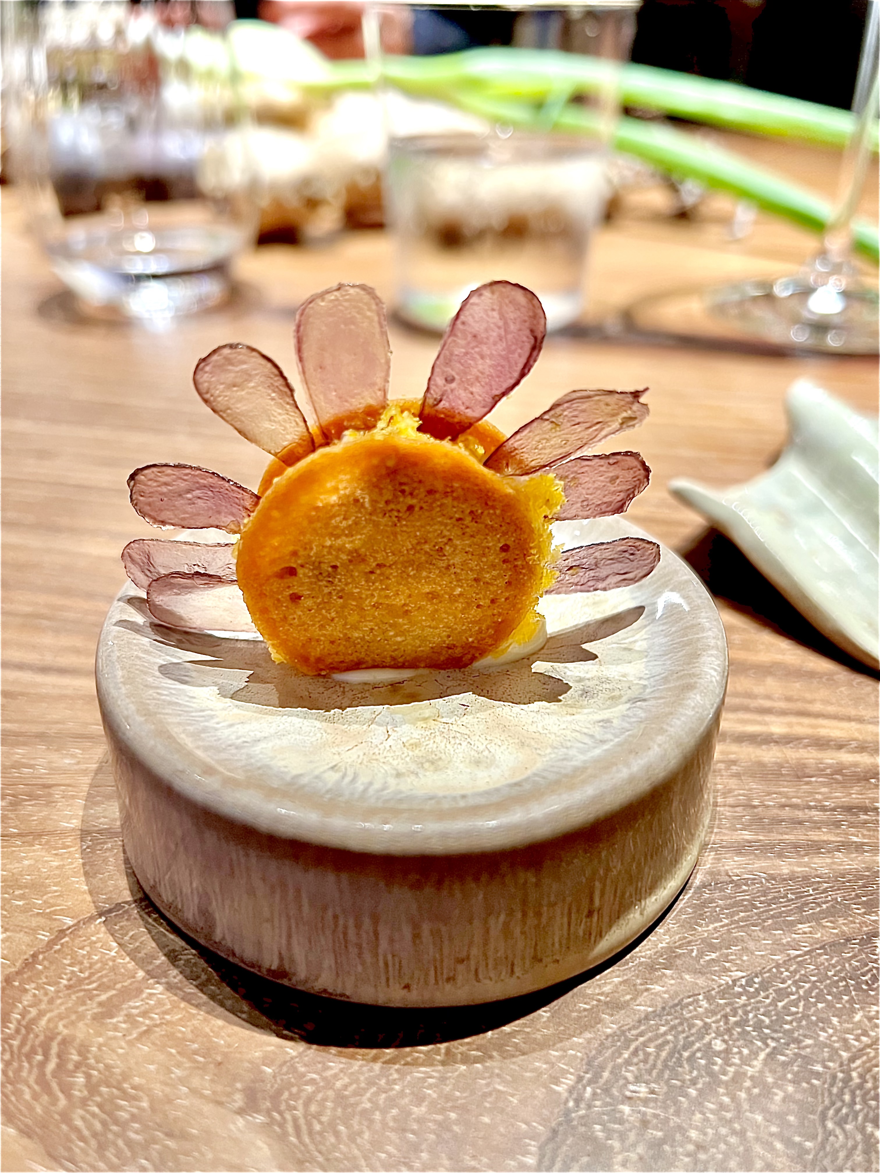 Les amuse-bouches, tels des bijoux de délices enivrants, arrivent par enchantement de toute part. La tartelette est une déclinaison des carottes avec ce côté très terre à terre et concentré en bouche, qui se relève du cumin. Le « soleil » de parmesan au visuel délicat est en transparence de ses pétales de pomme de terre violette cristallisés, il est engourmandisé d’une mayonnaise câpres, olives et anchois. Le Tacos de betterave craque de son identité sucrée, allégée d’une pointe vinaigrée et rehaussée du charbon végétal qui lui délivre une finalité fumée. Le cube de panais se crème de comté 36 mois et croustille des oignons frits et le cône de patate douce se iode en douceur d’une crème d’anguille fumée. Voilà une mise en appétit absolument brillante.