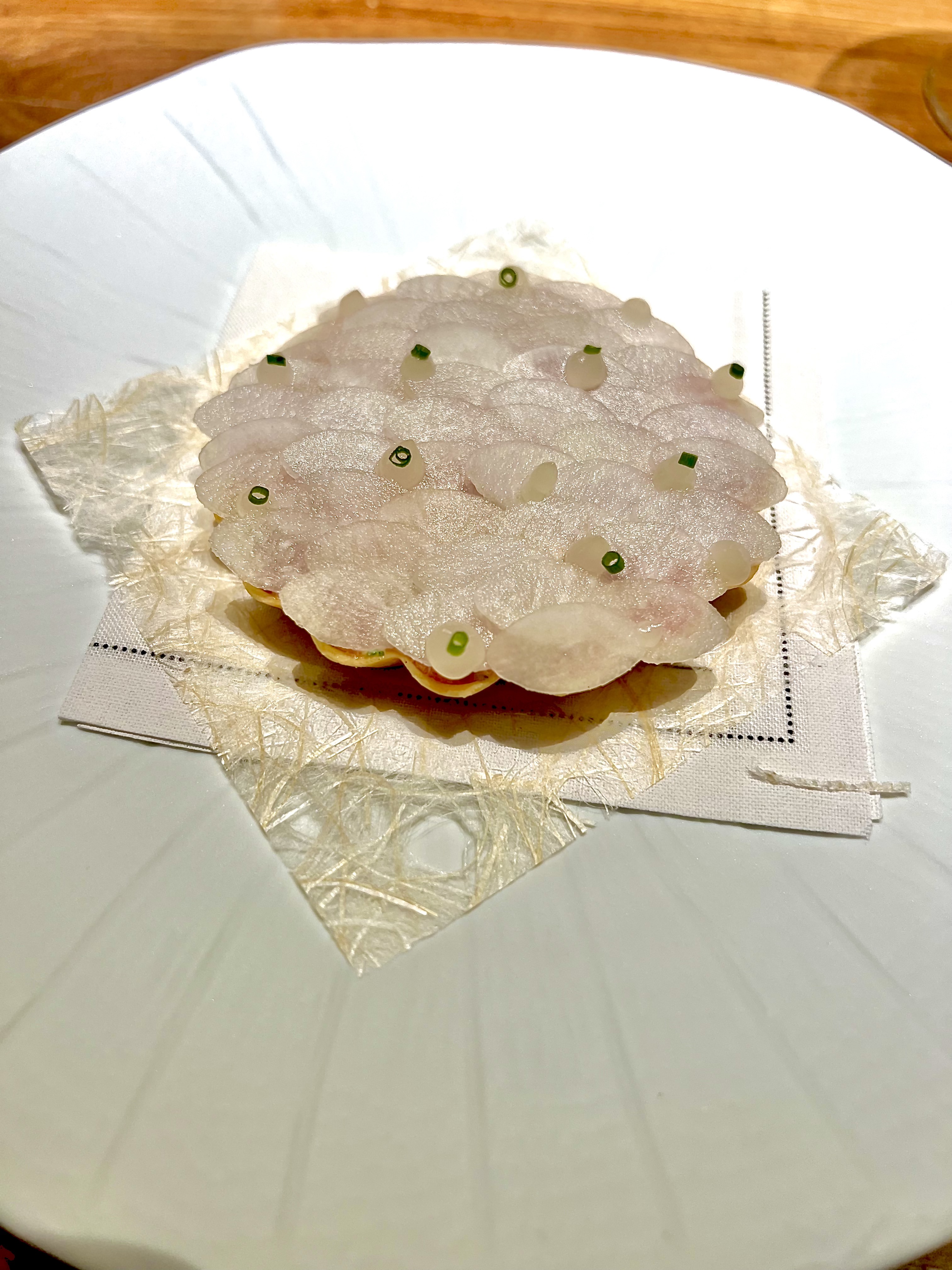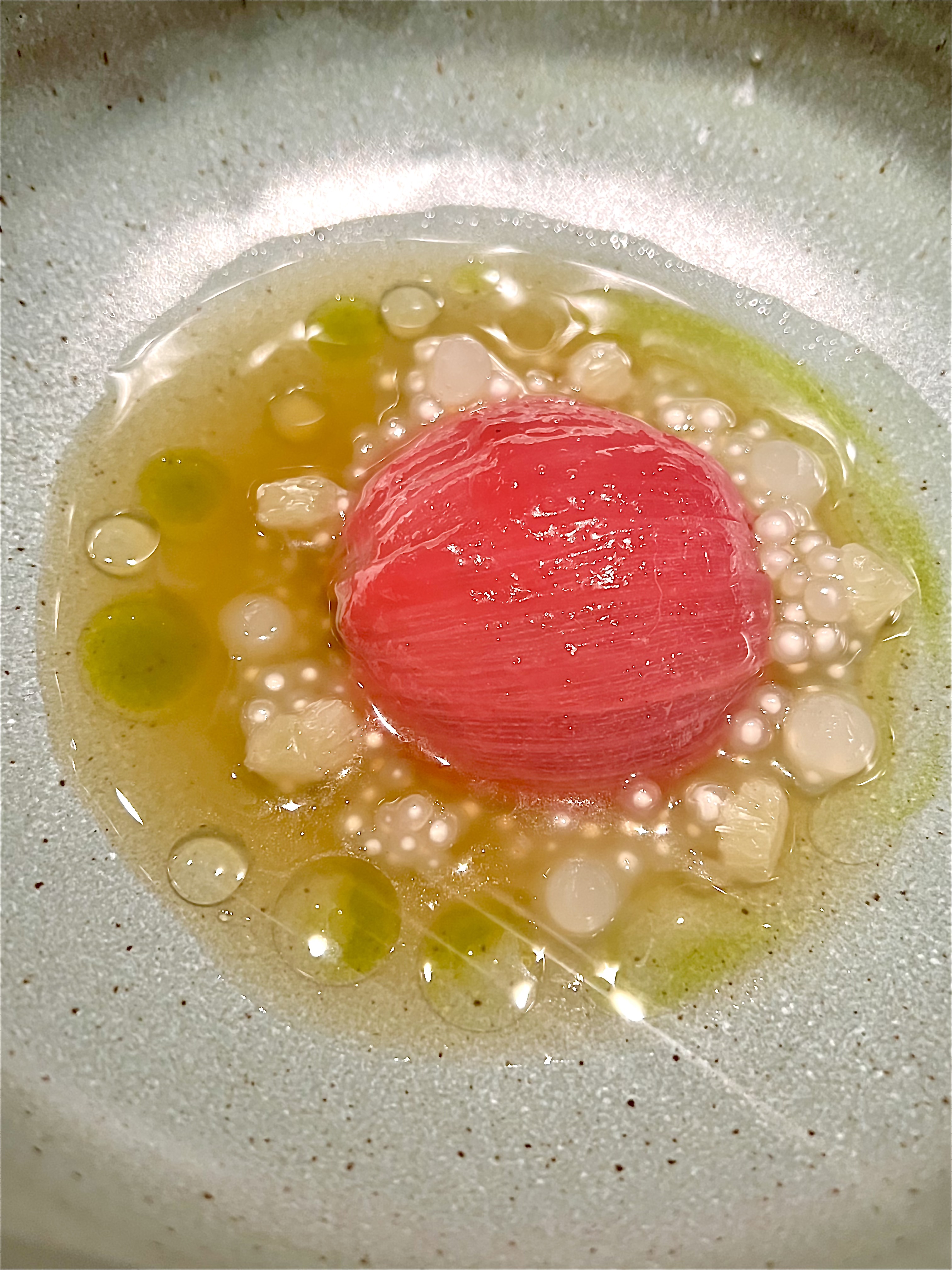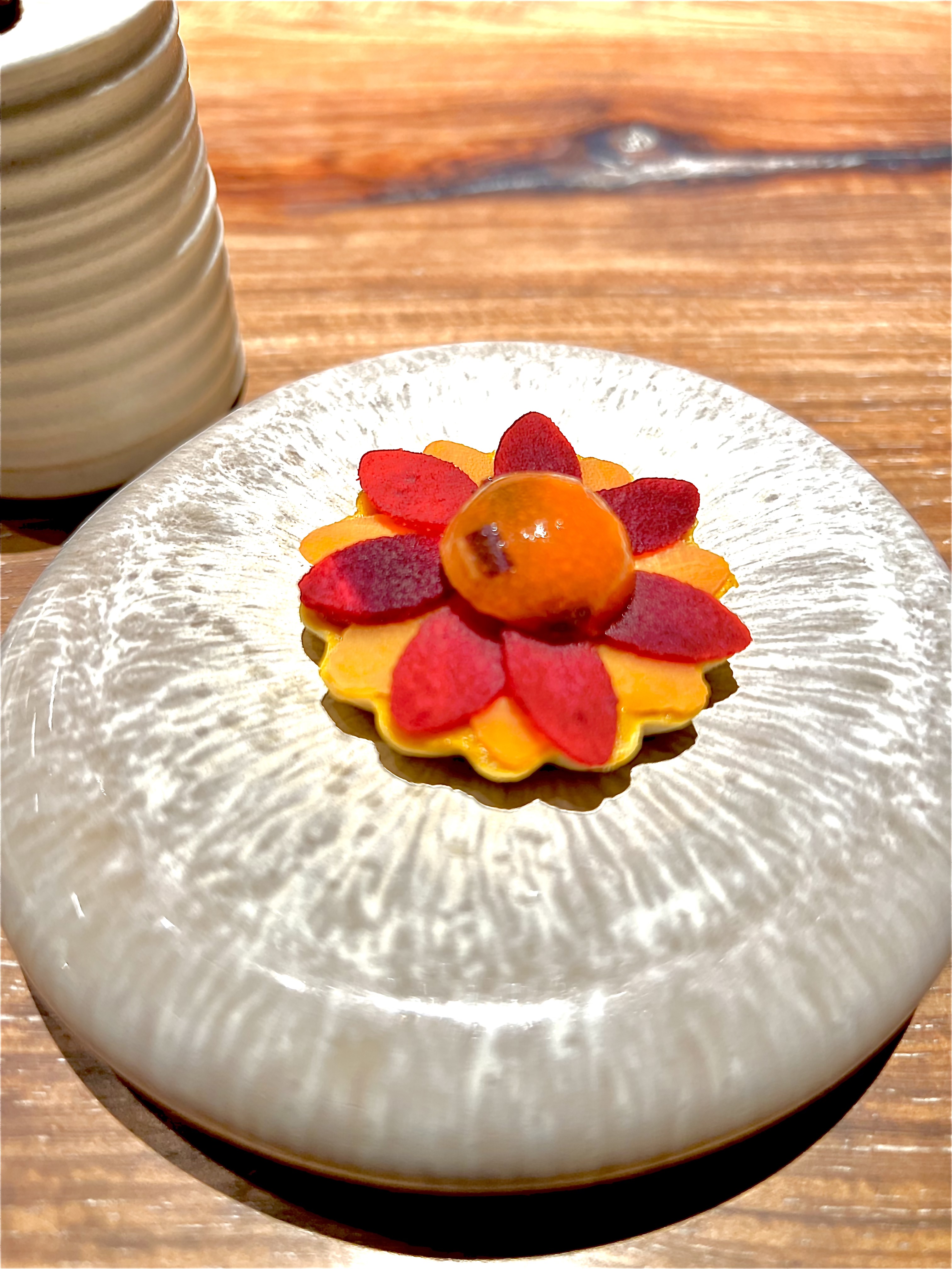 L’opus « Racine » commence pleinement avec l’Oignon Rose de Menton et Gamberoni : cet oignon, presque oublié et perdu, qui a la douceur de vivre de Menton d’une couleur presque rubis, scintille d’excellence de sa suavité, il est farci en raffinement d’iode des inoubliables crevettes de San Remo à la saveur, si unique, de homard. Le bouillon de citronnelle se dimensionne d’un gel d’oignon repulpé de gingembre, qui vient secouer les papilles en parfait équilibre. Les perles de tapioca et les pickles d’oignons grelots texturent avec raffinement la dégustation. C’est à la fois doux, punchy, rassurant, tous les éléments s’étoffent les uns avec les autres magistralement.