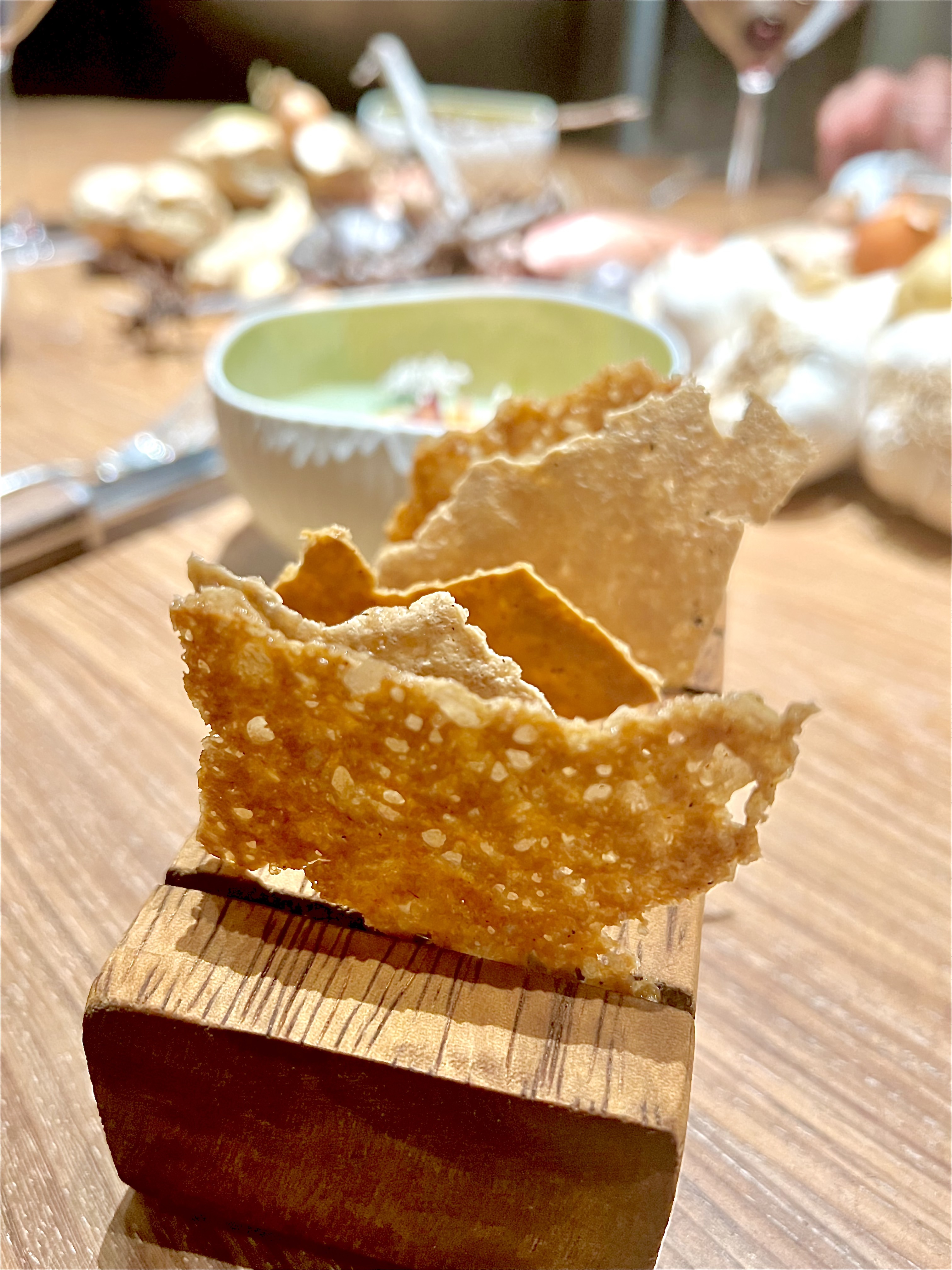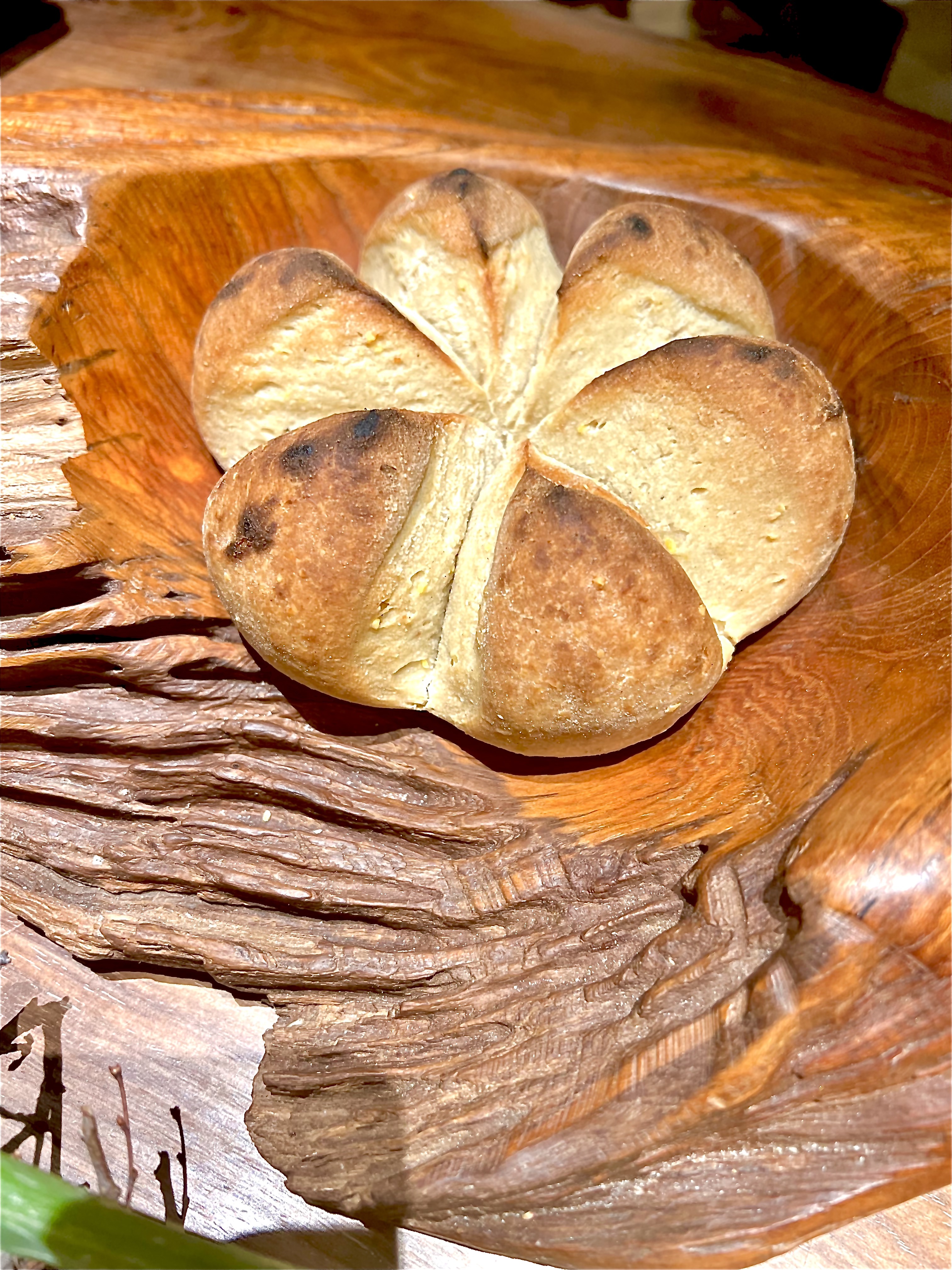 Le pain de partage, déposé dans un plat en bois d’olivier, est d’une gourmandise addictive, la recette venant de la grand-mère du chef est respectée dans la tradition de générosité, ici pétri avec le beurre. Ce pain de plaisirs délivre un parfum intensément beurré, qui pourrait rappeler un plat de coquillettes ou les réconfortants goûters d’autrefois. Ici, il se trempe dans l’huile d’olive parfumée au citron de Menton de l’Huilerie Saint-Michel.