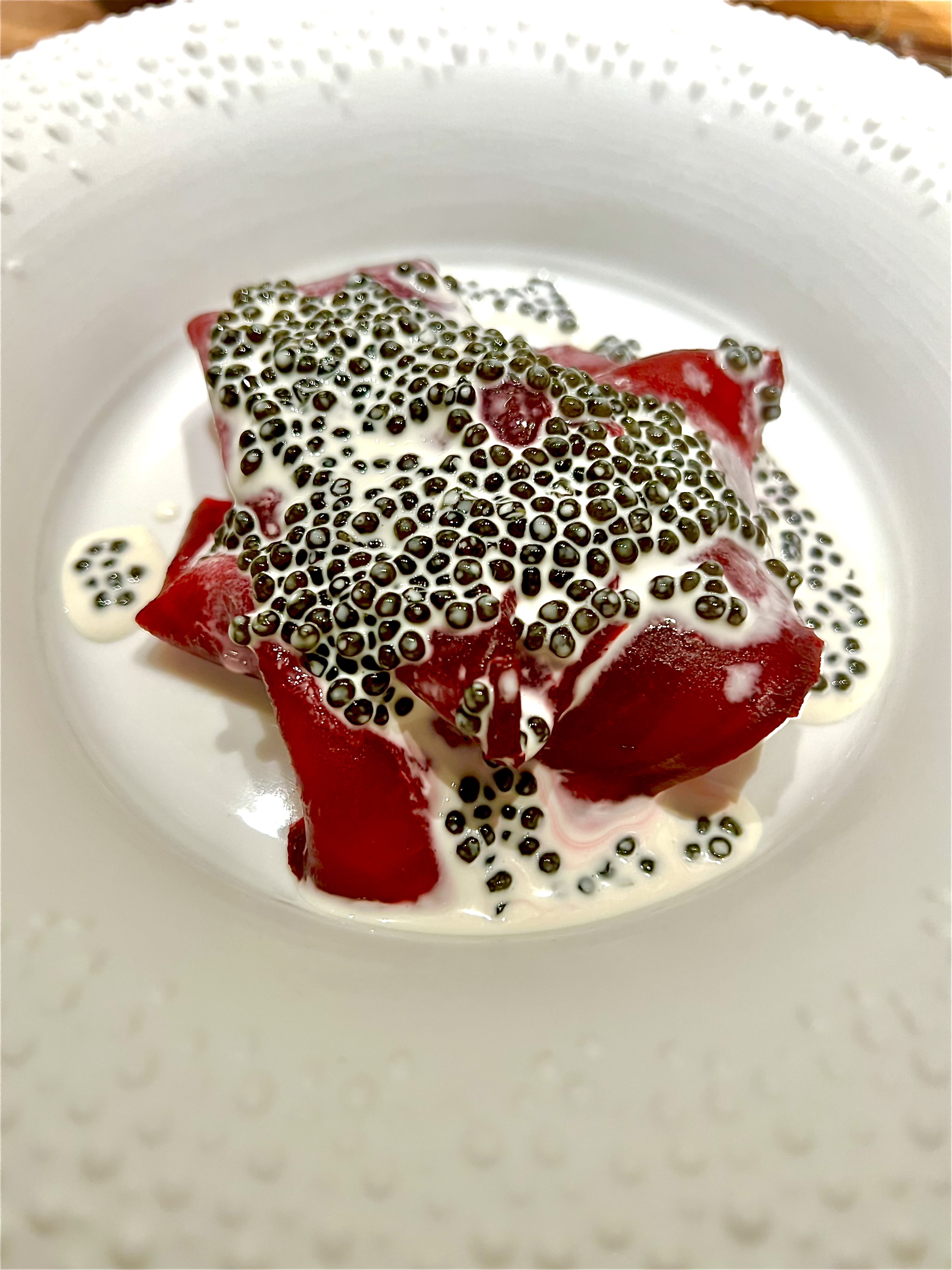 Betterave et Caviar : dès la première bouchée, vous comprenez pourquoi ce plat est emblématique du Chef! Vous voilà sans voix, mais les larmes apparentes de bonheur de ce choc de deux mondes, entre la douce brutalité terrienne de la betterave crapaudine et la finesse noisettée marine du caviar. Folle simplicité en surface d’un travail profond et ancré, cette ancienne variété de betterave est d’abord récoltée, puis hibernée en chambre tempérée durant l’hiver et replantée au printemps. Après la seconde récolte, elle est cuite en croute de sel pour l’intensifier et se nourrir de ses propres saveurs. Servi en fin carpaccio rubanné, la betterave associée à la crème de caviar, se délivre de toute sa constance, entre finesse, texture et température. C’est simplement sublime!
