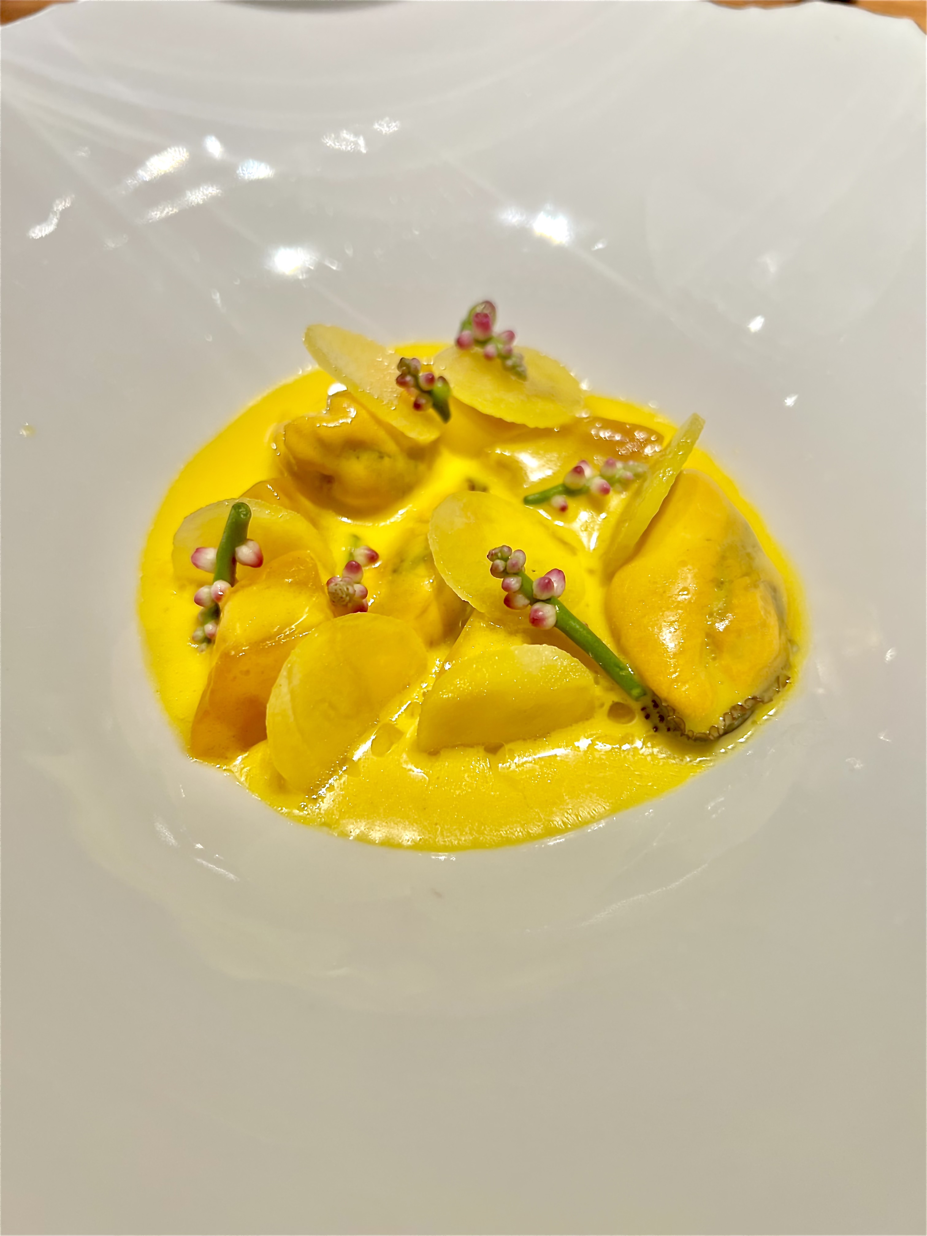 Betterave Jaune Moules, Safran, cette variété de betterave, moins sucrée, est apprêtée en différentes textures : à cru en tranches, en ravioles, et en crémeuse sauce au curry qui s’associe aux moules de Camargues à la belle cuisson. Un plat qui revisite la tradition des moules au curry dans une délicate et sincère modernité acidulée, tout en gardant la réconfortante gourmandise. Les fleurs d’épinards Malabar viennent pulser de leur fraîcheur poivrée.