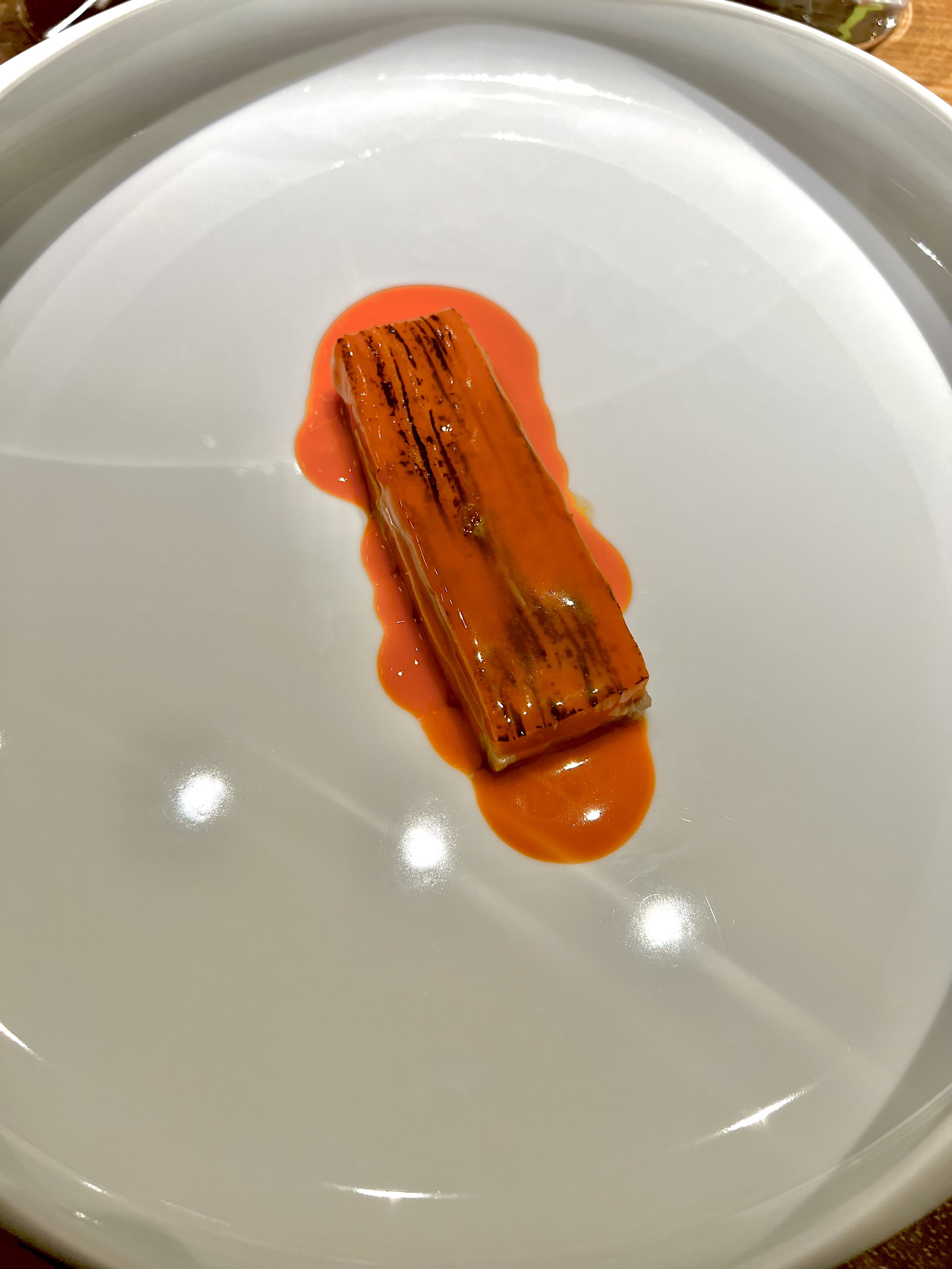 Carotte Porc Ibaiama, netteté maximale de cette assiette enivrée de carotène. Ce noble et précieux porc, nourri dans son Pays-Basque natal, est d’une saveur souple et riche, à la chair fondante de son gras salutaire. La sauce carotte le rougit dans une félicité épanouie. Tout se garde, rien ne se perd, le cochon est travaillé dans toute sa valeur : la salade de carotte s’encanaille de pied de cochon en fines lamelles, de kumquat en acidulé et de fleurs de fenouil en fraîcheur anisée et la peau du cochon frite servie à côté se fait chips, rappelant les Chicharrónes.