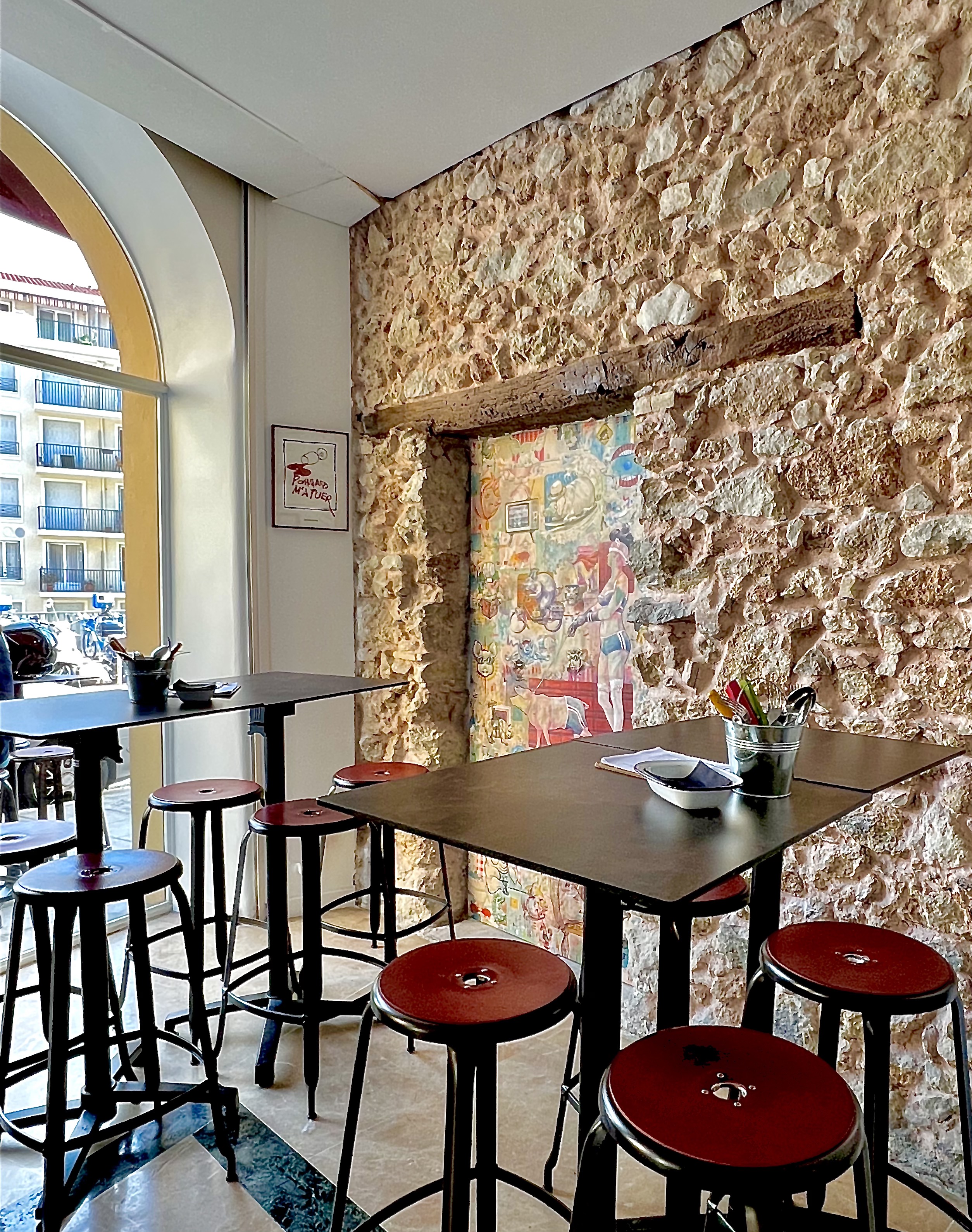 C’est cette identité qu’Alexandra et Gautier ont souhaité donner à leur premier restaurant où les petites assiettes de hors-d’oeuvres (cuisinées comme de véritables petits plats, avec des produits frais et de saison, venant de fournisseurs et d’artisans responsables) se partagent, s’échangent avec passion, délice et sans façon. La charcuterie et les cochonailles d’exception viennent de chez Louis Ospital, artisan charcutier au Pays-Basque, les légumes de l’exploitation familiale cannoise Jean-Charles Orso, le pain à la farine de blé ancien Pétanielle Noire de Nice est celui de Michel Fiori, sans oublier les bières artisanales de Berre les Alpes de La Brasserie Berroise et la distillerie Cazottes reconnue par les plus grands chefs pour leurs eaux-de-vie comme celle de Petit Epeautre.
