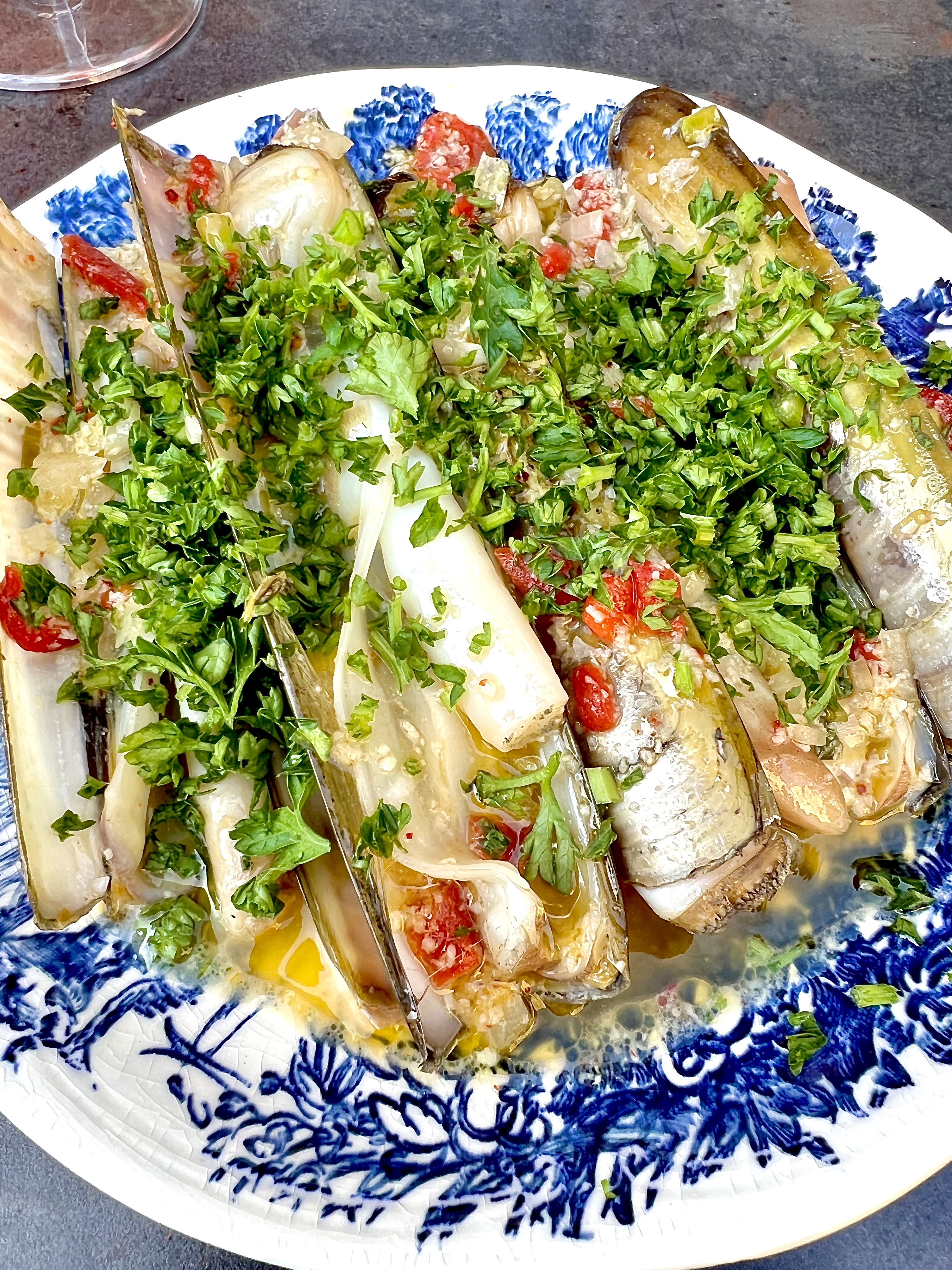 Les Couteaux en persillade ont la belle mâche et cette vivacité iodée qui vous emporte dans sa vague, le beurre citronné et les petits dés de poivron tiltent les papilles de concert.