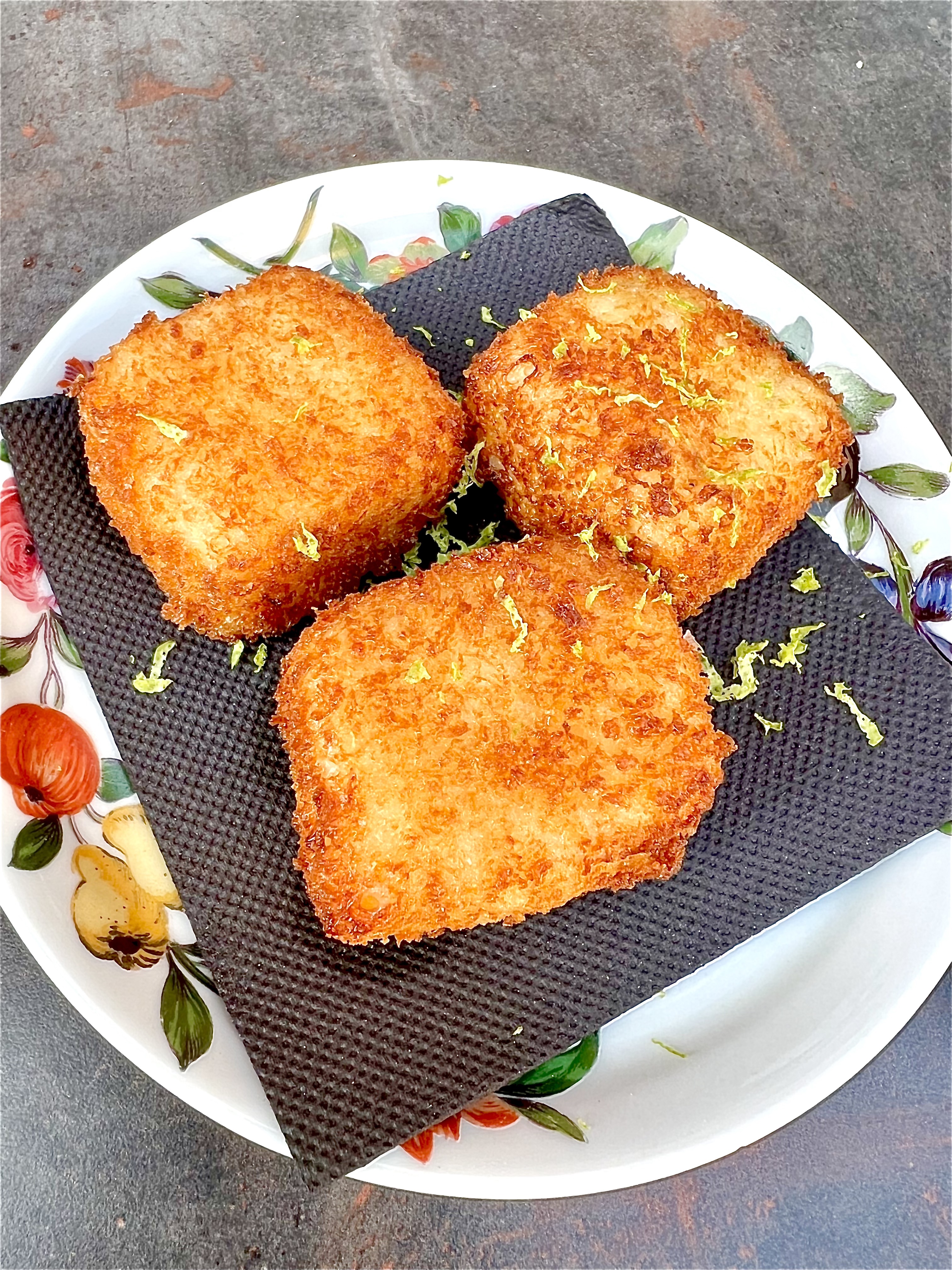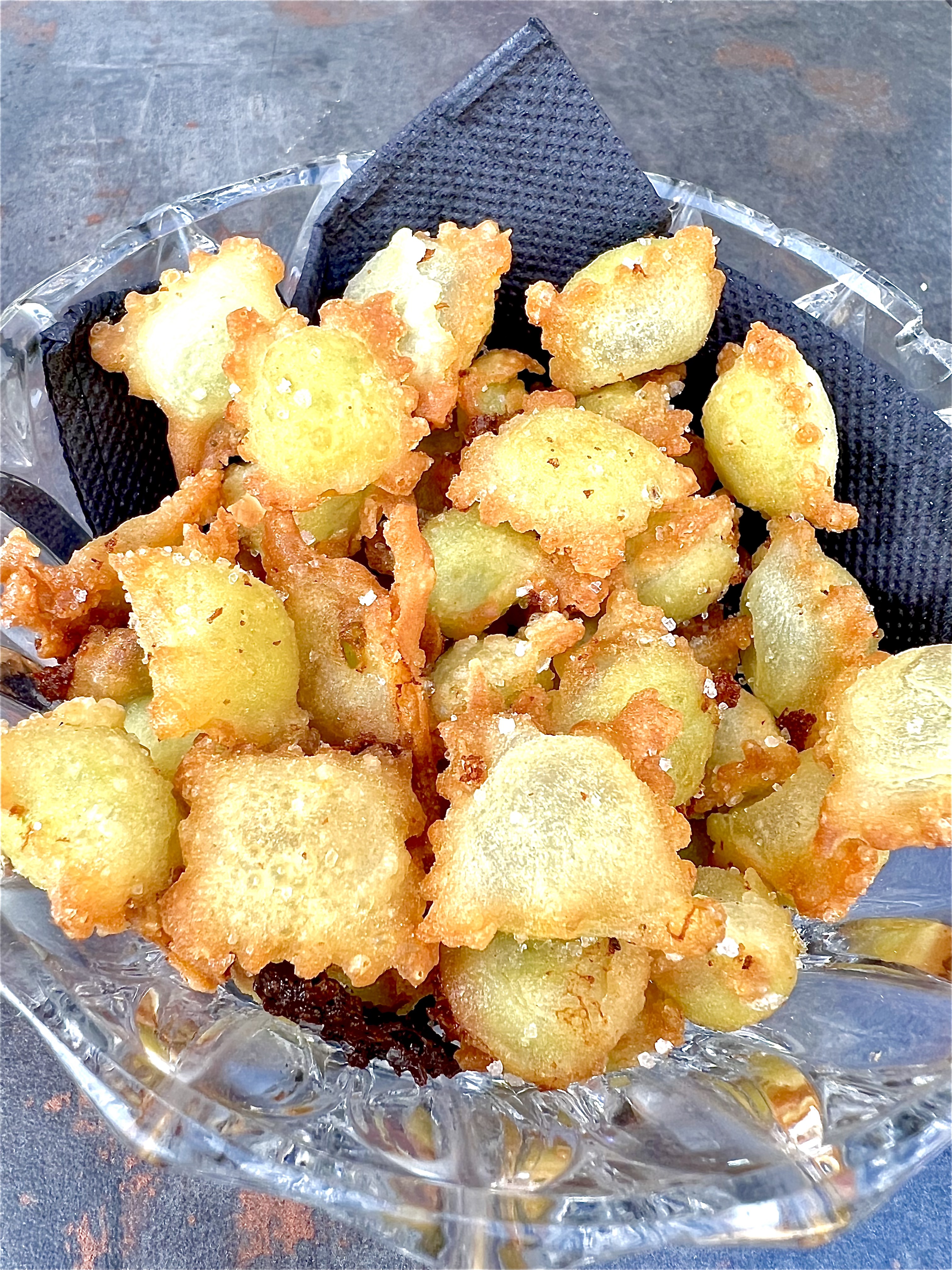Rissoles au fromage, citron vert, comme des petites ravioles de Royan, mais frites, elles sont ludiques, joyeuses de leur belle croustille et se picorent avec allégresse.