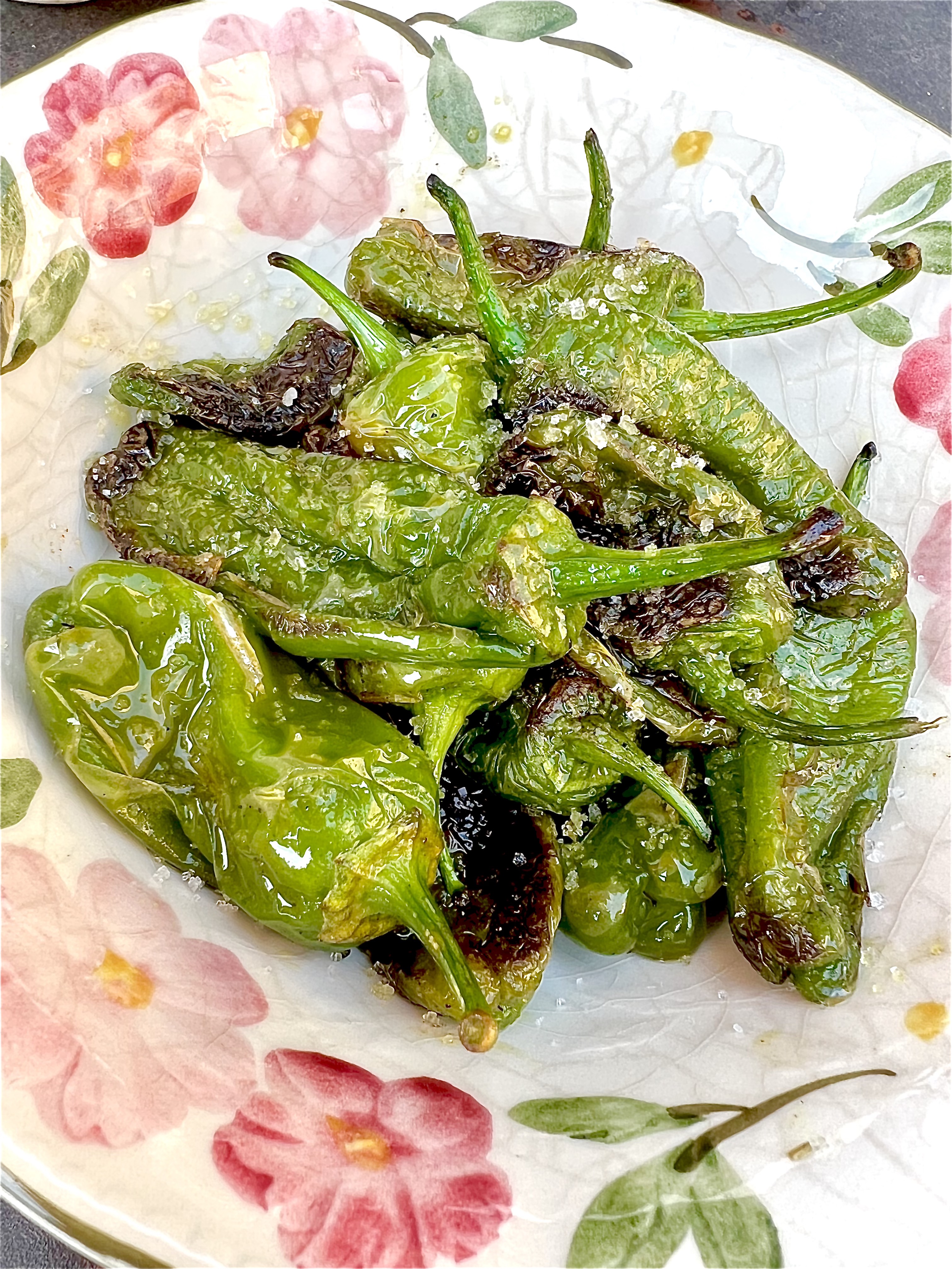 Les Piments de Padrón sautés : ce petit piment vert, qui se grignote sans compter, a la douce identité d’un poivron grillé d’une changeante intensité.