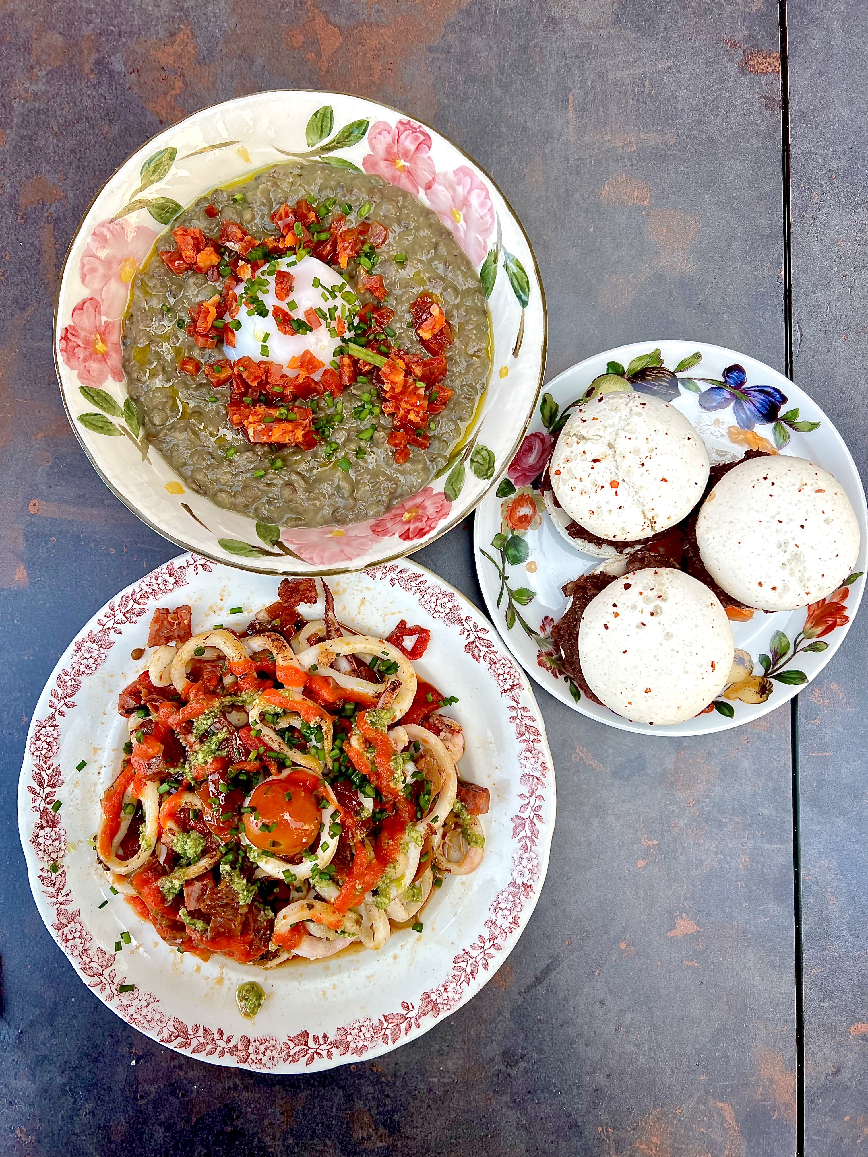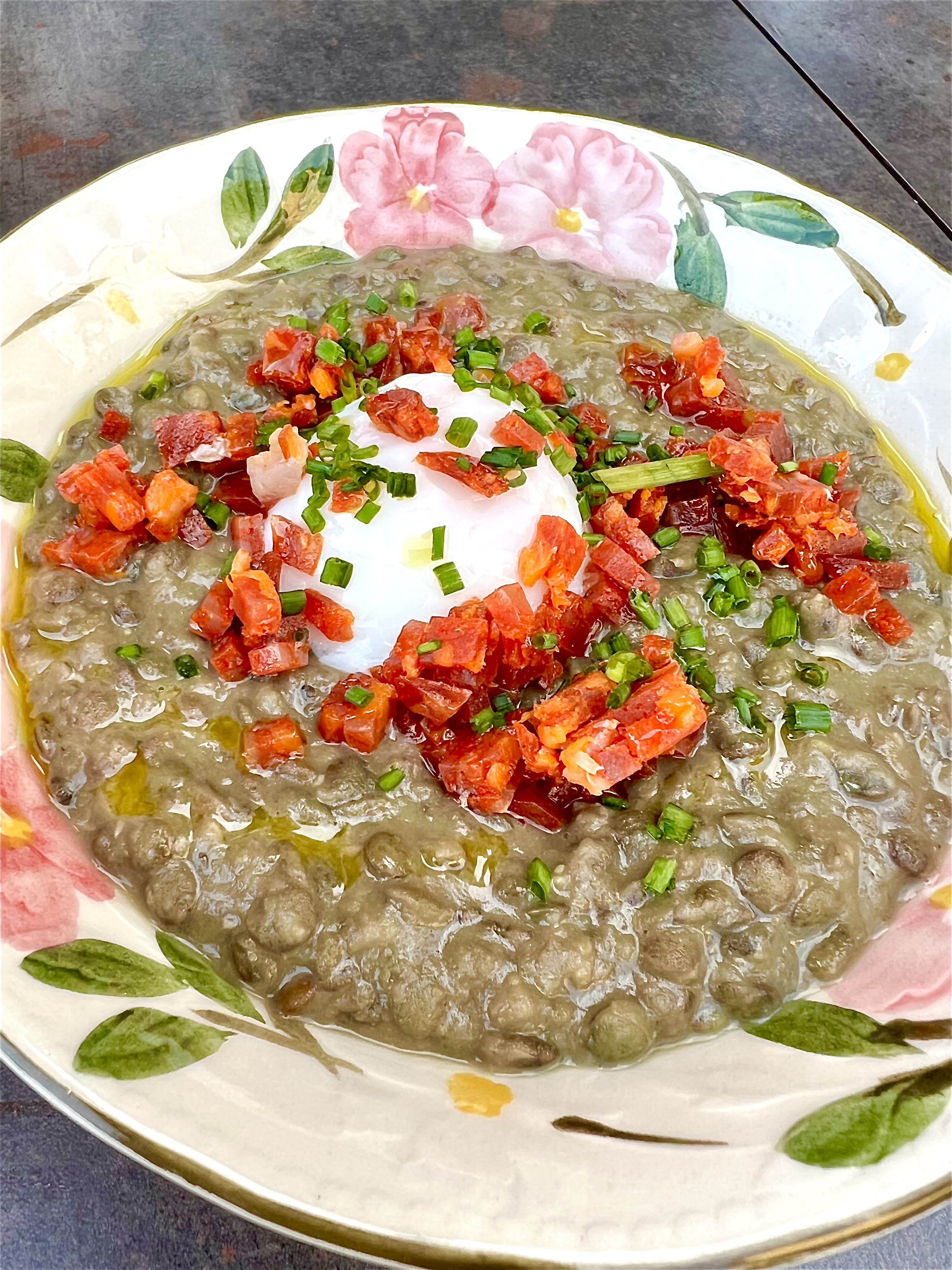 Lentilles, chorizo et œuf parfait : il fait froid, il fait triste, c’est l’hiver eh bien les lentilles sont là pour vous ! Un tiercé ultra gagnant et joyeux, des lentilles « cassées » en presque purée au goût bien terrien, un chorizo qui donne de sa piquante personne et un œuf qui s’épanche avec ardeur de sa perfection. C’est absolument réconfortant et rassurant.
