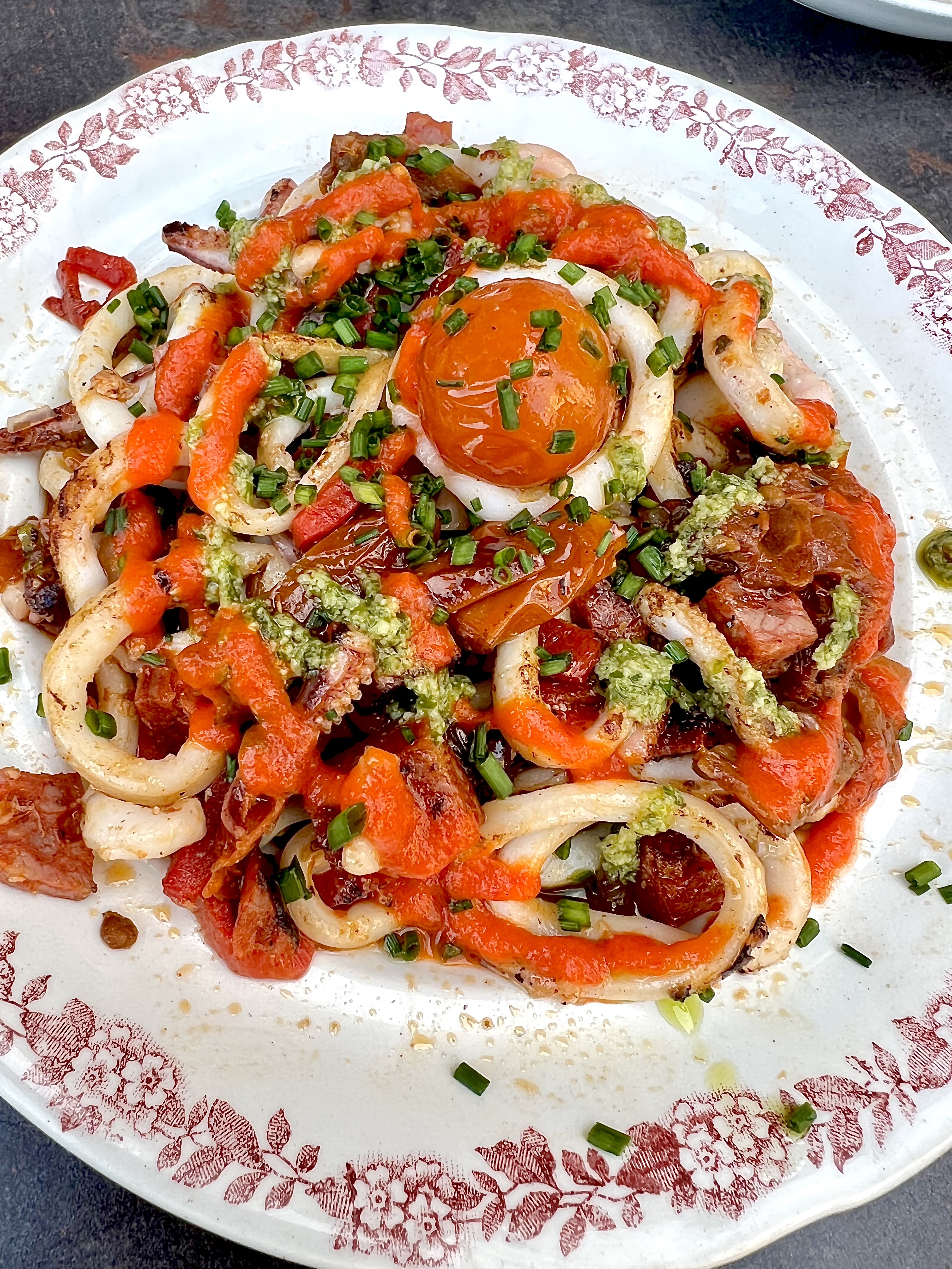 Les Encornets à la plancha, chorizo d’E. Ospital ont la ferveur d’un brillant terre-mer bien balancé qui stimule l’envie d’y retourner à chaque bouchée.