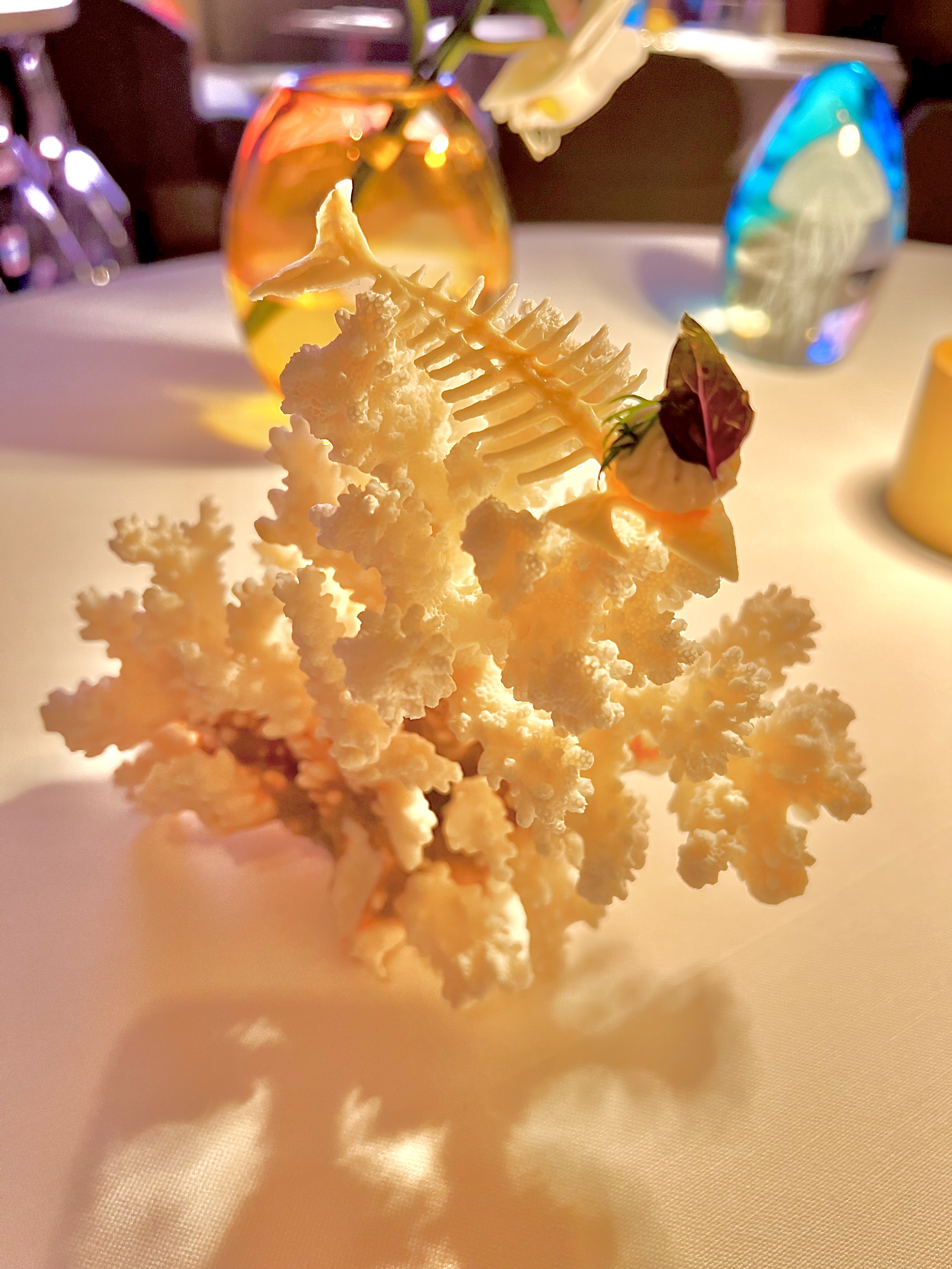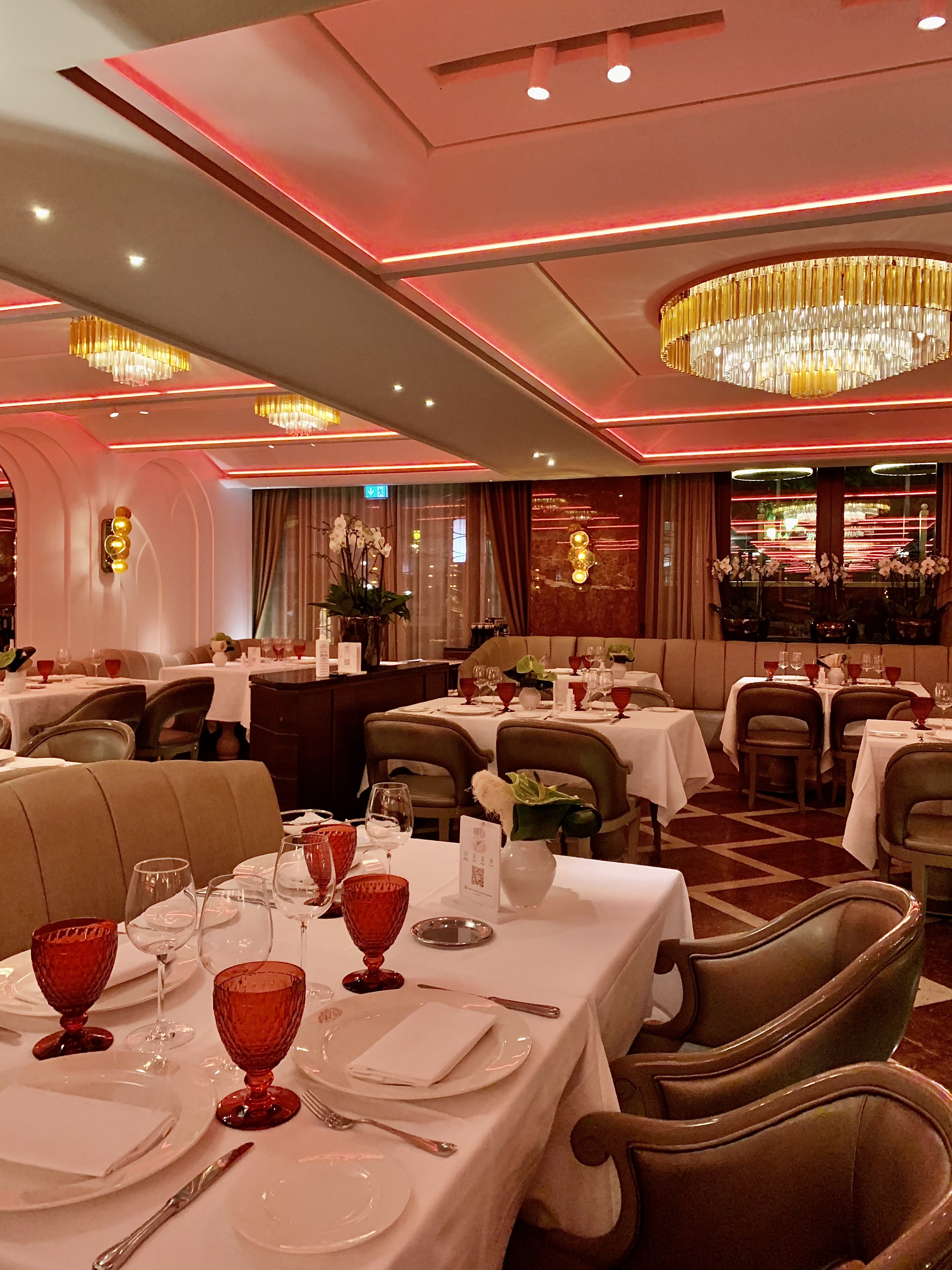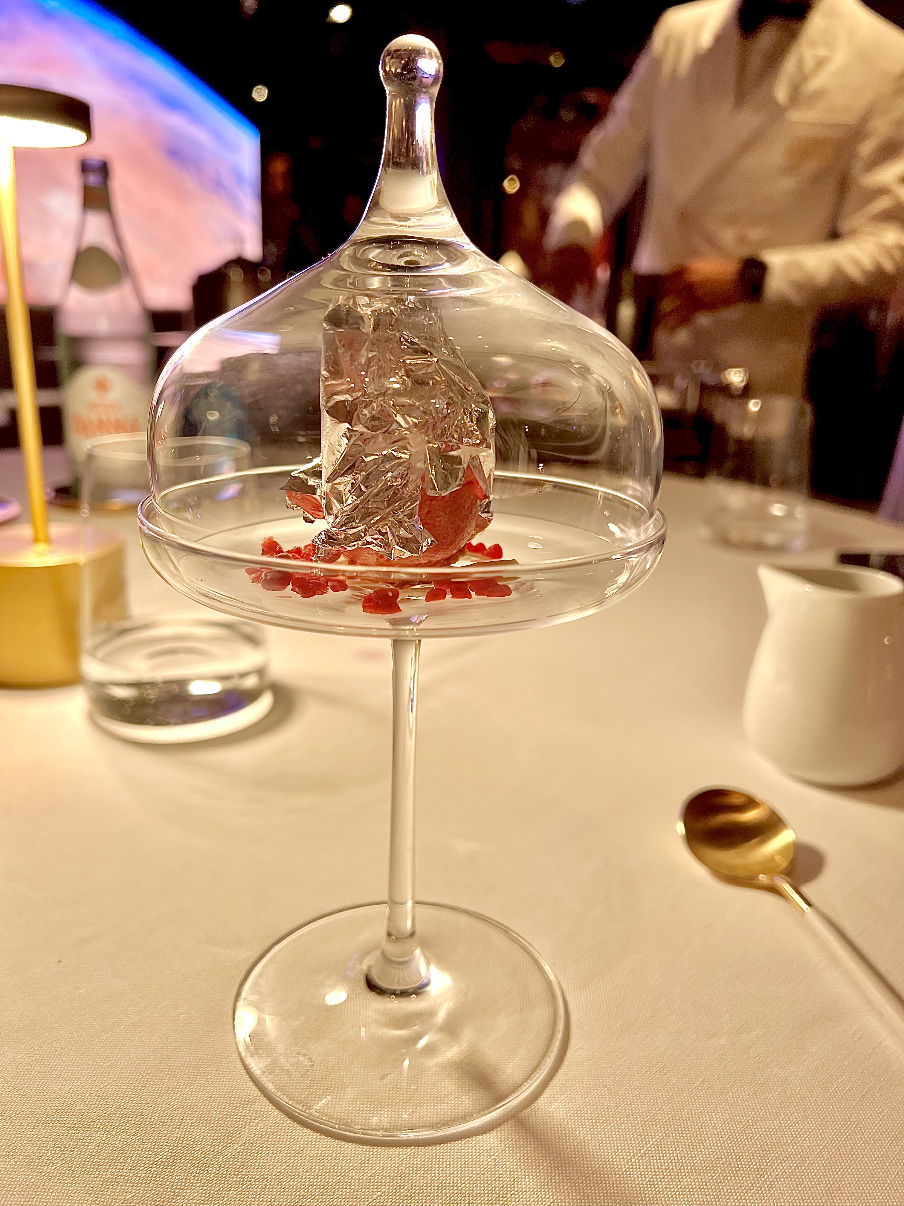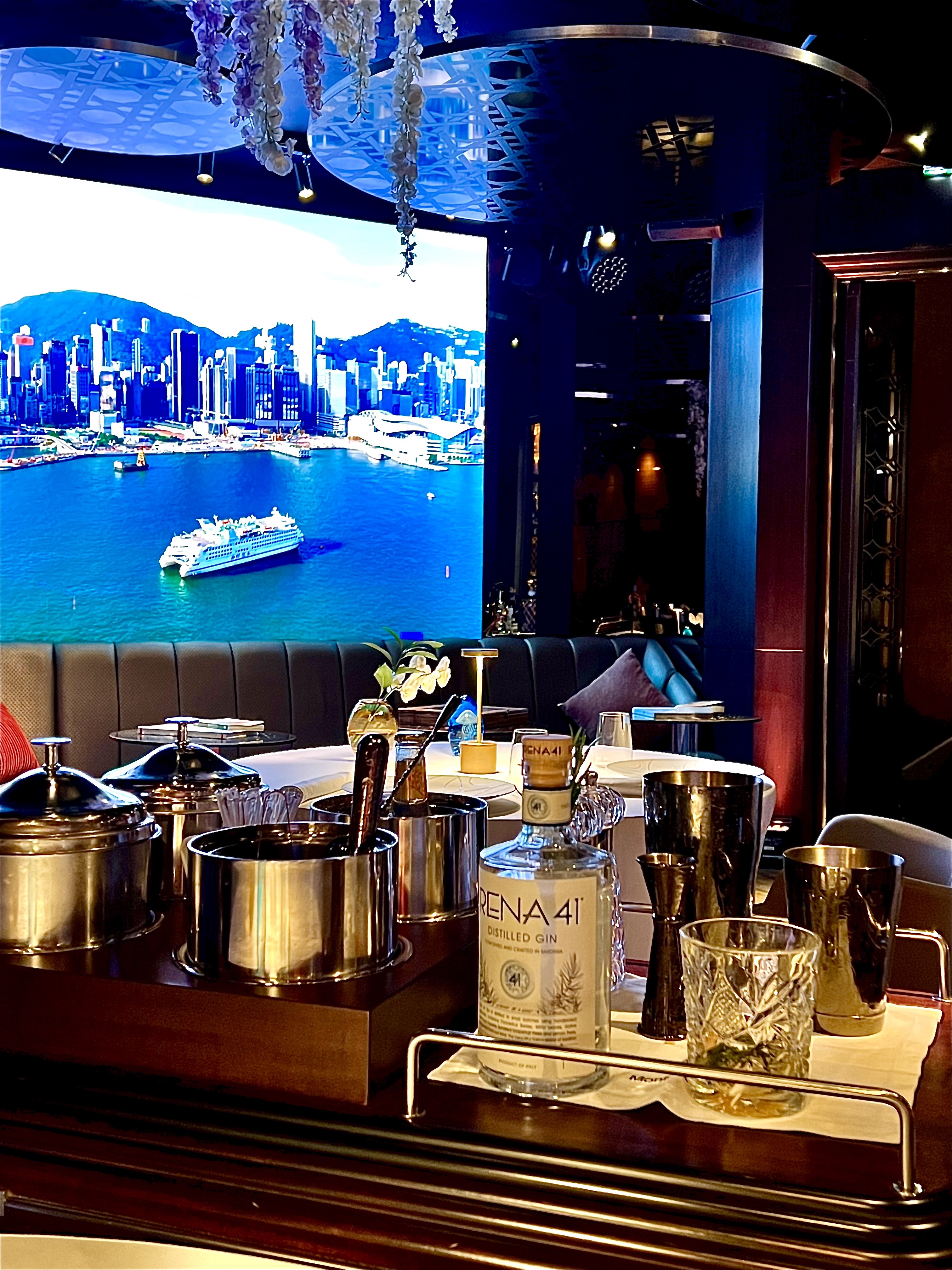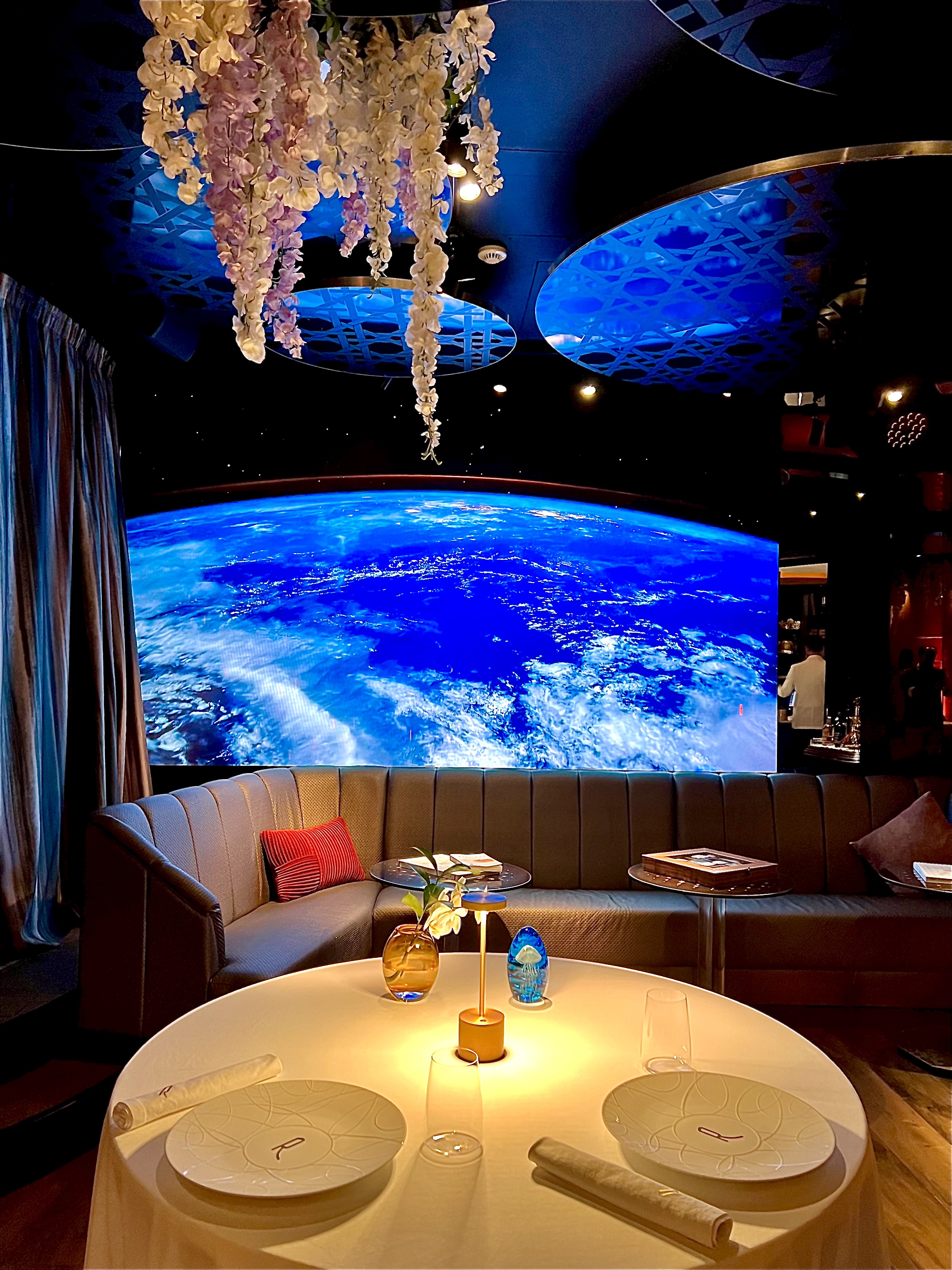 La salle, aux murs laqués en bois de bananiers gardant secrètement 140 coffres (à ouverture digitale) emplis de cigares ou de bouteilles de vin d’exception pour les clients habitués et membres du « Cigar Club », est un véritable écrin à l’univers onirique d’un voyage dans l’espace ou à 20 000 lieux sous les mers. Les tables dressées au raffinement extrême des arts de la table, en intimité d’une lumière tamisée et diffuse, vous invitent à vivre un moment unique et chic. Un immense écran, tel un hublot ouvert sur l’univers, vous fait voyager au long cours, sous les océans, dans les airs ou dans l’espace… les images de la subjuguante vue de la terre ou d’une baleine dansant en majesté dans les eaux nuit-marine à la lenteur relaxante vous accompagnent en douceur et discrétion tout au long de votre mémorable expérience sensorielle et gustative.